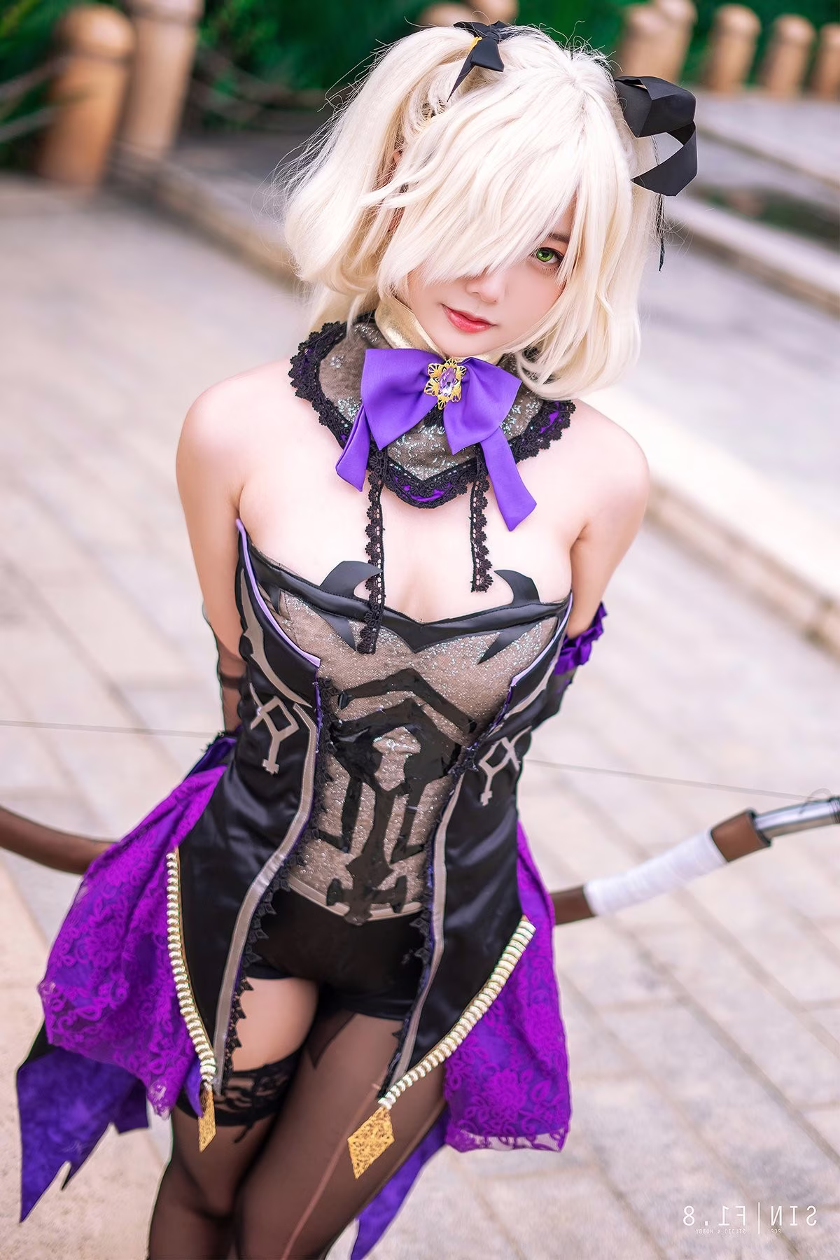 Witness the impressive transformation of Coser Messie Huang as Fischl from Genshin Impact. This image showcases a meticulously crafted purple and black costume, faithfully recreating the Prinzessin der Verurteilung. Messie Huang perfectly captures Fischl's mysterious and powerful aura through her pose especially with her hand raised as if summoning Electro energy. Her golden blonde hair and intricate accessories complete the enchanting and enigmatic look. The detailed craftsmanship of the outfit and the expressive portrayal bring Fischl to life as if stepping directly out of Teyvat. Viewers will be mesmerized by this creative artistry in cosplay.