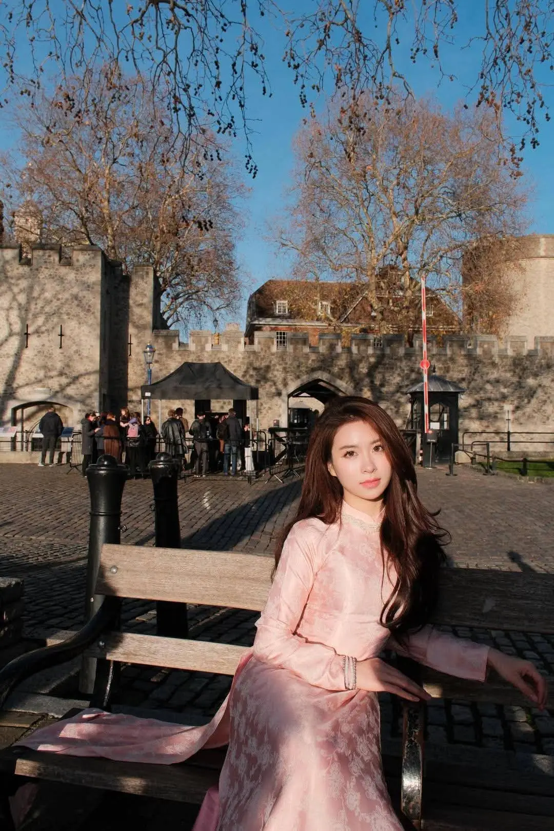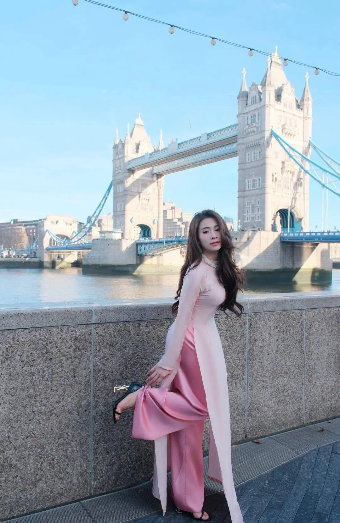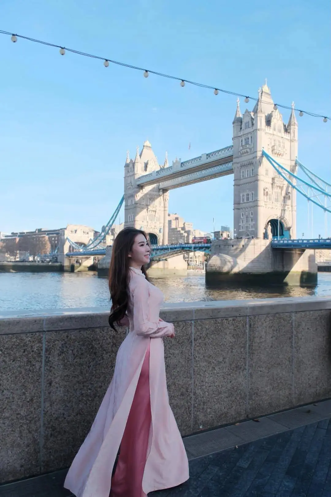 Elegant Pink Ao Dai at London's Tower Bridge: A Cultural Fusion
