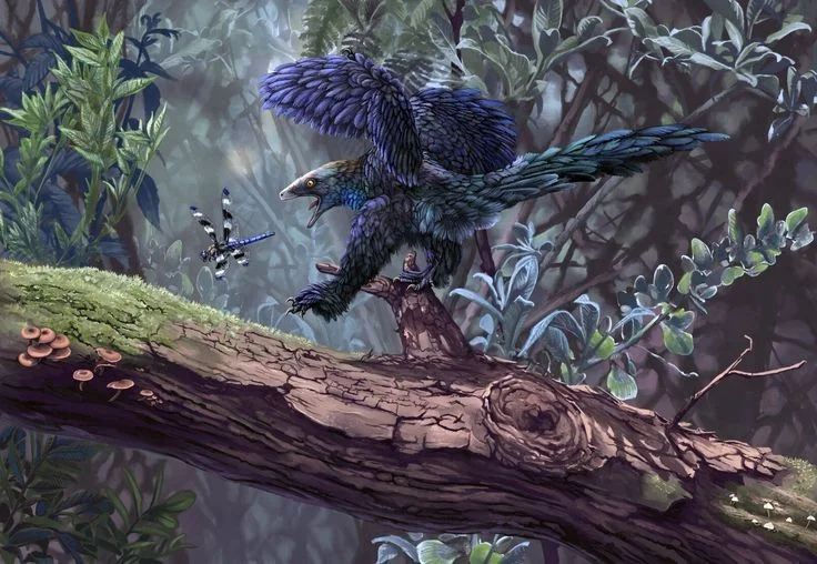 This image reconstructs the Caihong dinosaur with its vibrant, azure and green plumage, standing out in the lush forest. It serves as vivid evidence of early feathered dinosaurs, showcasing the incredible color diversity in the ancient world. With their unique feather structure, they not only helped retain warmth but also played a crucial role in communication and attracting mates. This discovery from the Cretaceous period in China has transformed our understanding of dinosaur-to-bird evolution, revealing a small and agile dinosaur with beauty beyond imagination.#FeatheredDinosaur #DinosaurEvolution #Caihong #VibrantDinosaur #AncientWorld
