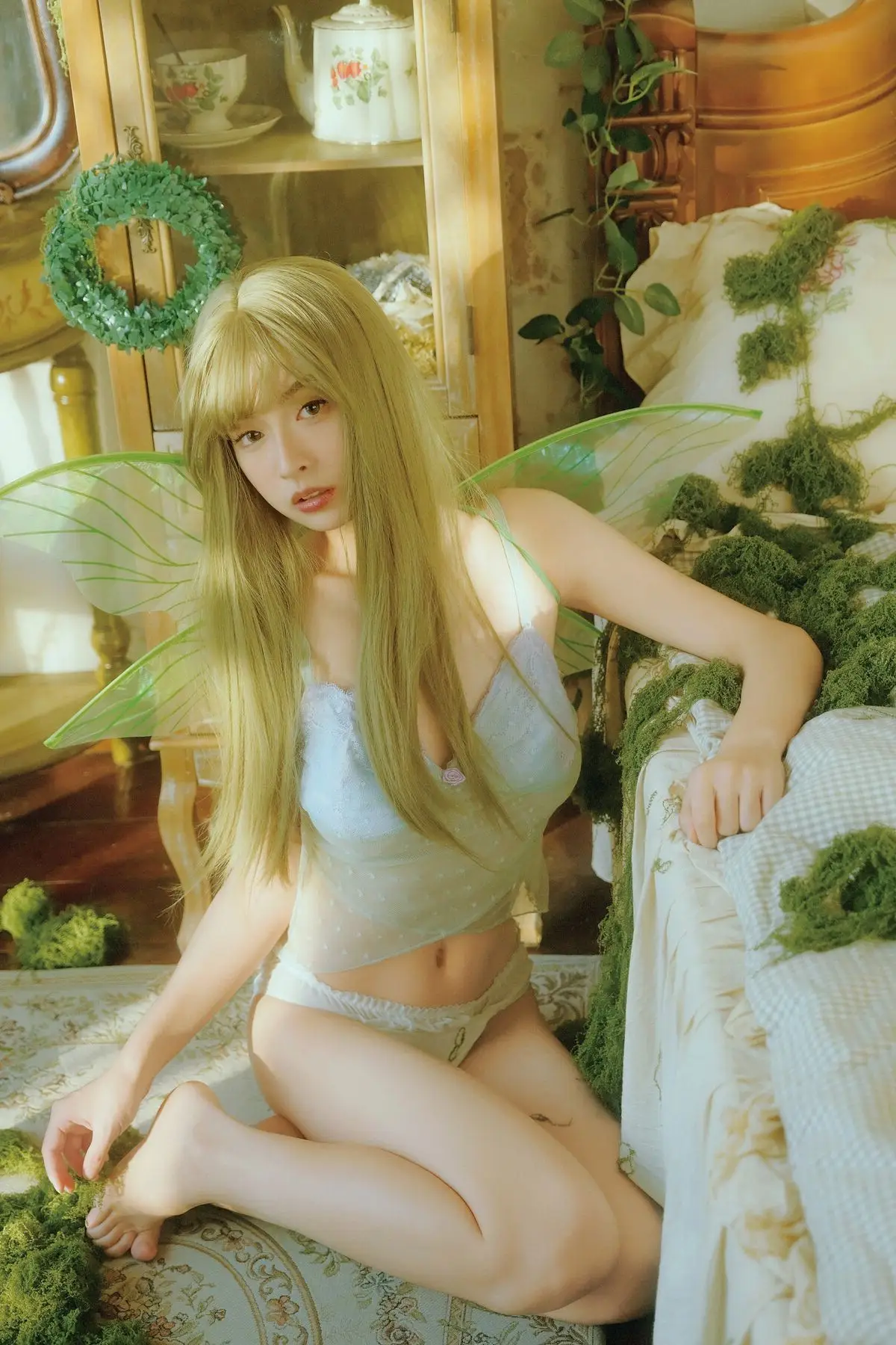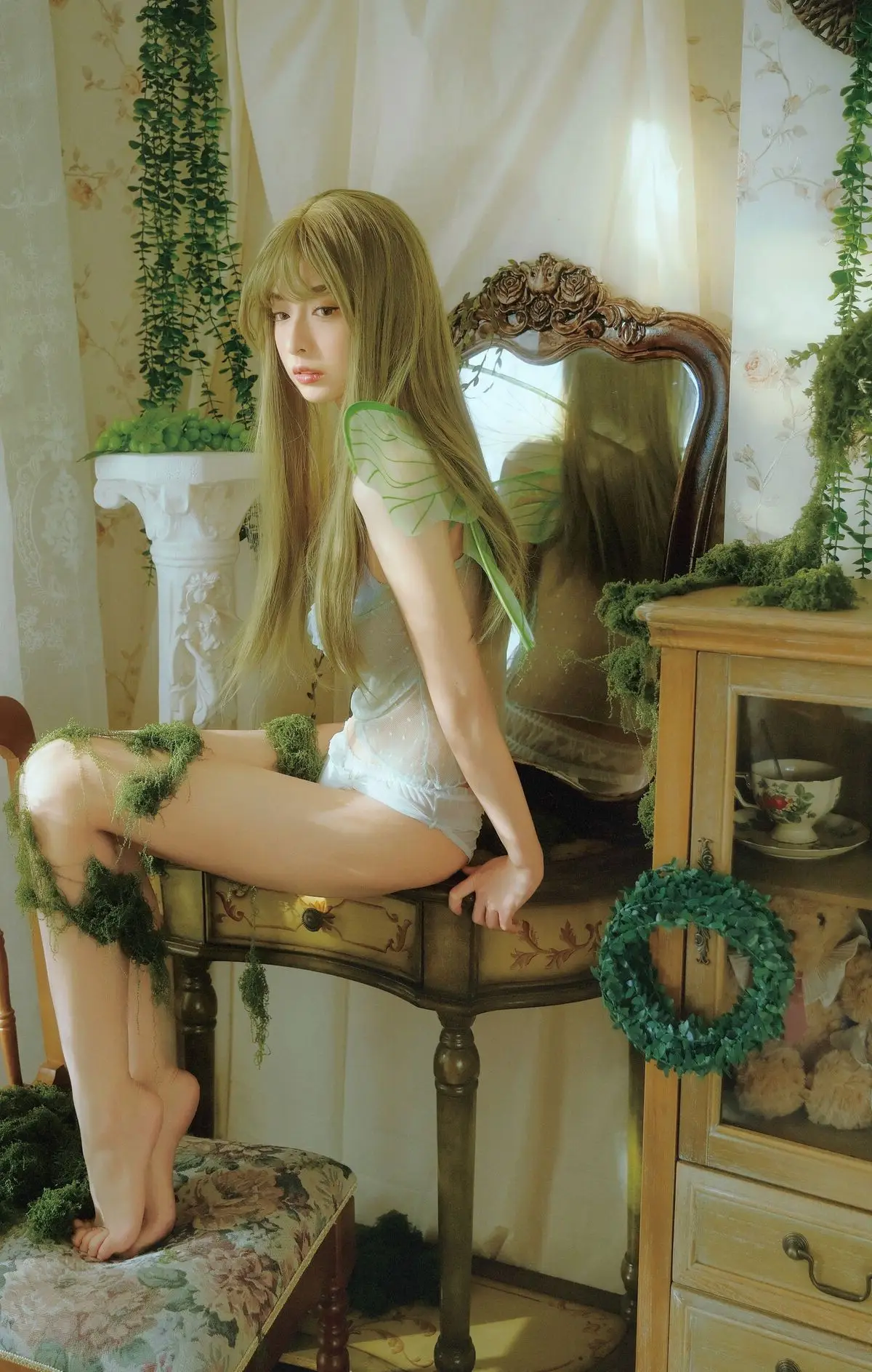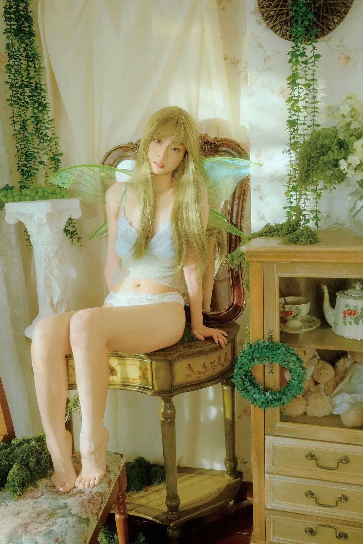 Xiao Man emerges as a captivating fairy in a whimsical garden, adorned with delicate wings and an ethereal aura. She sits gracefully, knees gently drawn, her soft gaze inviting viewers into a tranquil and otherworldly scene. The setting is bathed in the gentle glow of natural light, surrounded by lush greenery, pristine white drapes, and charming rustic decor, all harmonizing to create a dreamlike atmosphere. Xiao Man's pure beauty and serene demeanor, combined with the exquisite artistry of the background, weave a narrative of rebirth and timeless grace. This collection from YiTuYu Vol.8739 offers a mesmerizing escape into a world where peace and natural enchantment intertwine seamlessly.#XiaoMan #YiTuYu #FairyCore #EtherealBeauty #DreamyPhotography
