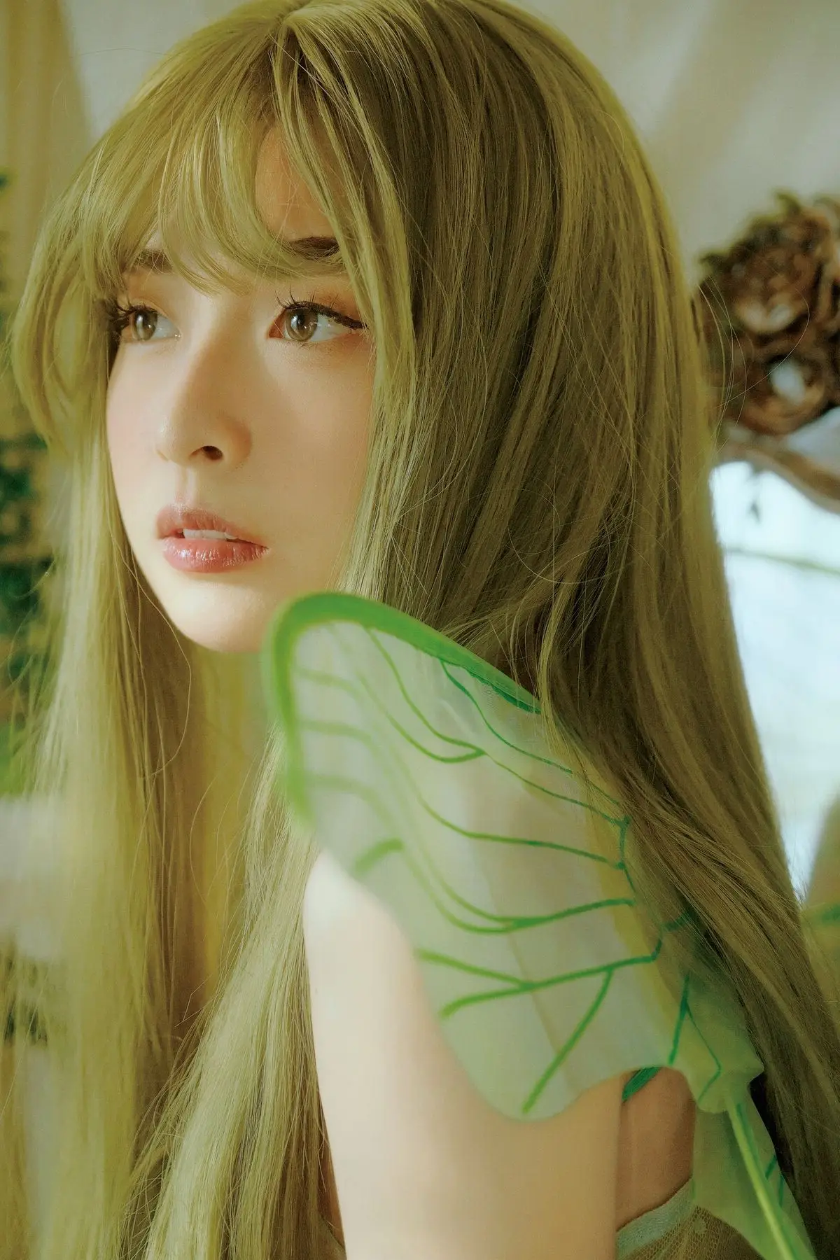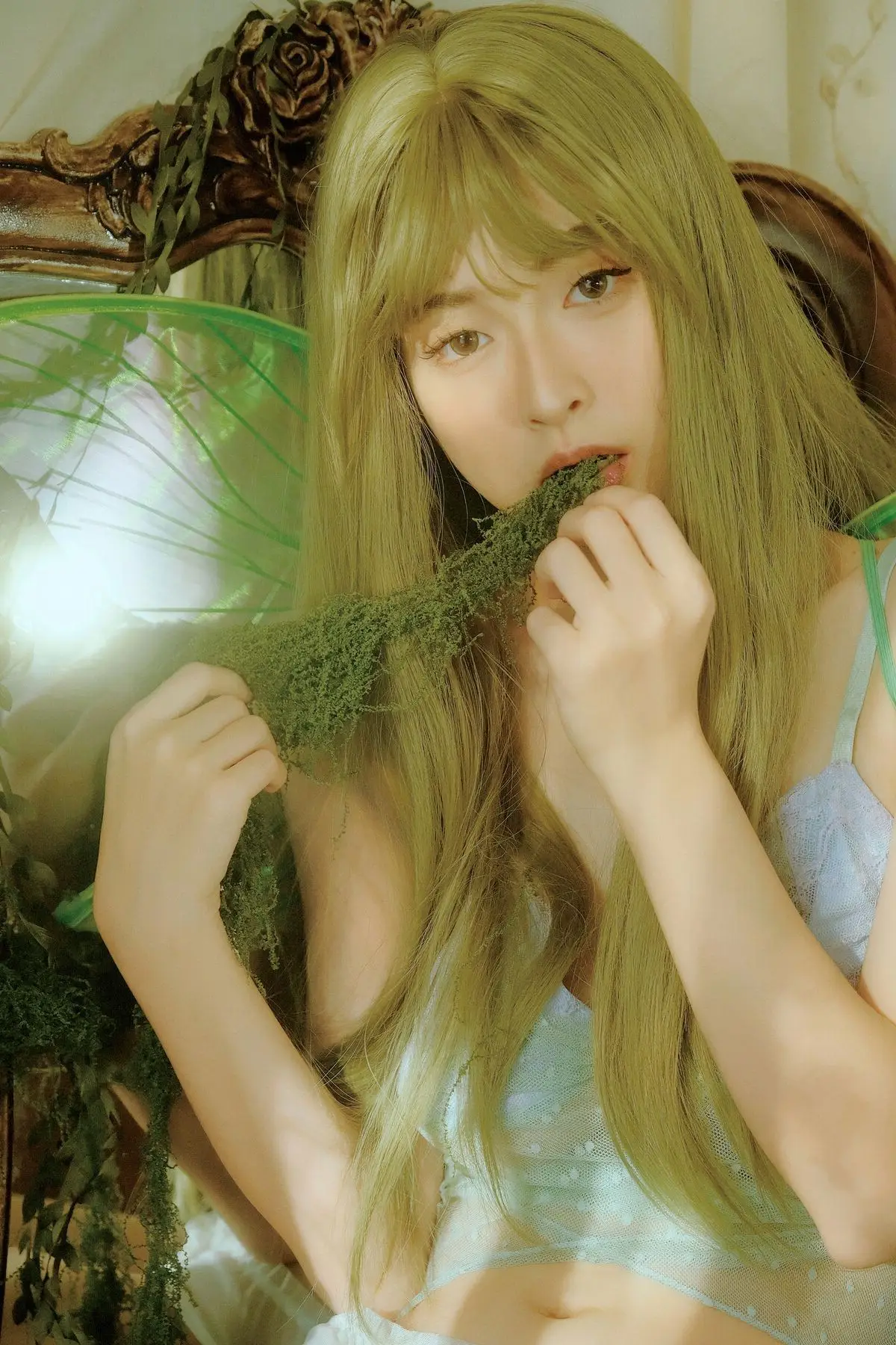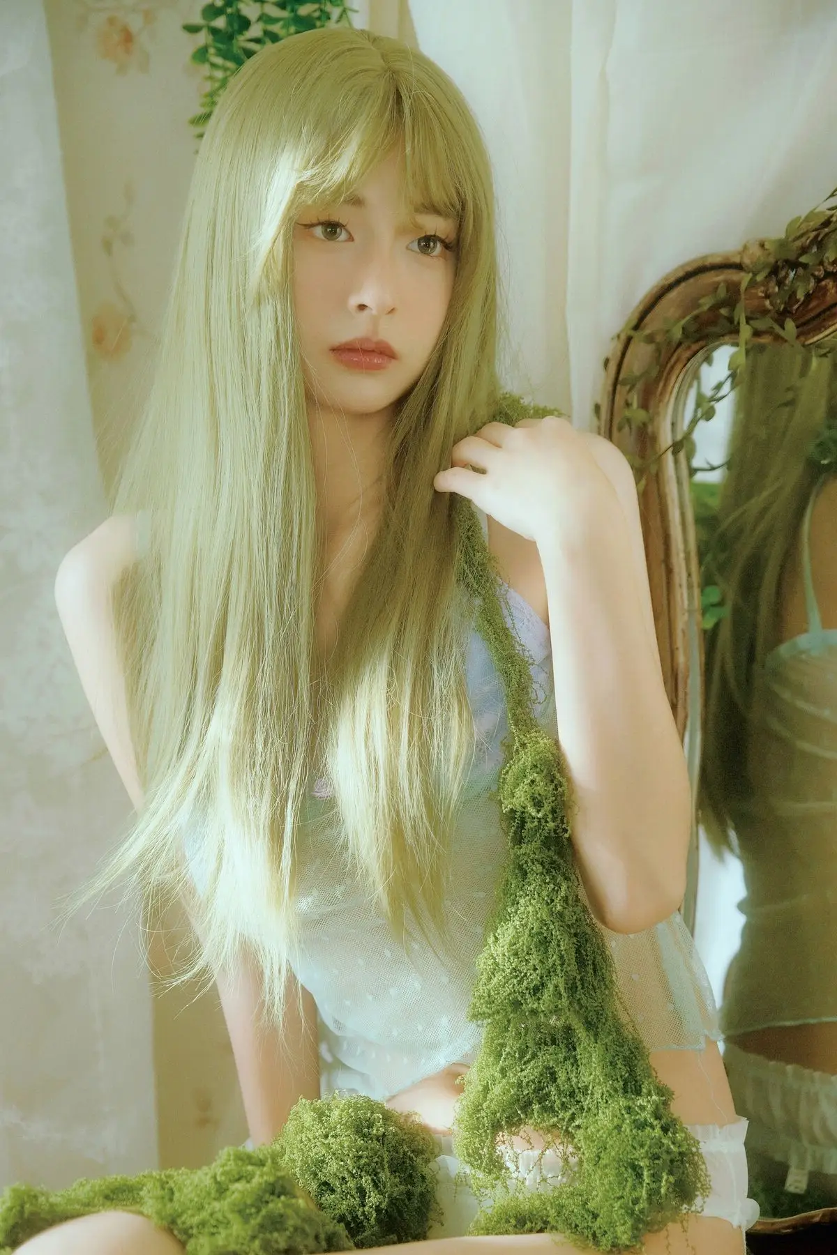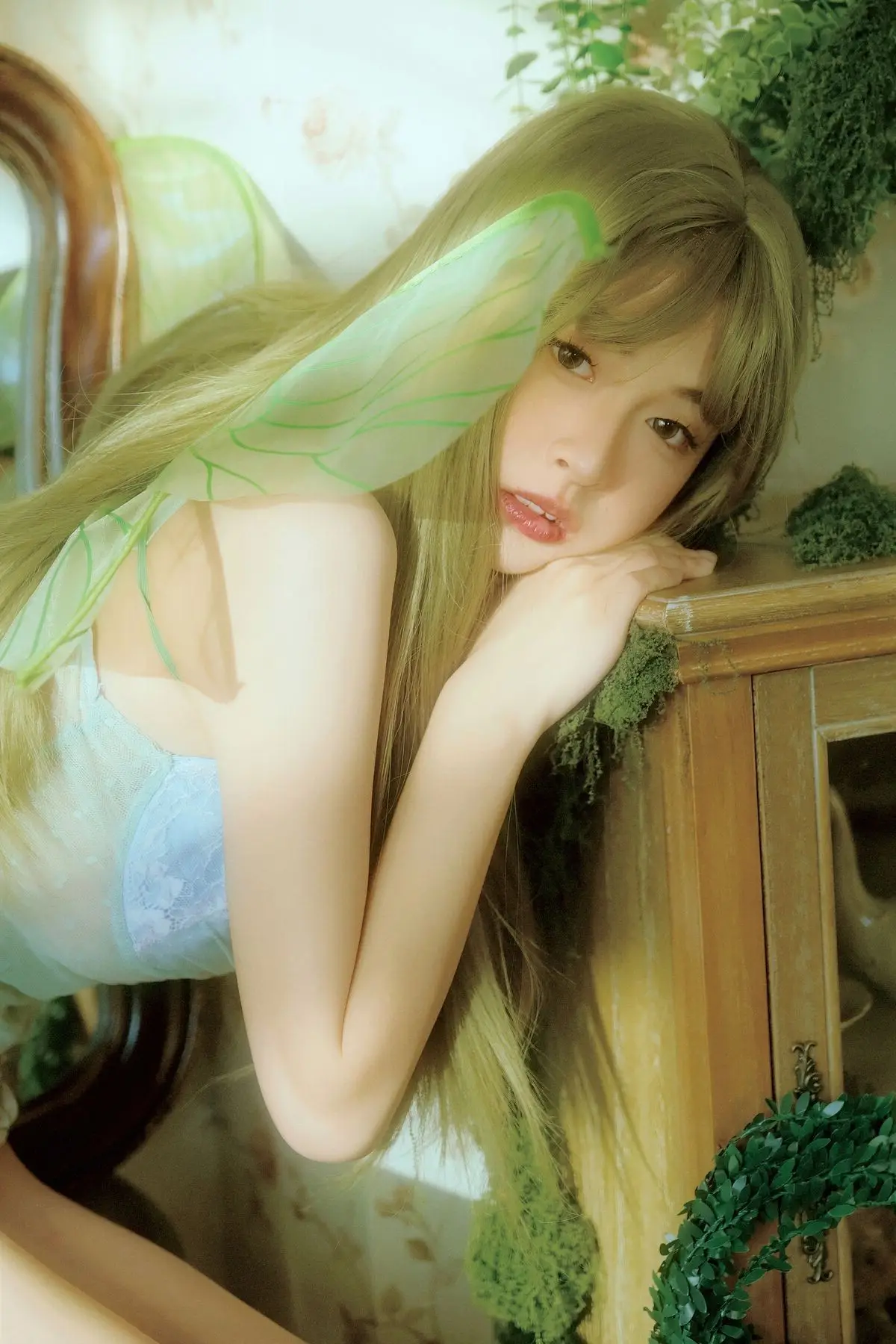 Xiao Man emerges as a captivating fairy in a whimsical garden, adorned with delicate wings and an ethereal aura. She sits gracefully, knees gently drawn, her soft gaze inviting viewers into a tranquil and otherworldly scene. The setting is bathed in the gentle glow of natural light, surrounded by lush greenery, pristine white drapes, and charming rustic decor, all harmonizing to create a dreamlike atmosphere. Xiao Man's pure beauty and serene demeanor, combined with the exquisite artistry of the background, weave a narrative of rebirth and timeless grace. This collection from YiTuYu Vol.8739 offers a mesmerizing escape into a world where peace and natural enchantment intertwine seamlessly.#XiaoMan #YiTuYu #FairyCore #EtherealBeauty #DreamyPhotography