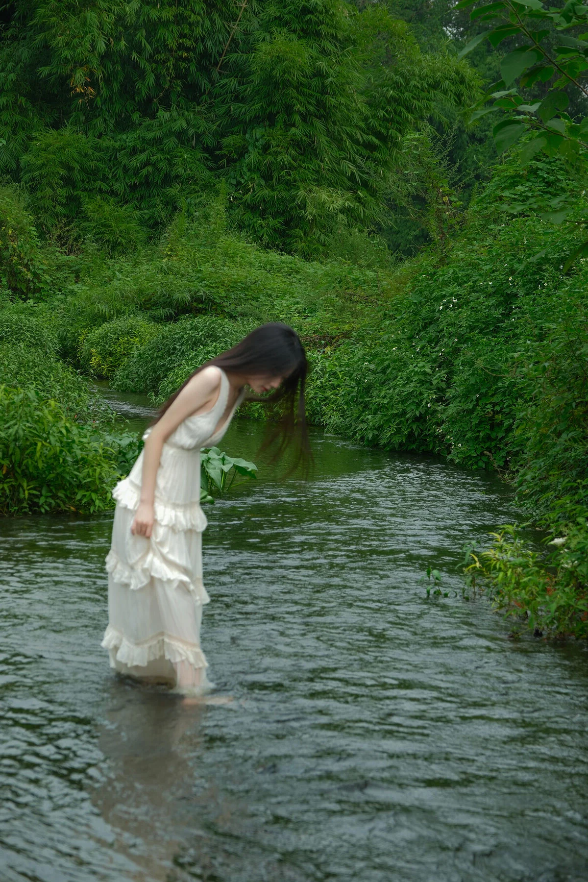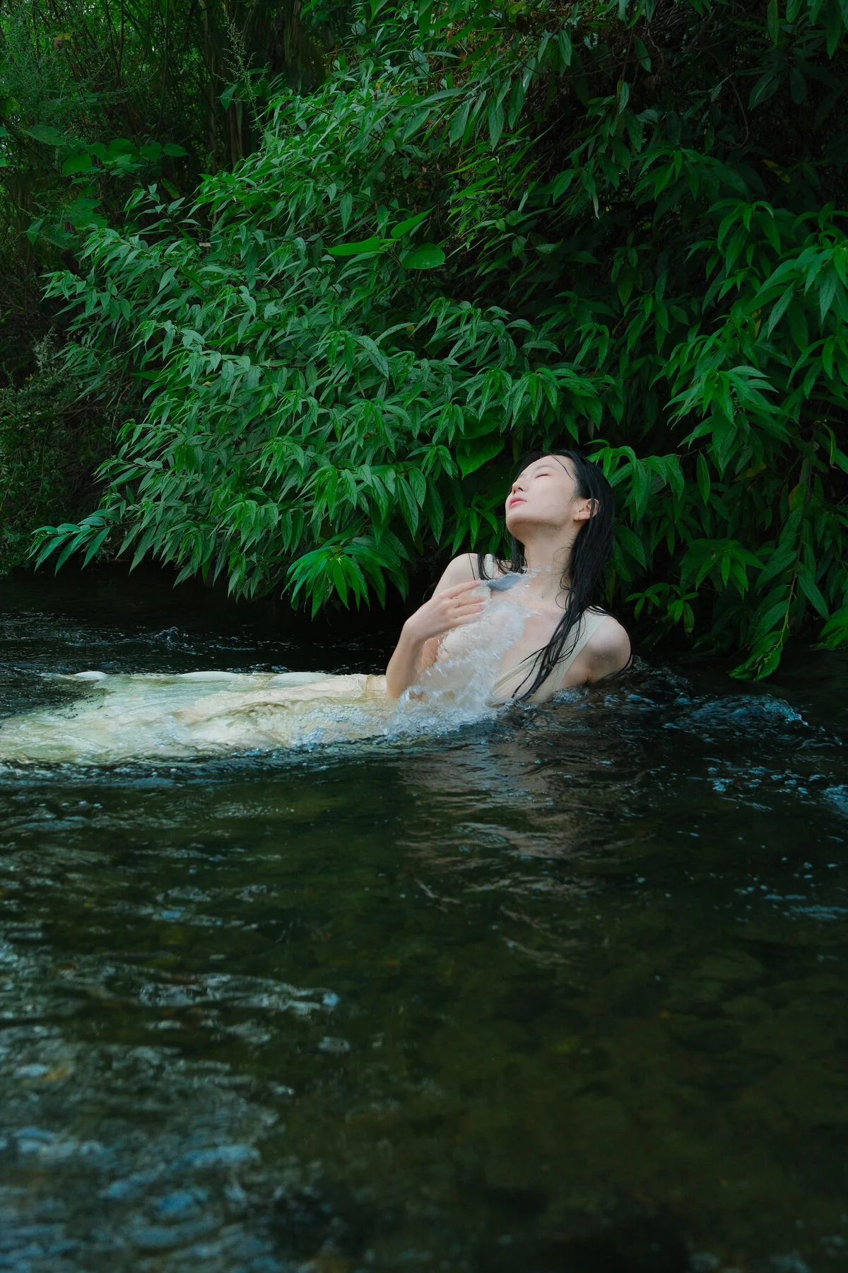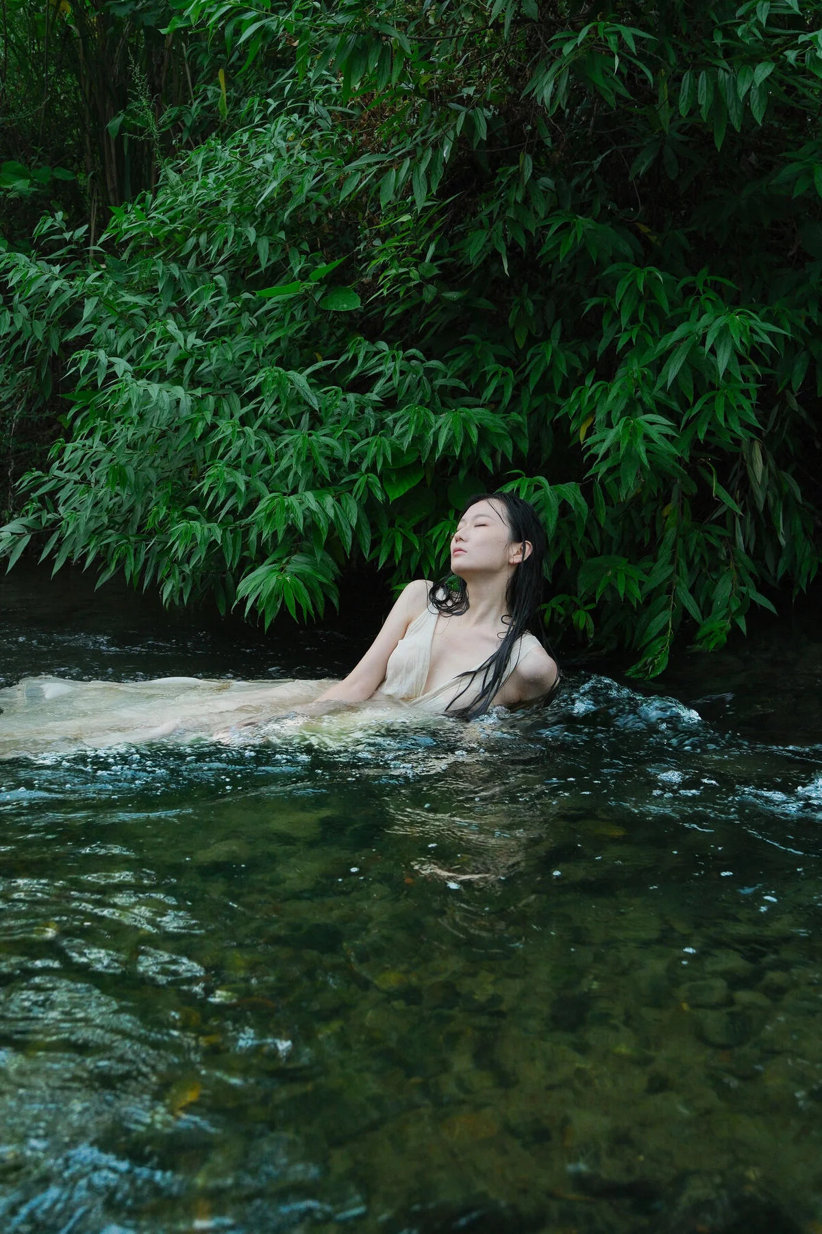 This visual masterpiece captures a moment of pure serenity, where model Yang transforms into an ethereal muse amidst a lush green sanctuary. The composition is a poetic blend of soft textures and natural elements, featuring a delicate cream dress that flows as naturally as the water itself. As she immerses herself in the cool stream, the damp fabric clings gracefully, highlighting a sophisticated aesthetic that bridges the gap between fashion and fine art. The backdrop of vibrant foliage provides a rich emerald contrast to her porcelain skin and the minimalist palette of her attire. Her pose, with eyes softly closed and head tilted toward the light, evokes a sense of profound peace and a deep connection with the environment. It feels like a scene from a flowing dream, where every detail from the gentle ripples in the water to the subtle play of light on her features invites the viewer to pause and breathe. This collection perfectly embodies an artistic spirit, celebrating a beauty that is both simple and hauntingly beautiful.#EtherealAesthetic #NaturePhotography #ArtisticVibe #FashionEditorial #DreamyMood