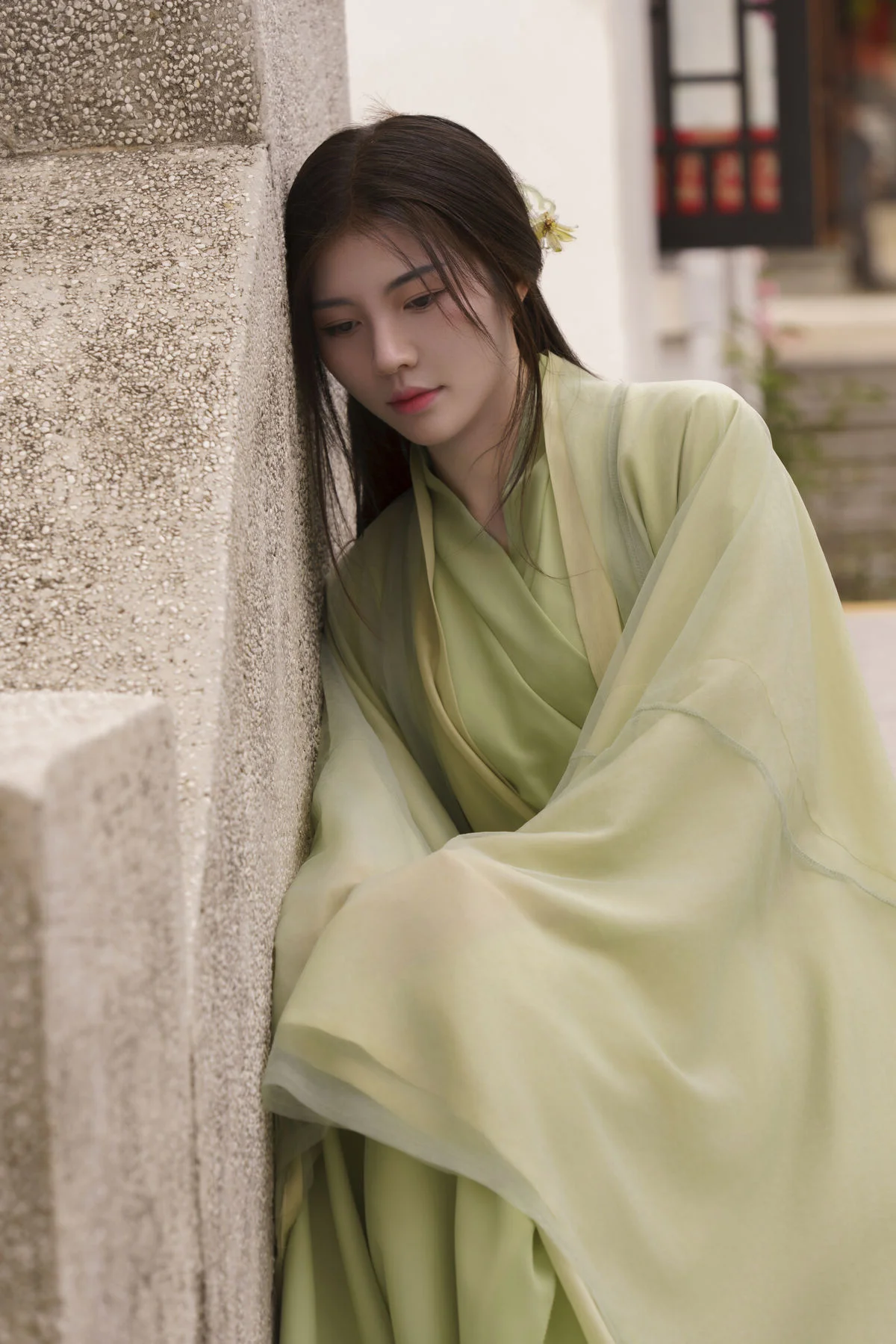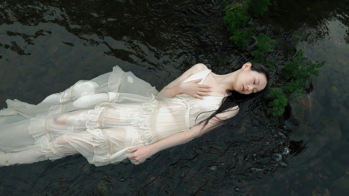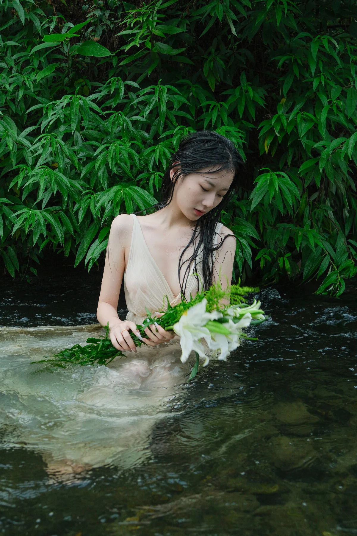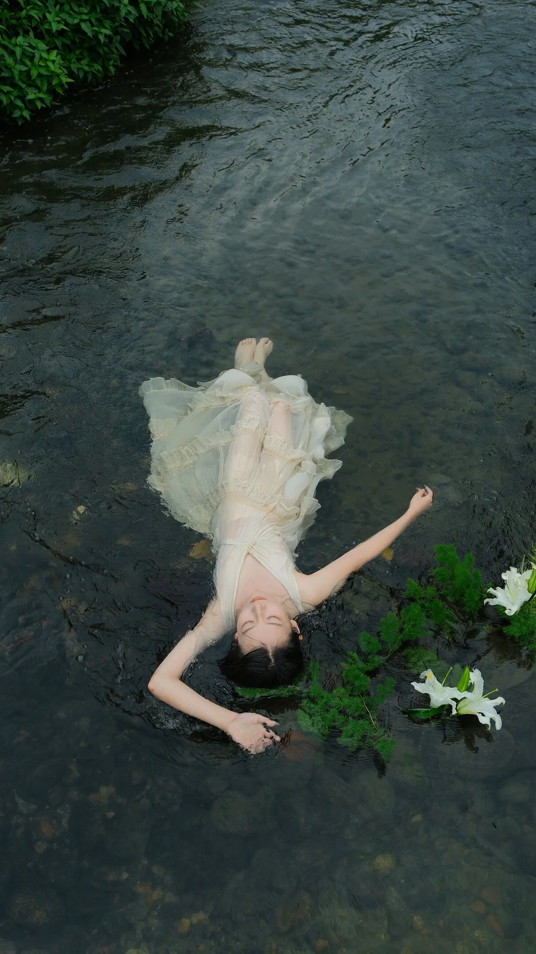 This visual masterpiece captures a moment of pure serenity, where model Yang transforms into an ethereal muse amidst a lush green sanctuary. The composition is a poetic blend of soft textures and natural elements, featuring a delicate cream dress that flows as naturally as the water itself. As she immerses herself in the cool stream, the damp fabric clings gracefully, highlighting a sophisticated aesthetic that bridges the gap between fashion and fine art. The backdrop of vibrant foliage provides a rich emerald contrast to her porcelain skin and the minimalist palette of her attire. Her pose, with eyes softly closed and head tilted toward the light, evokes a sense of profound peace and a deep connection with the environment. It feels like a scene from a flowing dream, where every detail from the gentle ripples in the water to the subtle play of light on her features invites the viewer to pause and breathe. This collection perfectly embodies an artistic spirit, celebrating a beauty that is both simple and hauntingly beautiful.#EtherealAesthetic #NaturePhotography #ArtisticVibe #FashionEditorial #DreamyMood