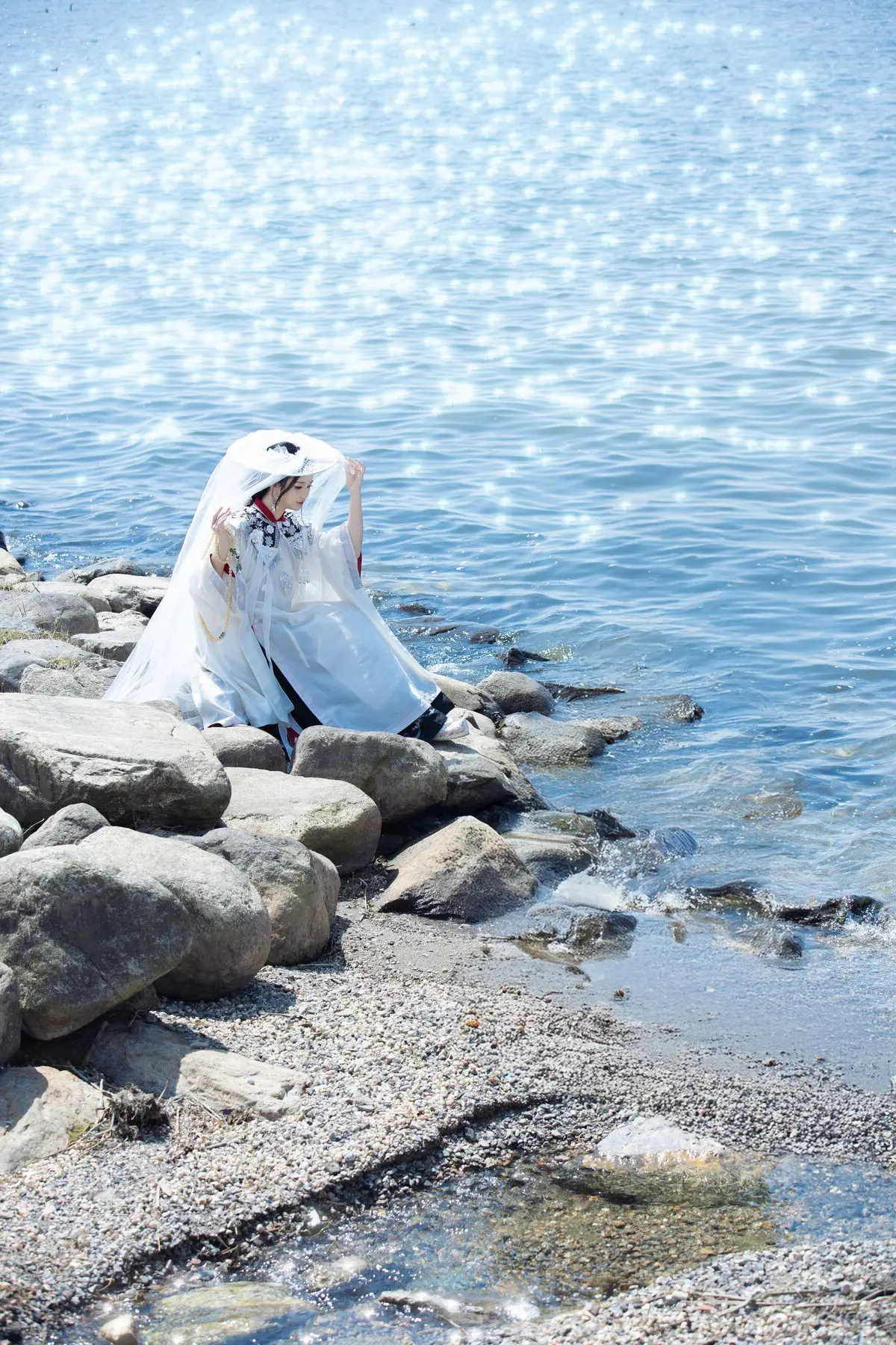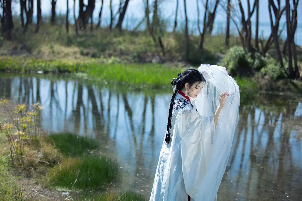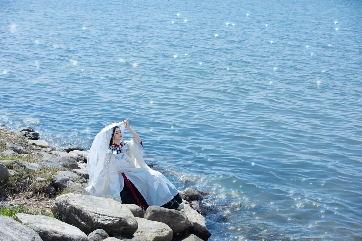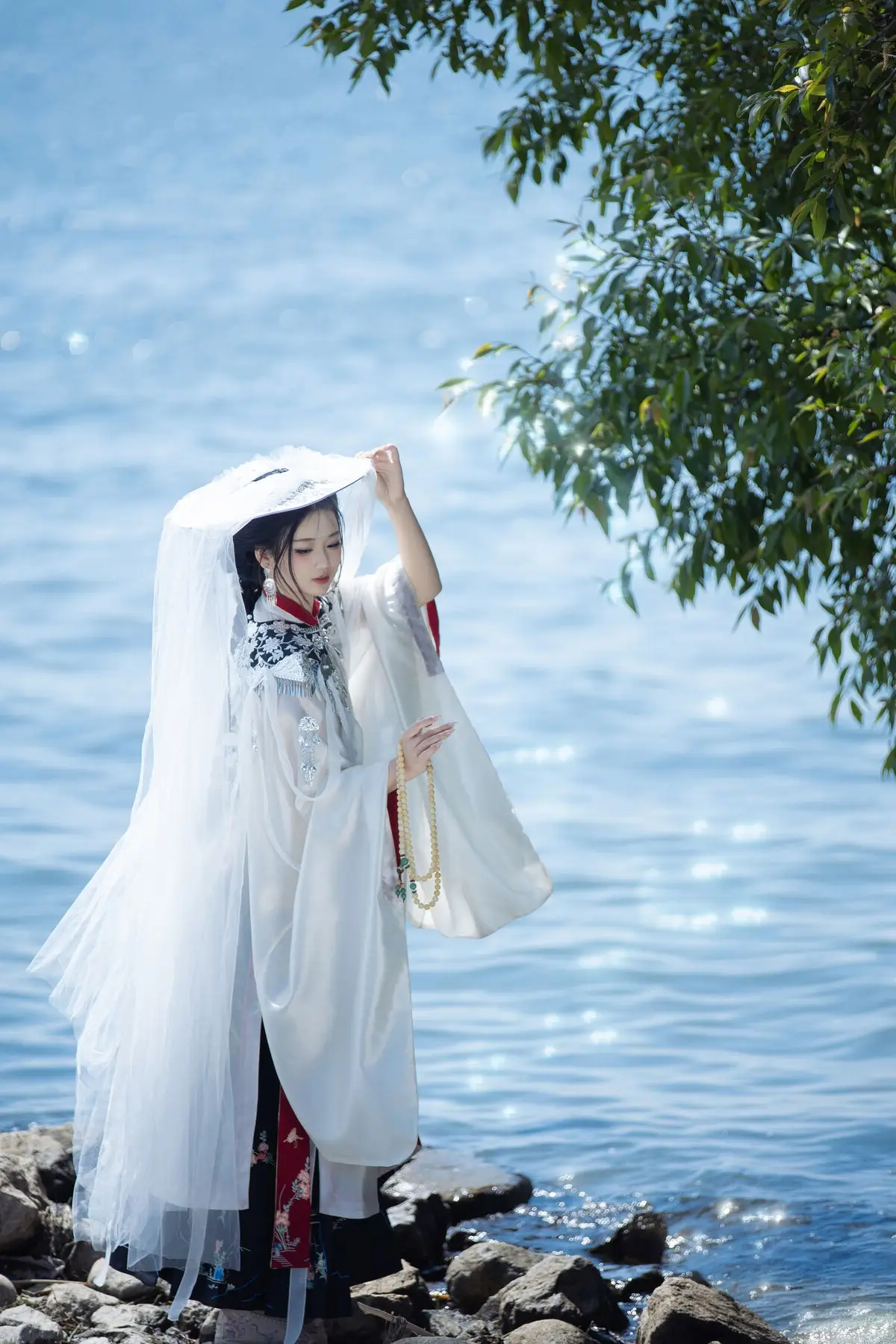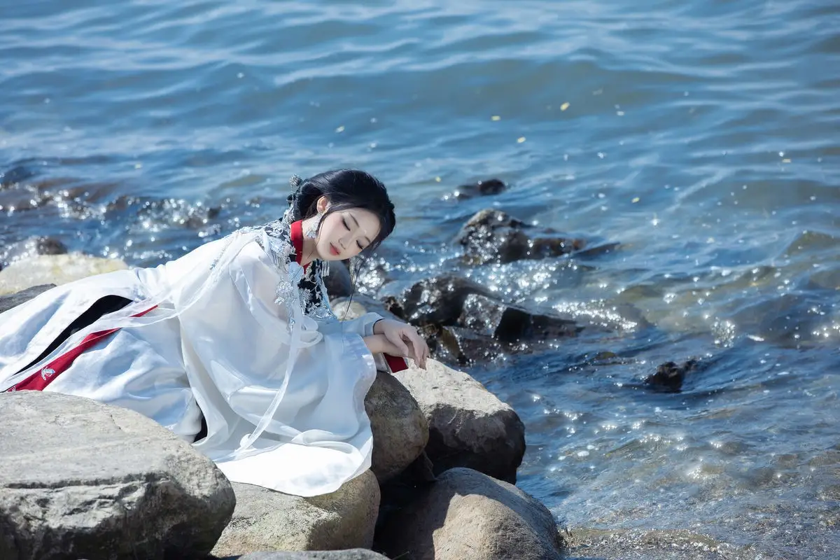 In this YiTuYu Vol.8722 collection, model Wan Jiang Ting embodies an ethereal and graceful beauty beside a crystal-clear stream. Dressed in pristine white traditional attire, adorned with a delicate sheer veil, she presents a poetic and dreamy silhouette. Her gentle sitting pose, with a contemplative gaze towards the flowing water, evokes a sense of serenity and a profound connection to nature. The backdrop of smooth pebbles and clear blue stream water beautifully complements Wan Jiang Ting's delicate and refined charm, transforming each photograph into a captivating piece of visual art that invites viewers to explore its emotional depth.