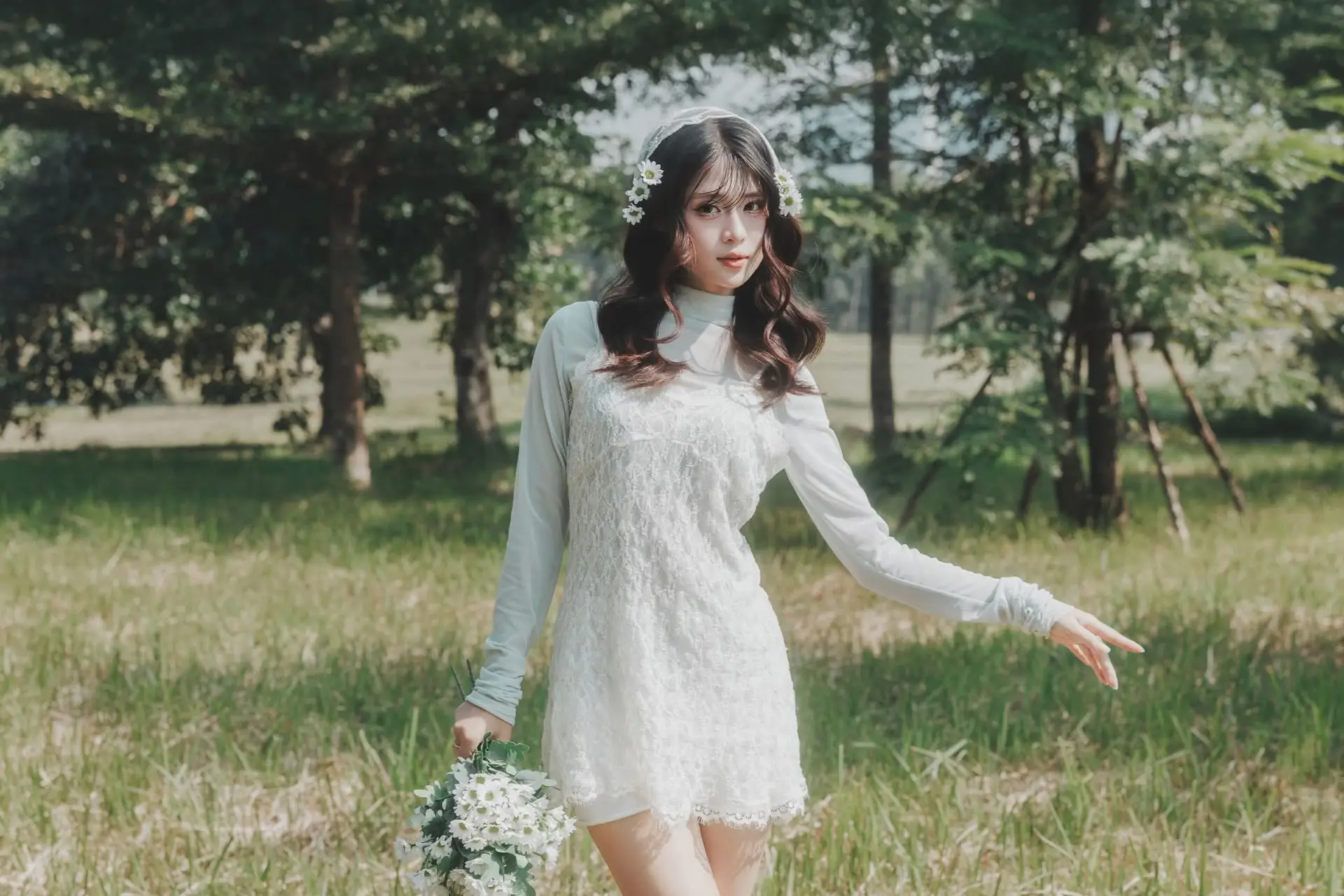 This stunning photo captures a beautiful young woman radiating pure and gentle beauty amidst a lush green natural setting She wears a pristine white lace dress harmoniously paired with a light long-sleeved top adorned with small white daisy flowers in her flowing hair and holding a bouquet in her hand Her dreamy and innocent charm perfectly blends with the soft golden sunlight creating a romantic and poetic scene This image represents the freedom freshness and purity of summer evoking a sense of peace and tranquility a lovely moment of youth and nature in perfect harmony#LaceDressGirl #NaturalBeauty #DaisyFlowers #EtherealStyle #SummerDream