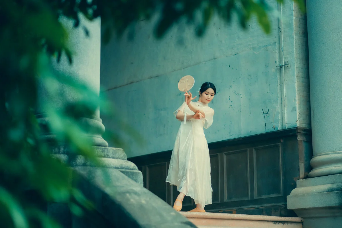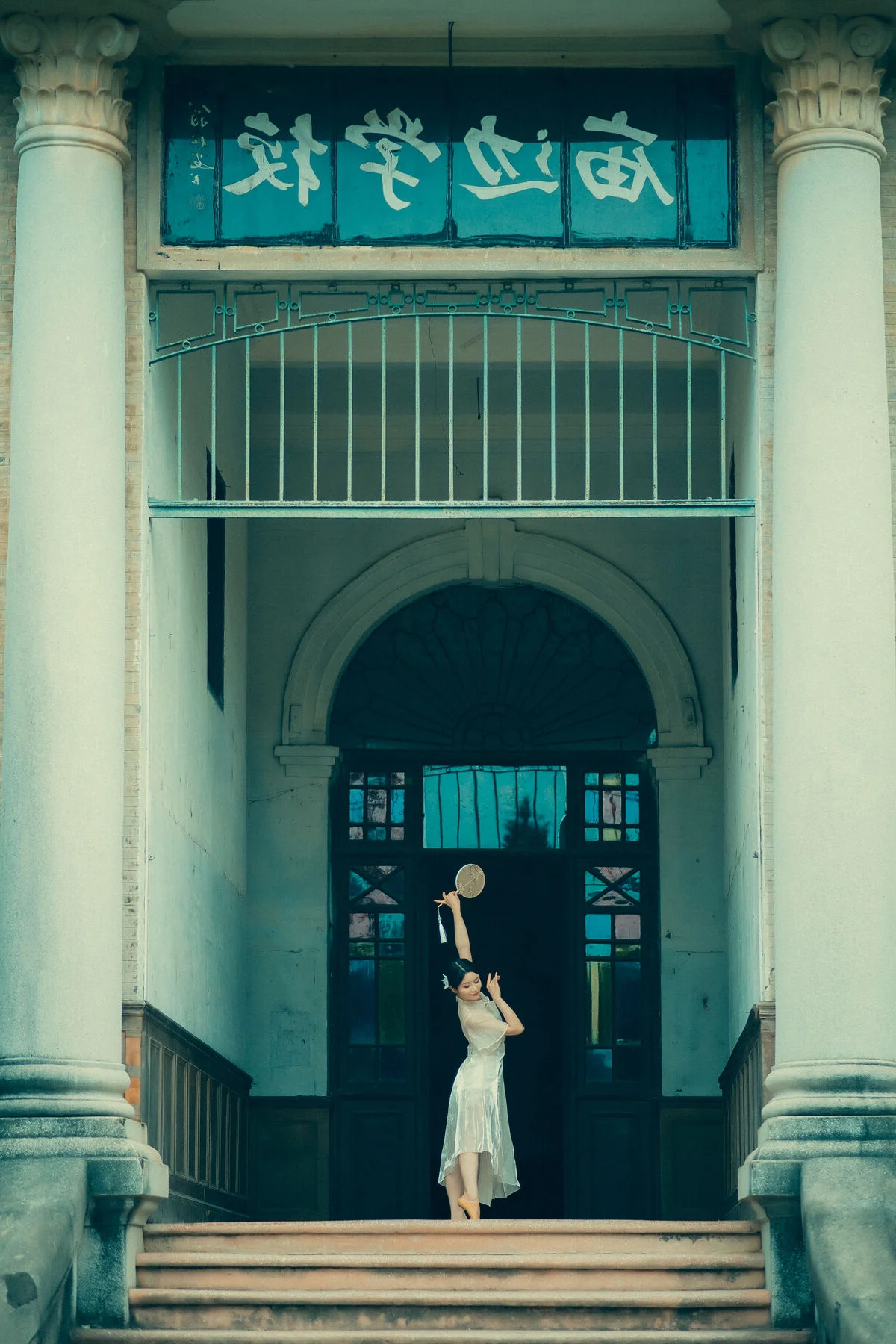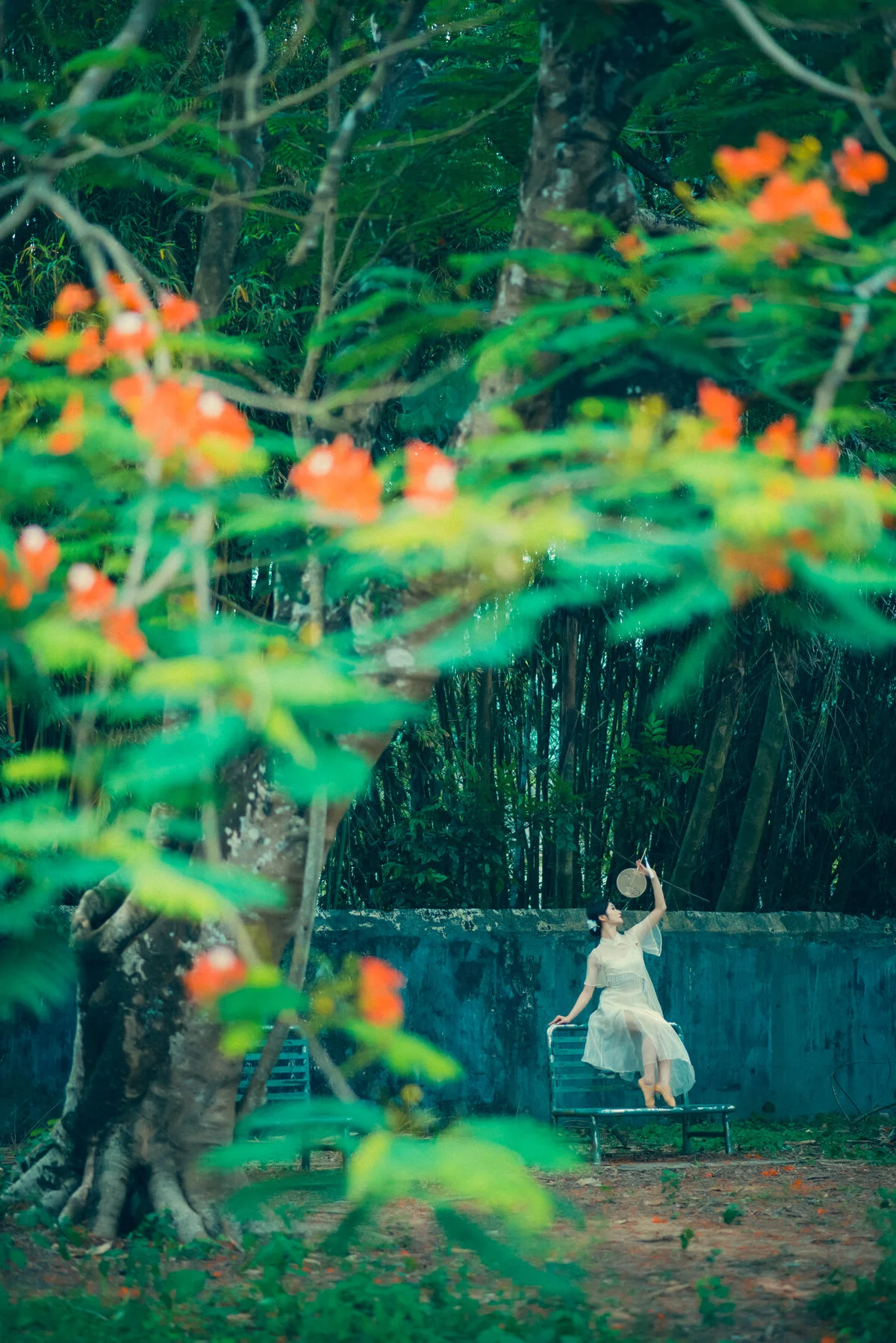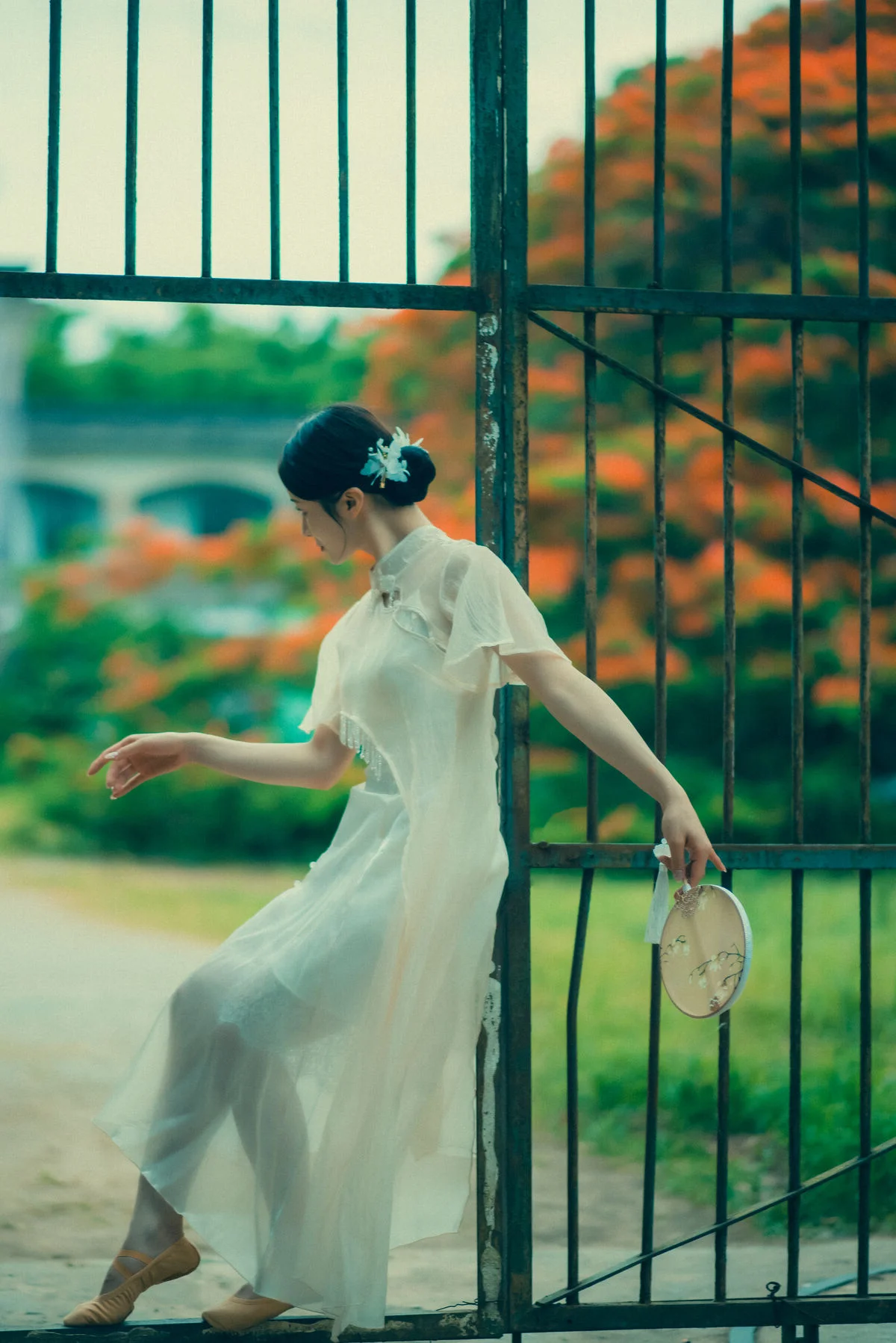Immerse yourself in the captivating beauty of this photograph, where Xiao Ran is captured in a truly poetic moment. Dressed in a pristine white gown, gently flowing in the breeze, she embodies an ethereal dancer, gracefully performing her unique dance amidst the lush green landscape. In the distance, an ancient villa peeks from behind vibrant flame trees, creating a backdrop that is both romantic and majestic. Soft light embraces the scene, highlighting every elegant contour and the subtle emotions on Xiao Ran's face and form. This image not only captures a visual but also tells a story of the harmonious blend between humanity, art, and the timeless beauty of nature, evoking feelings of serenity and admiration.#XiaoRan #DanceArt #NatureBeauty #EtherealStyle #YiTuYu