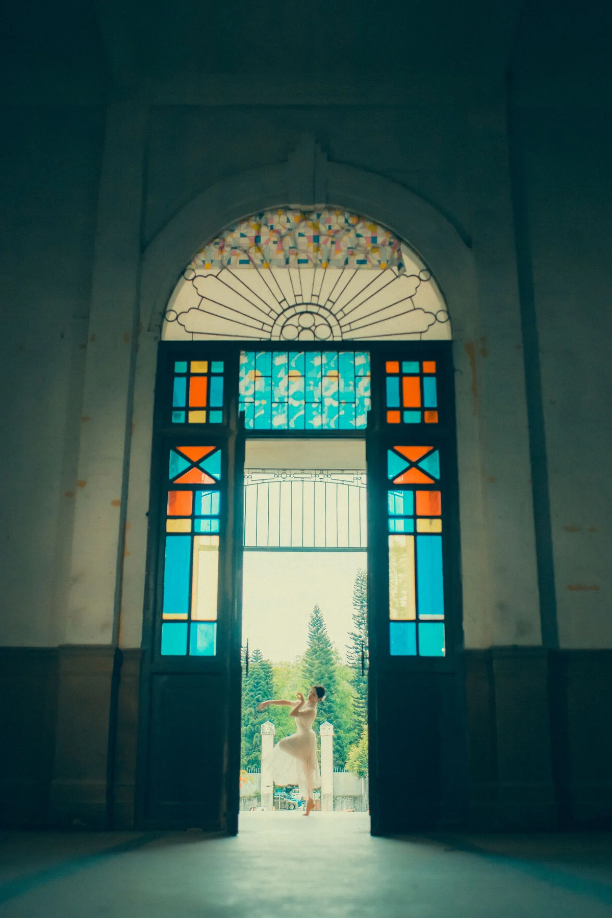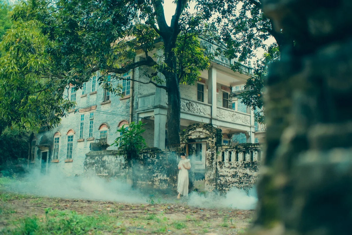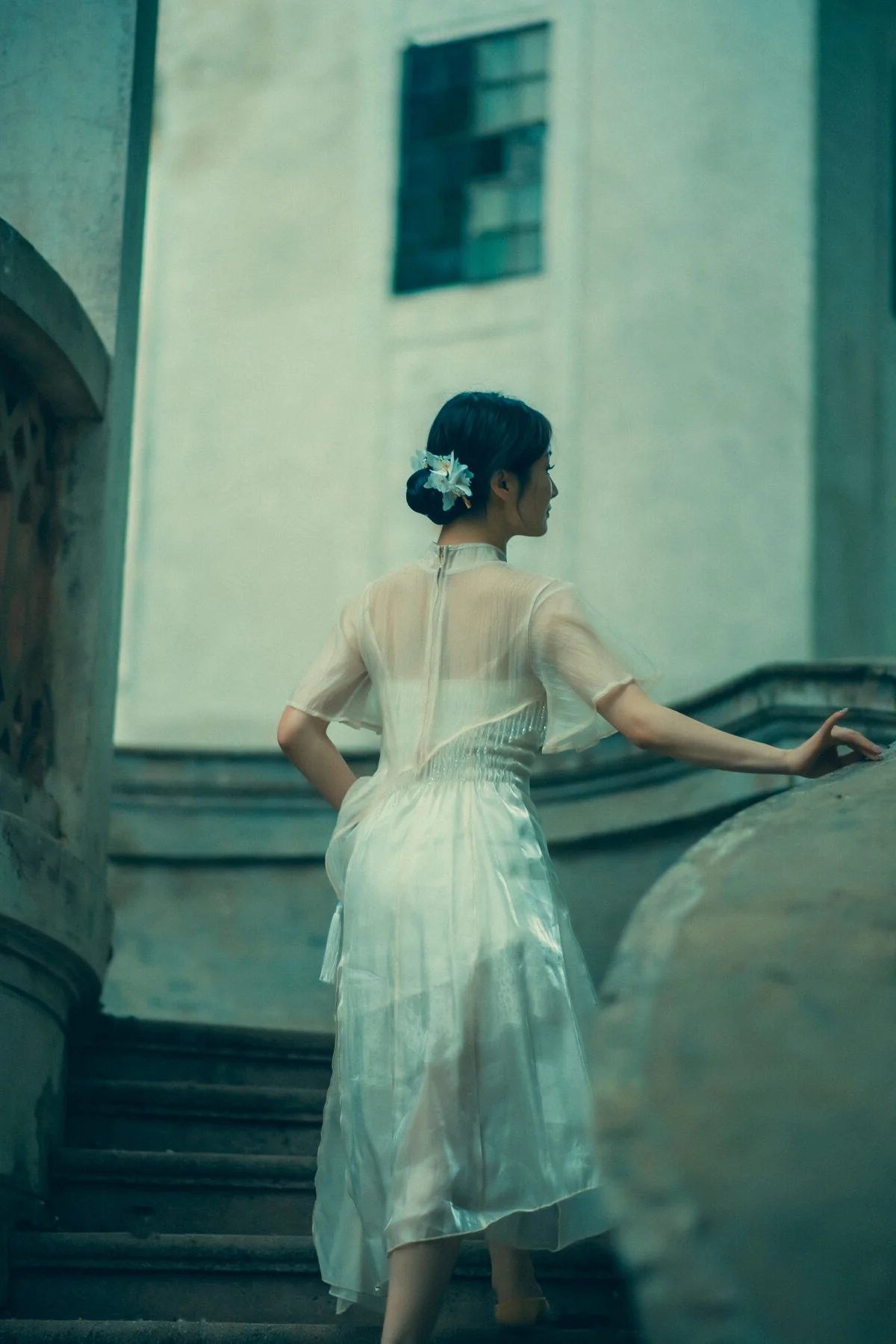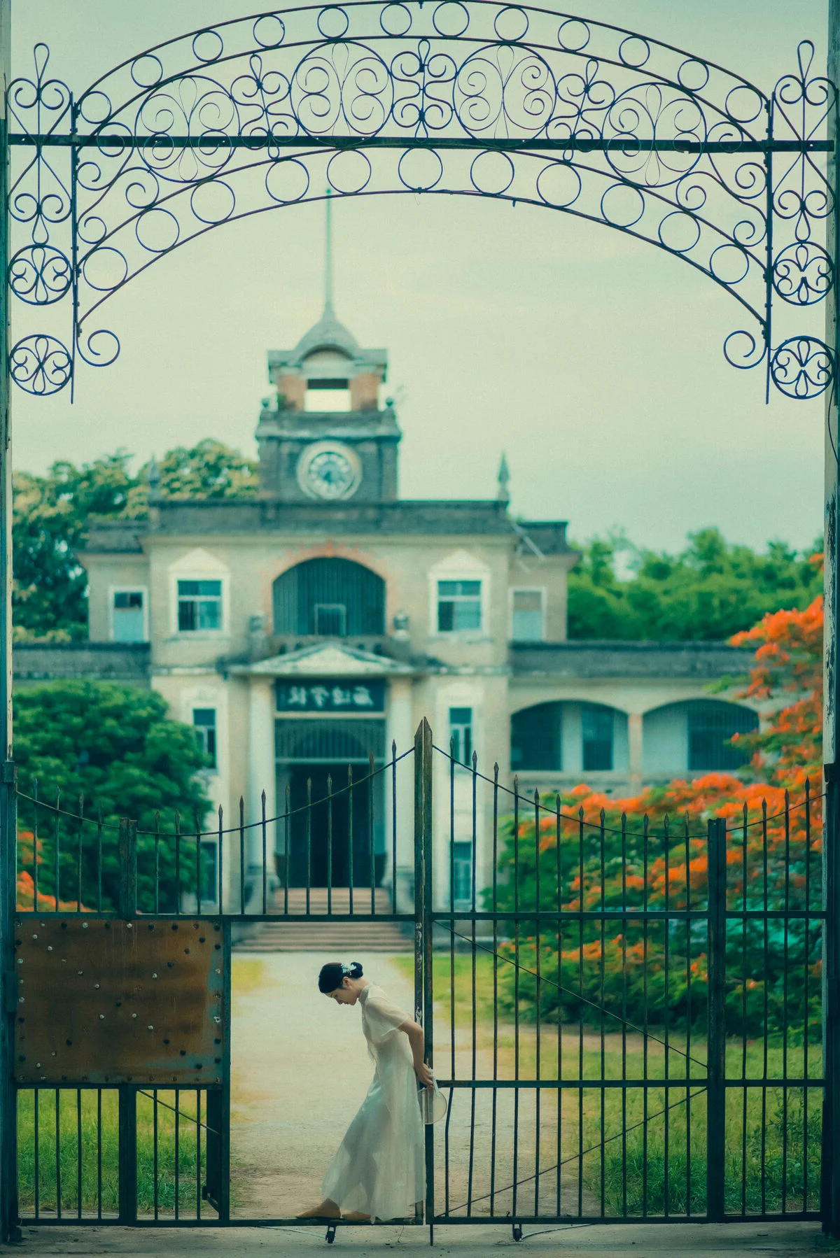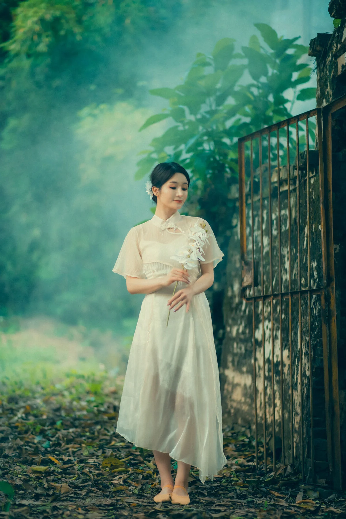 Immerse yourself in the captivating beauty of this photograph, where Xiao Ran is captured in a truly poetic moment. Dressed in a pristine white gown, gently flowing in the breeze, she embodies an ethereal dancer, gracefully performing her unique dance amidst the lush green landscape. In the distance, an ancient villa peeks from behind vibrant flame trees, creating a backdrop that is both romantic and majestic. Soft light embraces the scene, highlighting every elegant contour and the subtle emotions on Xiao Ran's face and form. This image not only captures a visual but also tells a story of the harmonious blend between humanity, art, and the timeless beauty of nature, evoking feelings of serenity and admiration.#XiaoRan #DanceArt #NatureBeauty #EtherealStyle #YiTuYu