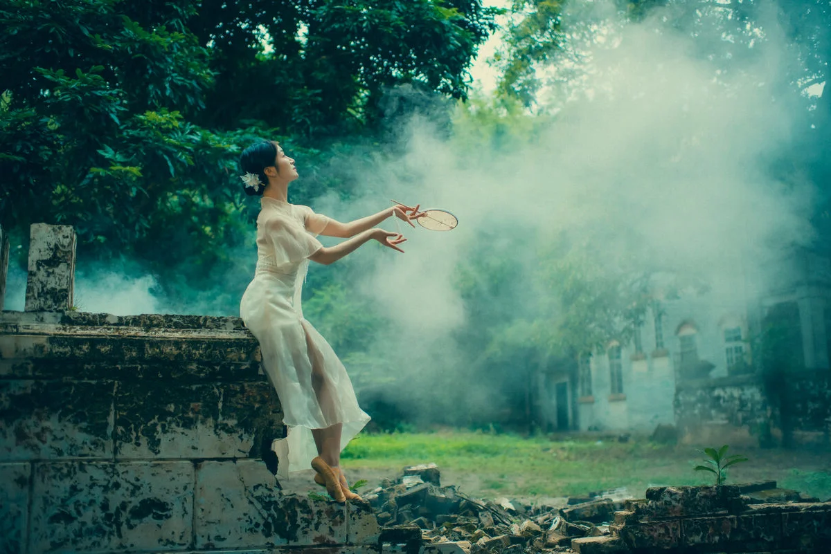 Ethereal Muse in Traditional Silk and Ancient Architecture