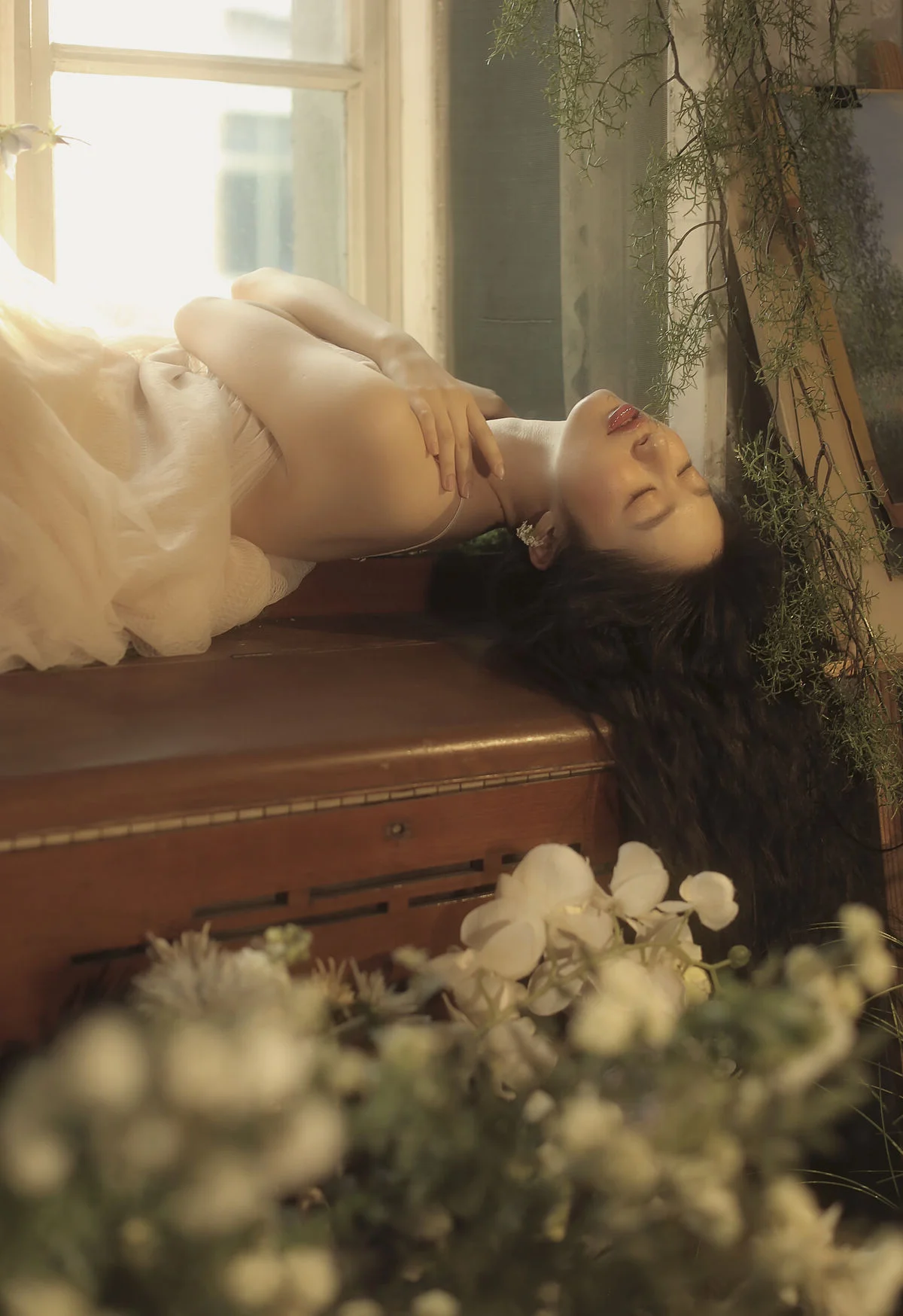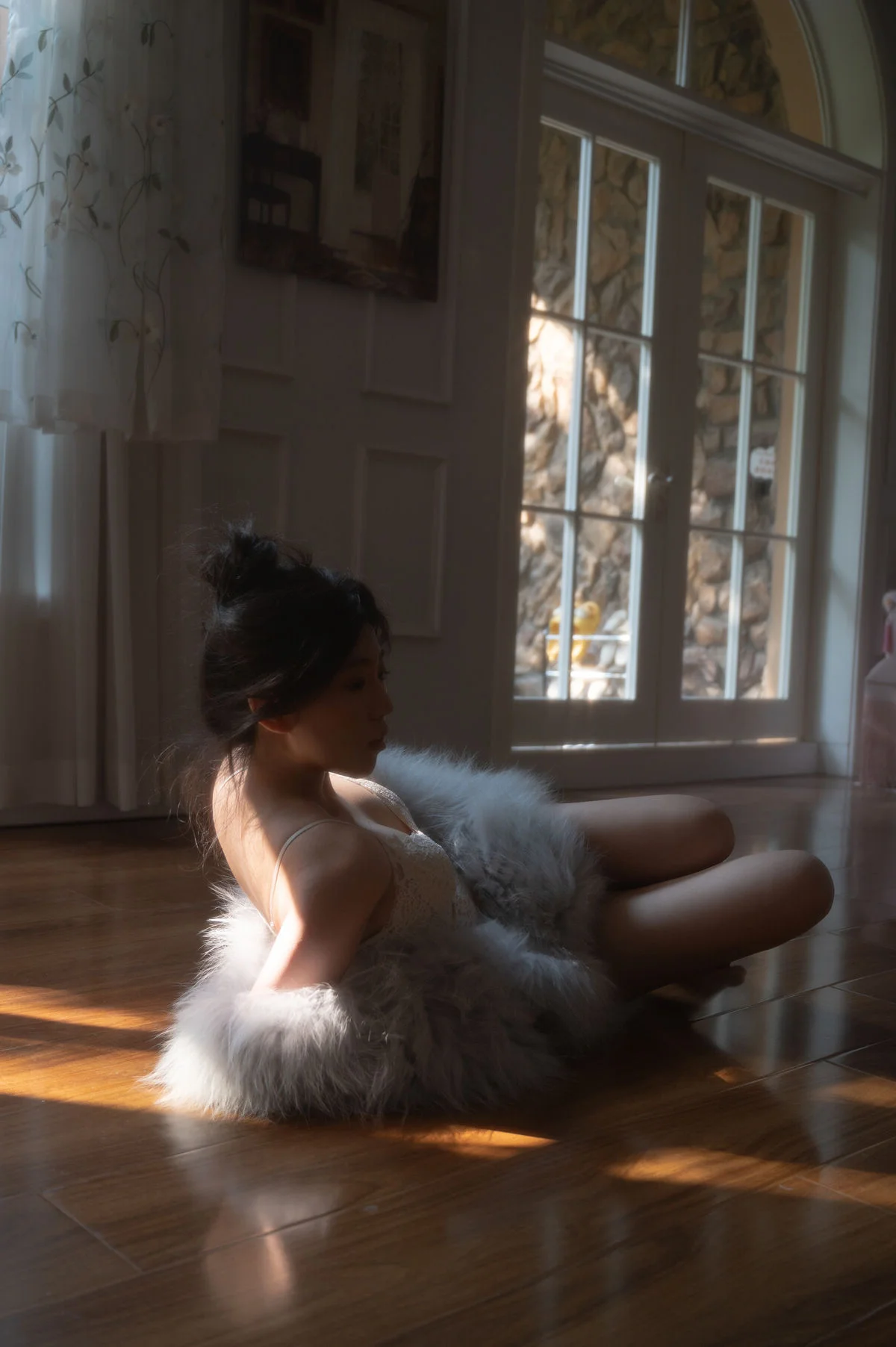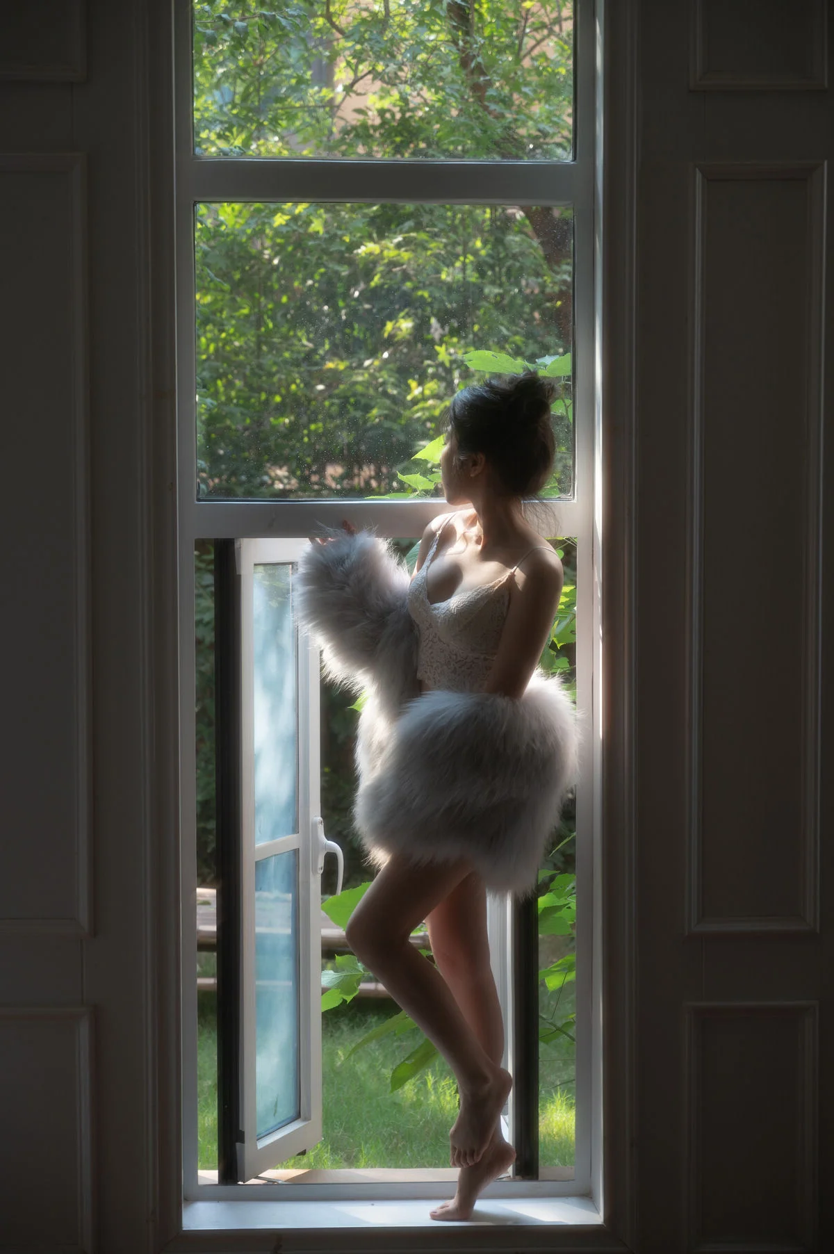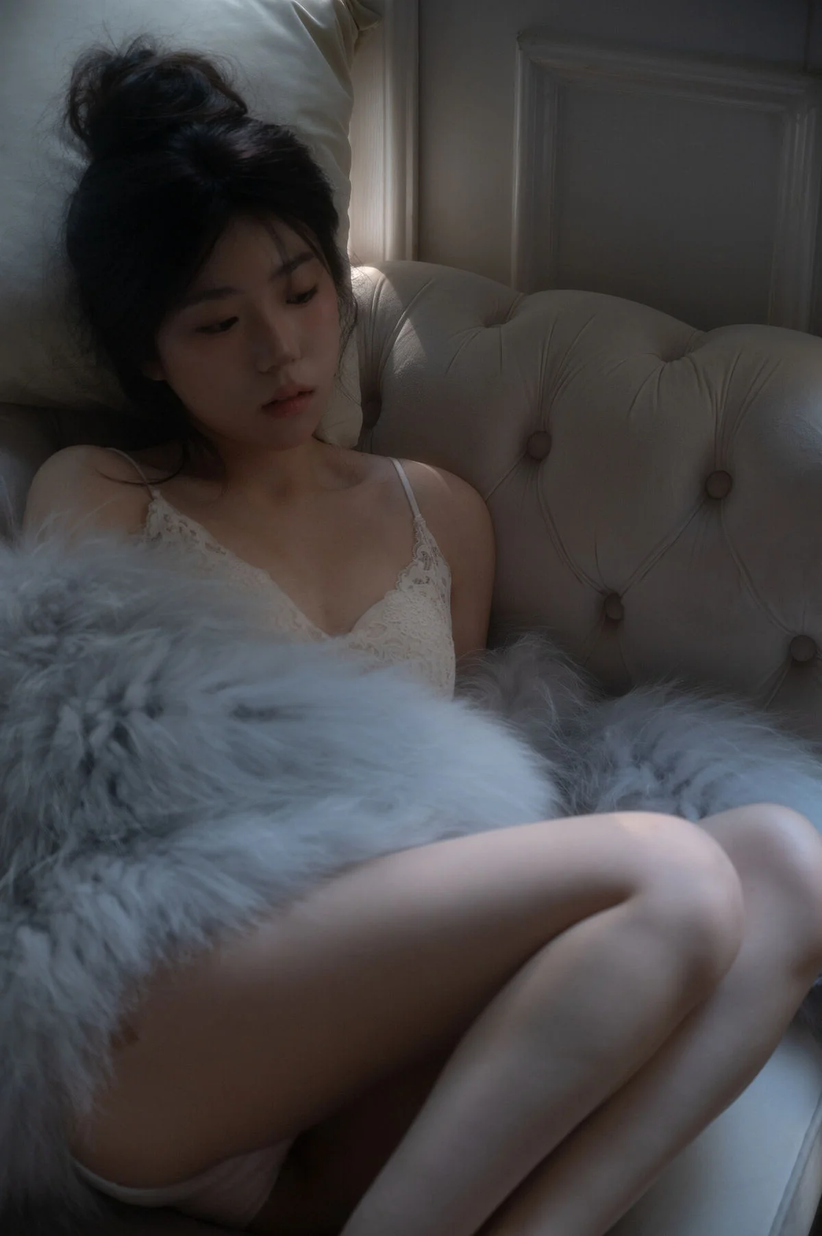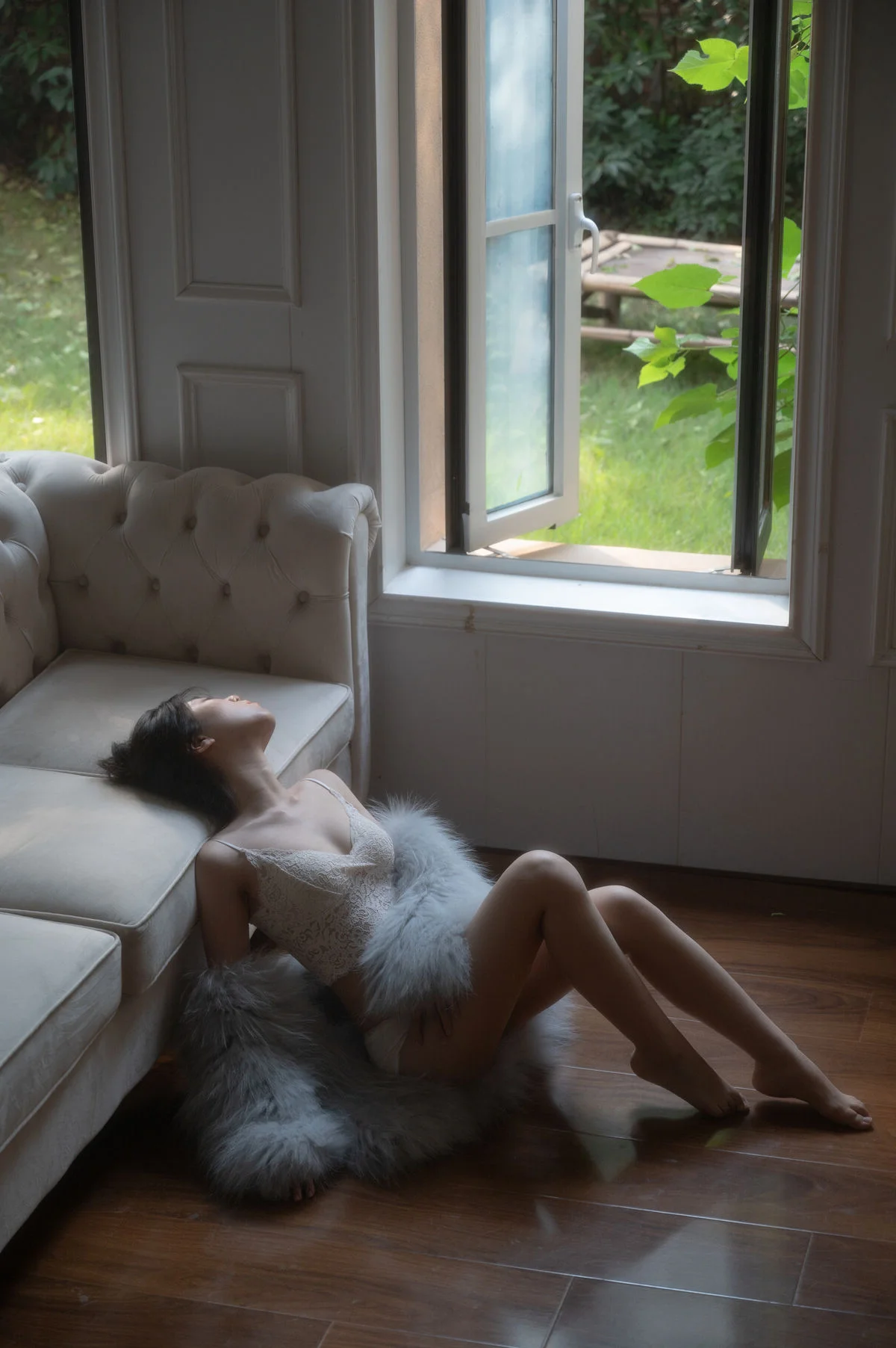 This visual masterpiece captures model Le Le in a moment of pure serenity by a sun-drenched window, perfectly embodying the essence of the Art Language Vol.8966 collection. Dressed in luxurious, soft grey faux fur, the styling emphasizes a delicate balance between high-fashion opulence and intimate comfort. The natural light filtering through the lush green garden outside creates a dreamy backlight, highlighting her elegant silhouette and poised demeanor. Her upward gaze and relaxed posture evoke a sense of longing and peaceful introspection, making the viewer feel as though they have stumbled upon a private, golden-hour sanctuary. The composition masterfully uses the architectural lines of the window to frame her beauty, while the textures of the fur and the softness of the skin blend into a harmonious palette of whites and neutrals. It is a stunning portrayal of feminine grace and sophisticated visual storytelling that resonates with anyone who appreciates the intersection of fashion and fine art photography.#EtherealStyle #LeLeModel #FineArtPhotography #LuxeLiving #VisualStorytelling