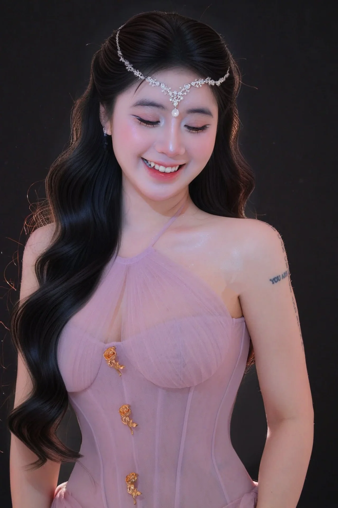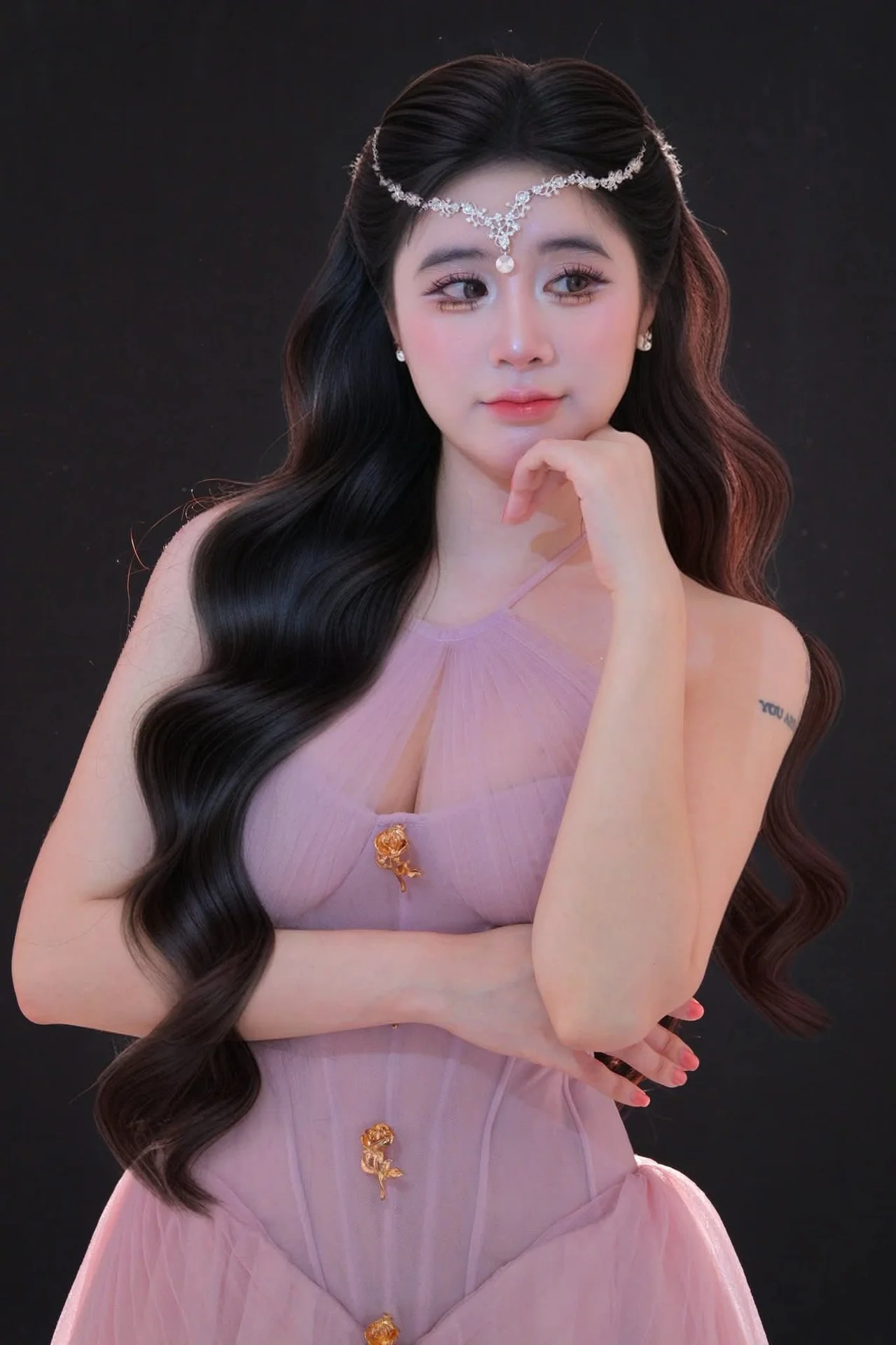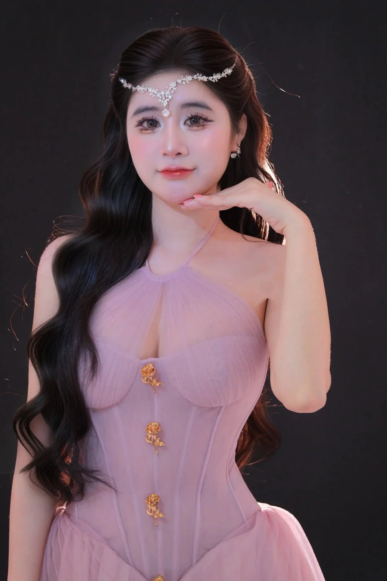 This captivating image portrays an ethereal beauty, reminiscent of a princess from a fairy tale. The woman showcases long, voluminous wavy hair that cascades gracefully, adorned with a delicate, sparkling tiara on her forehead. She wears an elegant pastel pink gown featuring intricate sheer details and golden embellishments, highlighting her sophisticated charm. Her thoughtful and enchanting gaze suggests a moment of serene contemplation, drawing viewers into her world of fantasy. The overall composition evokes a dreamy, almost magical atmosphere where refined elegance meets poetic allure, captivating the imagination. This portrait is a true embodiment of timeless grace and exquisite style.#EtherealBeauty #DreamyPrincess #ElegantGown #LongWavyHair #FairytaleVibes