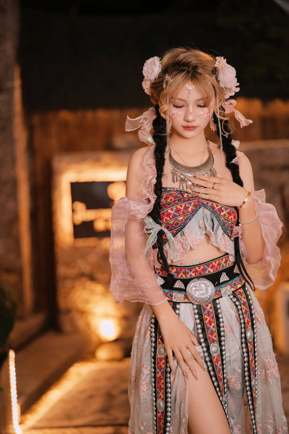 Bathed in the soft glow of city lights, her presence exudes an ethereal elegance that feels like a scene from a modern fairytale. Wearing a delicately embellished pink sequin dress, she strikes a perfect balance between high fashion sophistication and youthful charm. Every element, from the floral earrings to the effortlessly chic bun with loose strands, highlights her delicate features and captivating gaze. The visual harmony captured showcases a moment of pure poise and artistic allure, reflecting a refined aesthetic sense. This look is a masterclass in feminine styling, where textures and light dance together to create a memorable impression. It is an inspiring portrayal of confidence and grace, perfect for those seeking a touch of romantic glamour in their evening style, reminding us that true beauty lies in the harmony of fashion and emotion.#ElegantStyle #EveningGlamour #PinkAesthetic #PortraitPhotography #FeminineVibe