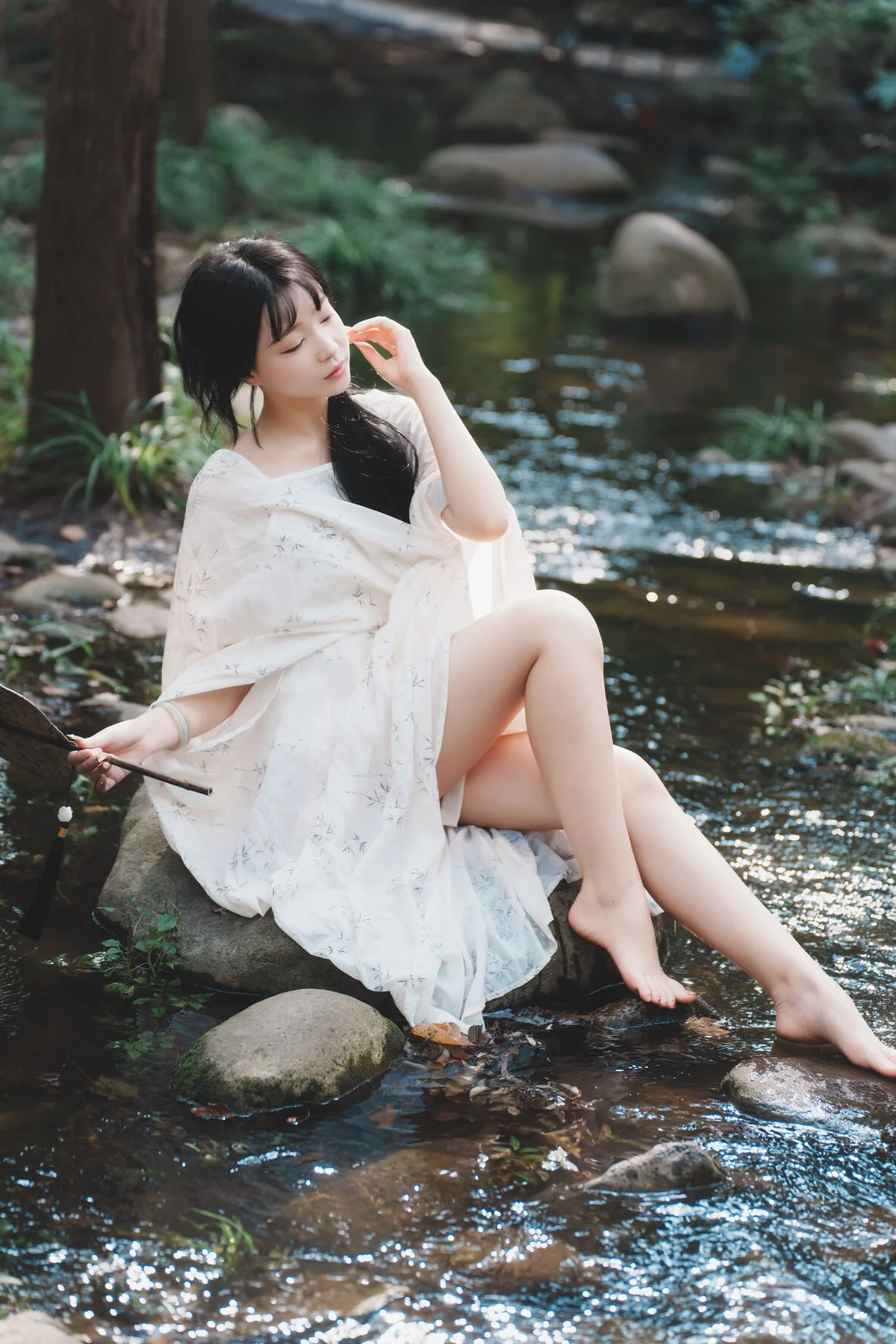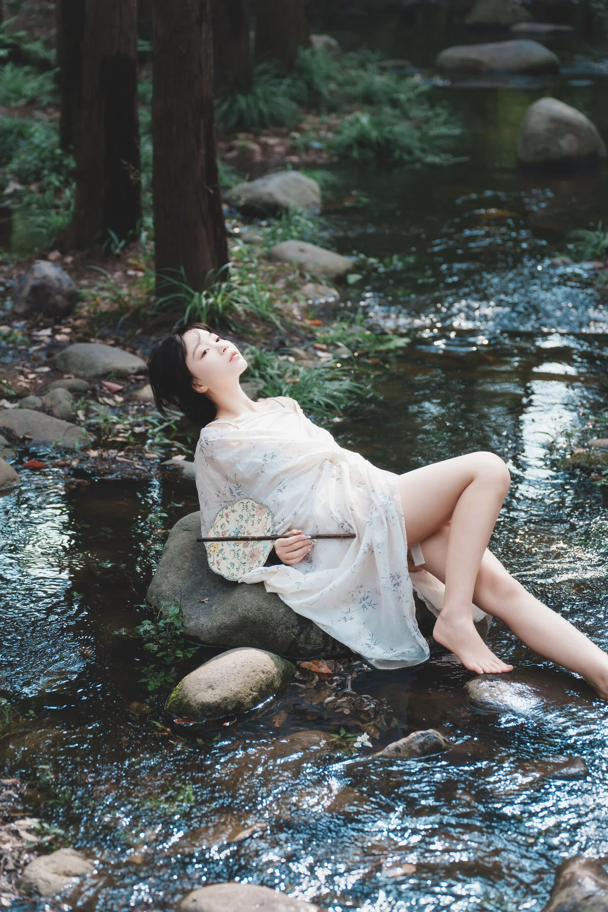 In the heart of a lush forest, Disexi Si Ning embodies the essence of a woodland nymph for the YiTuYu Art Language Vol.8875 collection. Her choice of attire, a flowing white ensemble made of lightweight and breathable fabric, perfectly captures the soft sunlight dancing through the canopy. There is a poetic stillness in her gaze, complemented by the gentle ripples of the stream and the traditional round fan she holds with such grace. The visual storytelling here is profound, blending modern fashion sensibilities with a timeless, nostalgic atmosphere. As she playfully splashes the cool water, the droplets catch the light like scattered diamonds, adding a dynamic layer to the otherwise serene composition. This series is more than just photography; it is a visual exploration of tranquility and elegance, inviting the viewer to lose themselves in a world where nature and fashion exist in perfect, quiet harmony.
