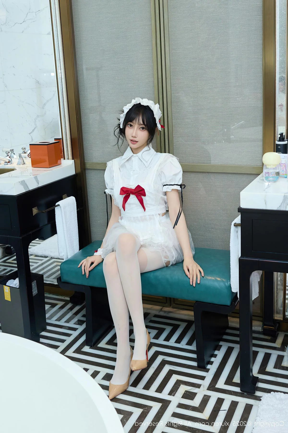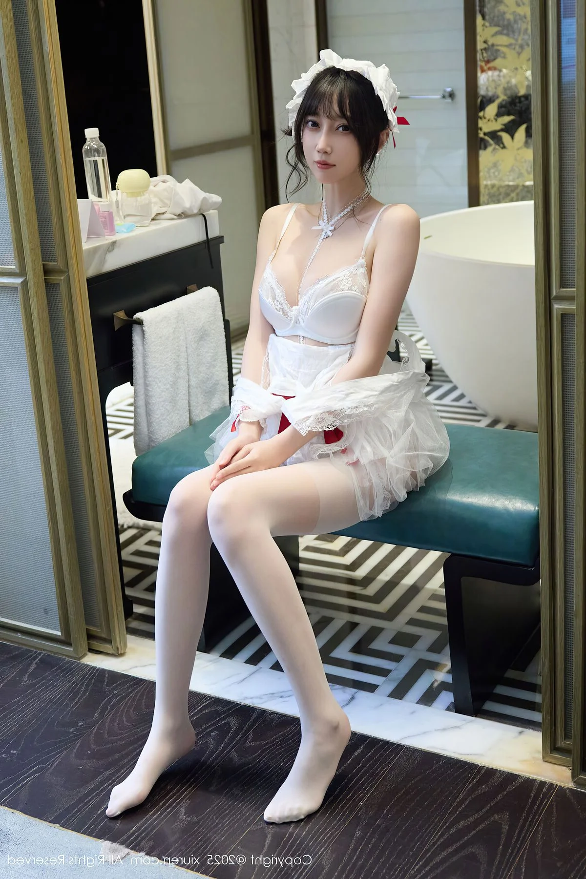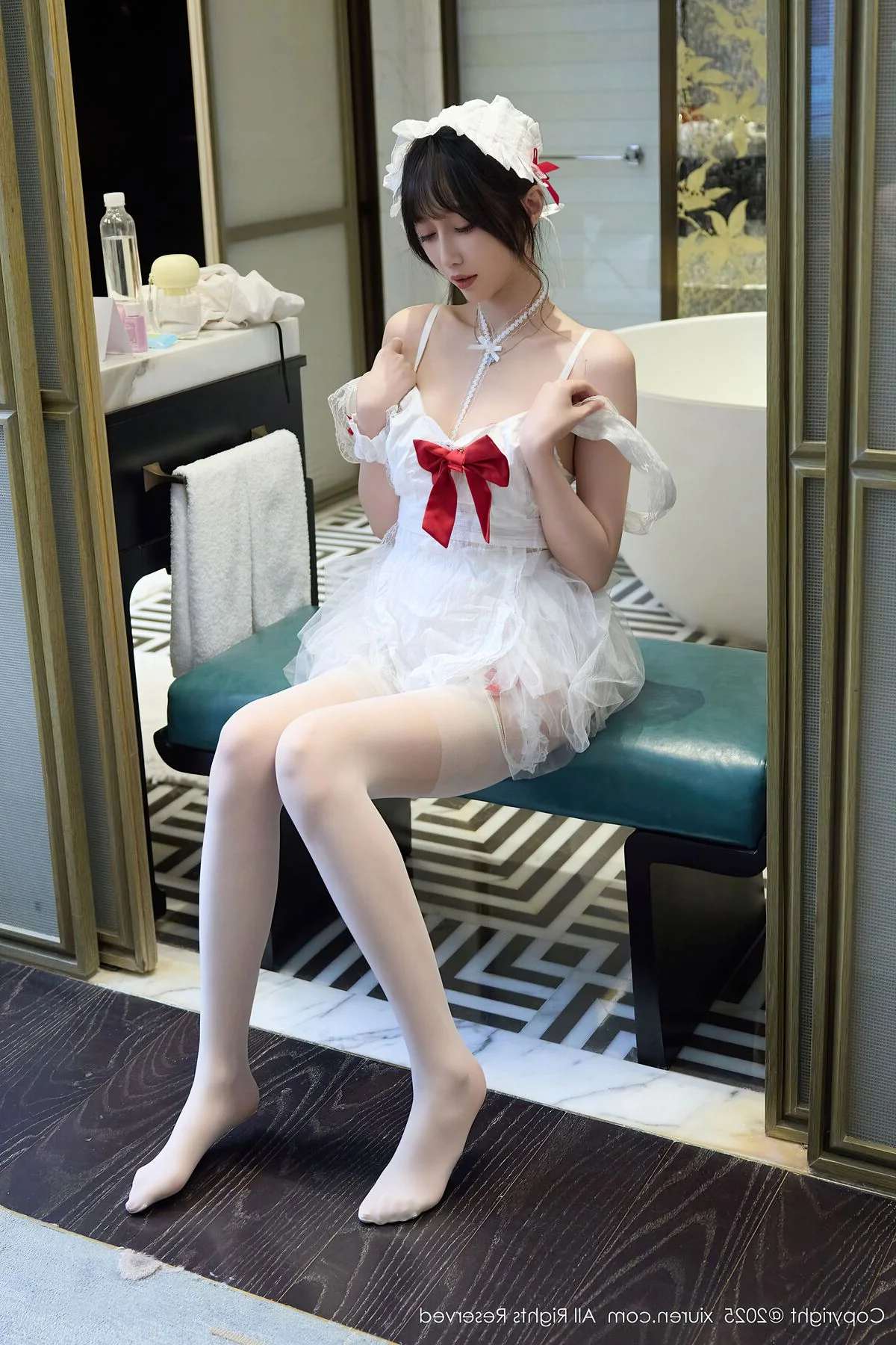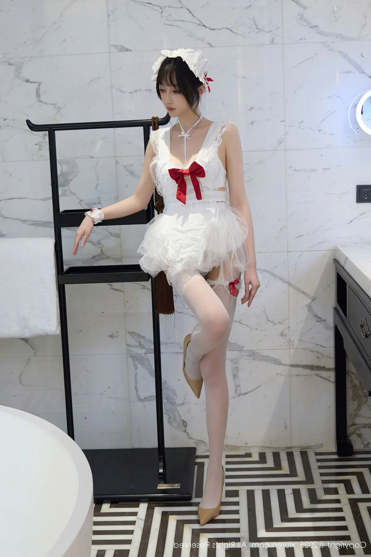 Capturing the essence of a dreamlike afternoon in Shanghai, Yue Er Yue Er shines with captivating grace in this exquisite shoot from XiuRen No.10827. The atmosphere is filled with a sense of intimate elegance, where every frame tells a story of charm and modern beauty. Her choice of attire, a delicate white lace ensemble accented with bold red ribbons, perfectly balances a sense of playful innocence with a sophisticated and alluring edge. The soft lighting of the indoor setting highlights the intricate textures of the fabric and the subtle, emotive expressions in her eyes, creating a deeply immersive visual experience. There is a certain poetic quality to her poses, reflecting a high level of aesthetic sensibility that resonates with the vibrant yet nostalgic soul of Shanghai. This collection serves as a beautiful testament to visual storytelling, blending fashion and emotion into a seamless artistic journey that feels both personal and cinematic, leaving a lasting impression of pure elegance.