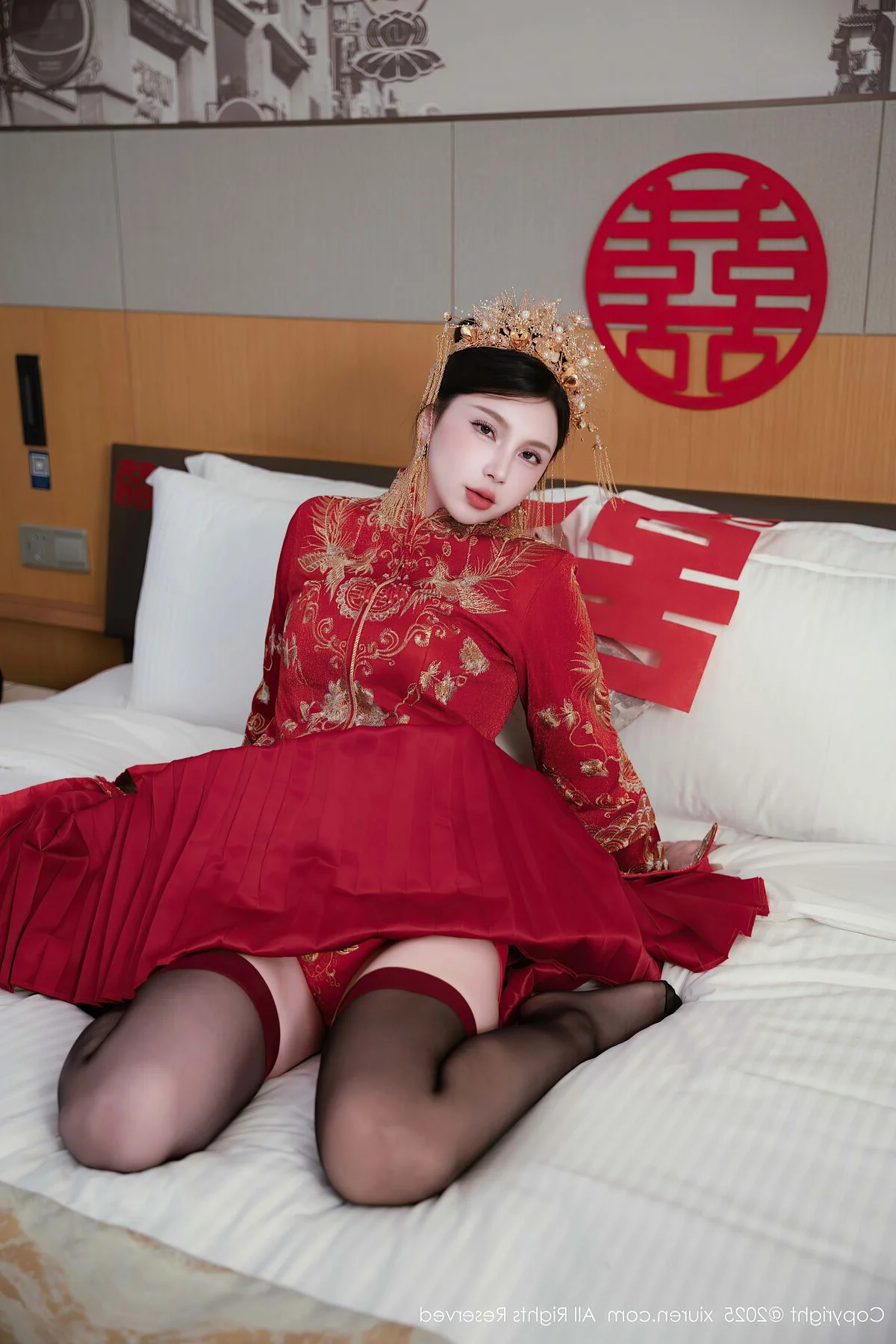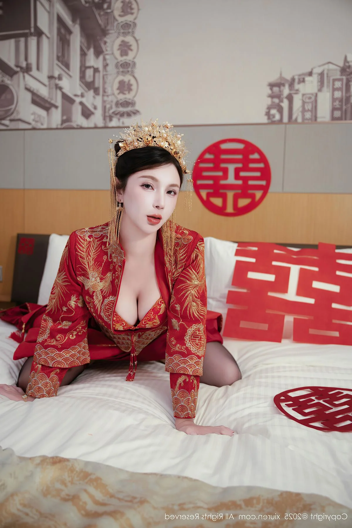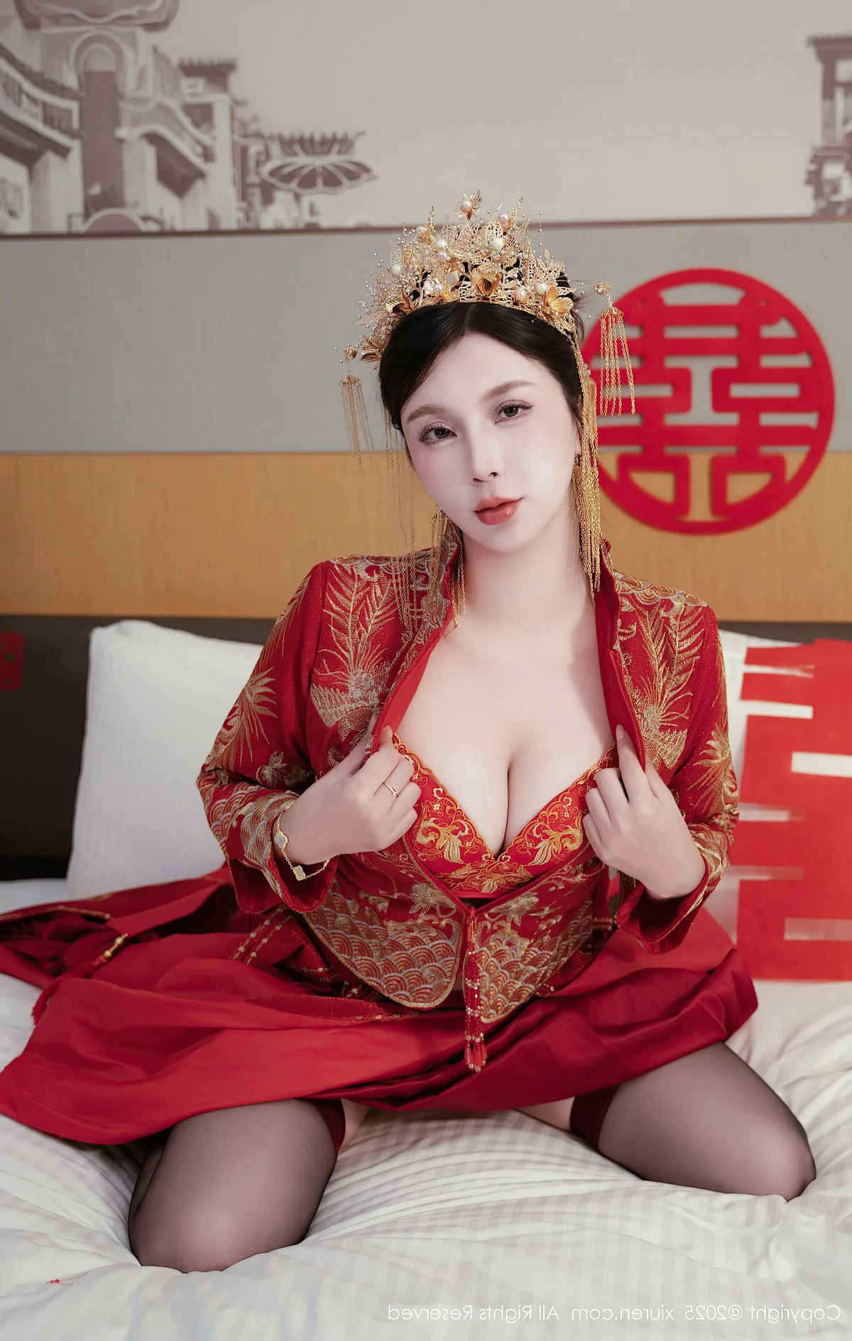 Capturing the essence of a dreamlike afternoon in Shanghai, Yue Er Yue Er shines with captivating grace in this exquisite shoot from XiuRen No.10827. The atmosphere is filled with a sense of intimate elegance, where every frame tells a story of charm and modern beauty. Her choice of attire, a delicate white lace ensemble accented with bold red ribbons, perfectly balances a sense of playful innocence with a sophisticated and alluring edge. The soft lighting of the indoor setting highlights the intricate textures of the fabric and the subtle, emotive expressions in her eyes, creating a deeply immersive visual experience. There is a certain poetic quality to her poses, reflecting a high level of aesthetic sensibility that resonates with the vibrant yet nostalgic soul of Shanghai. This collection serves as a beautiful testament to visual storytelling, blending fashion and emotion into a seamless artistic journey that feels both personal and cinematic, leaving a lasting impression of pure elegance.