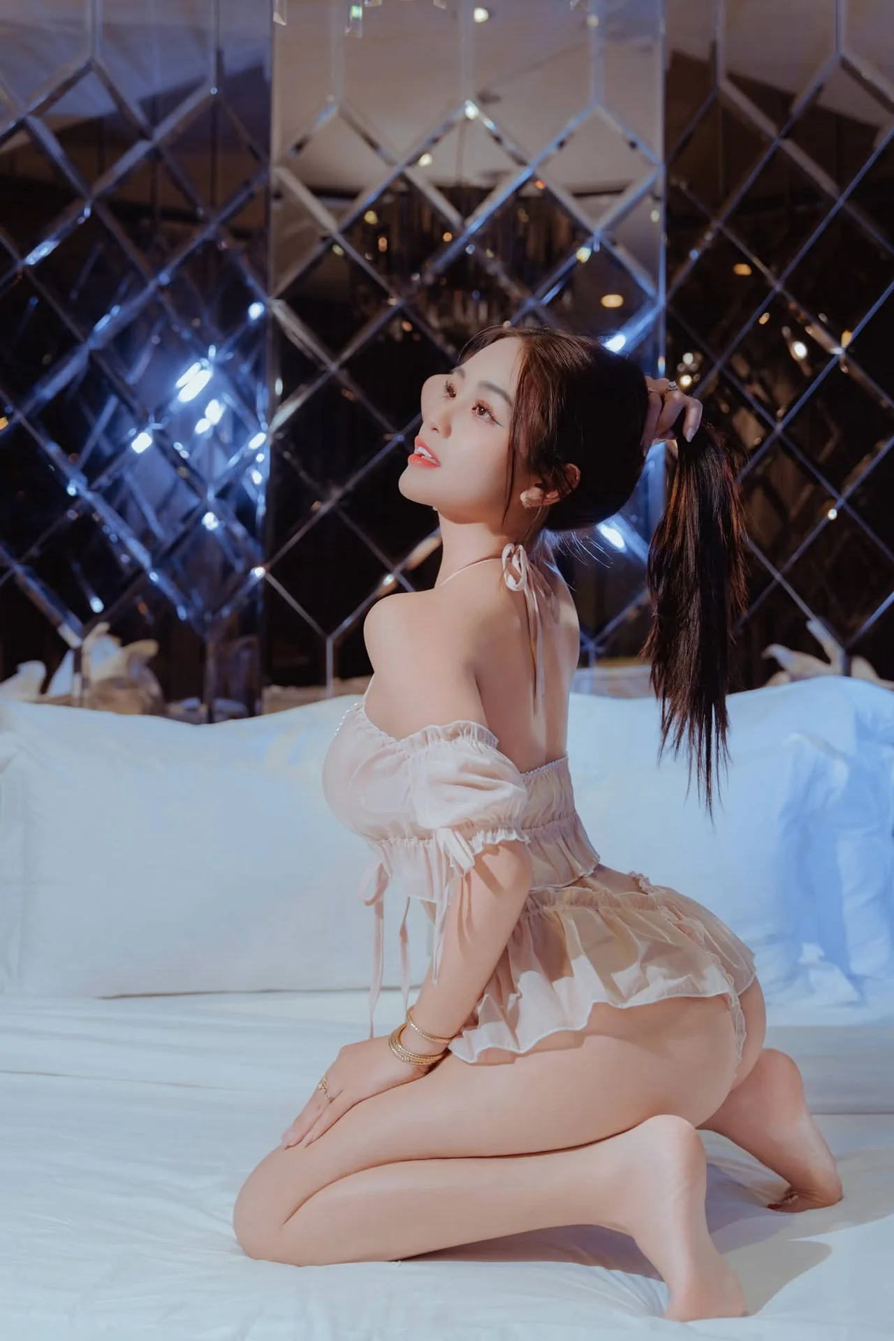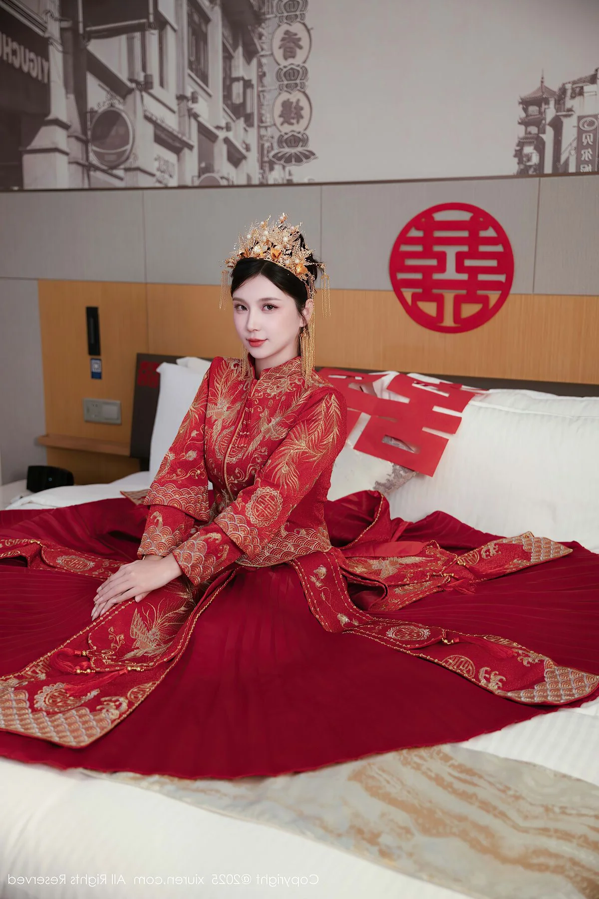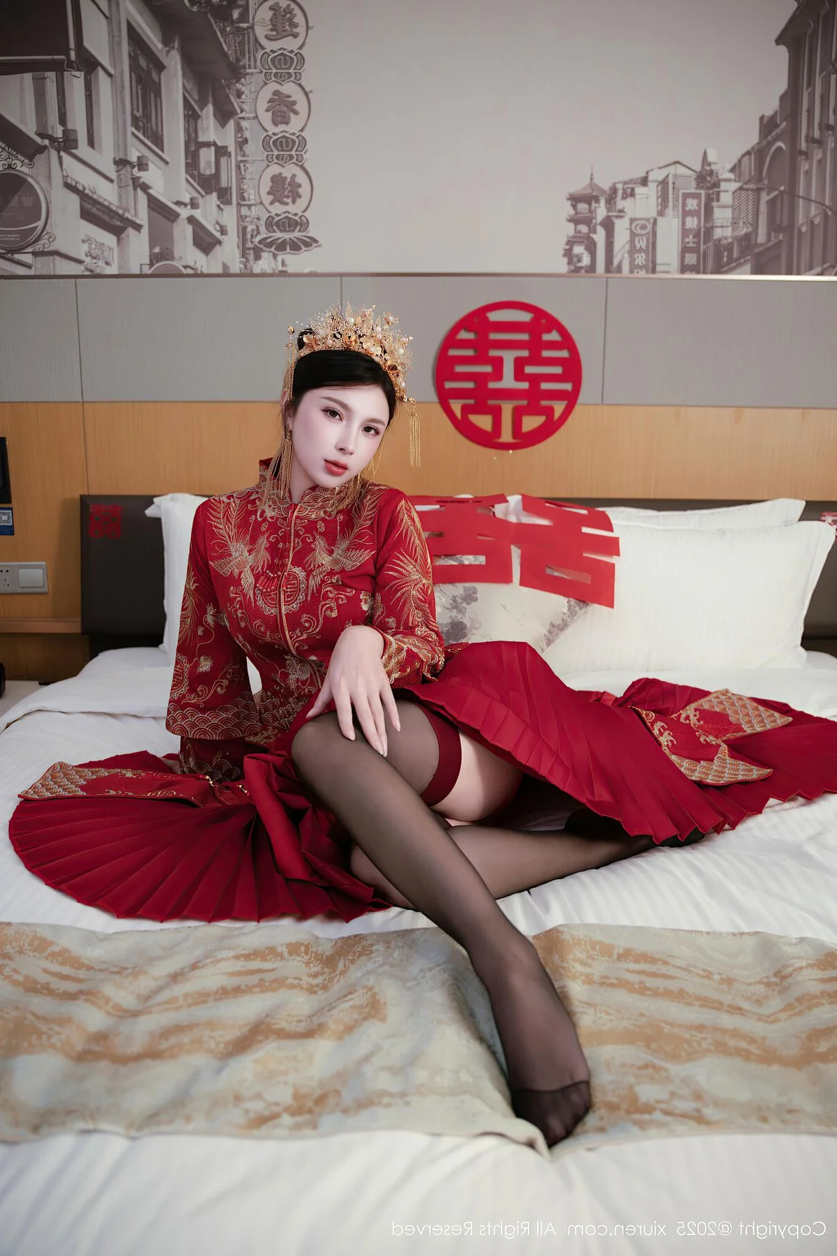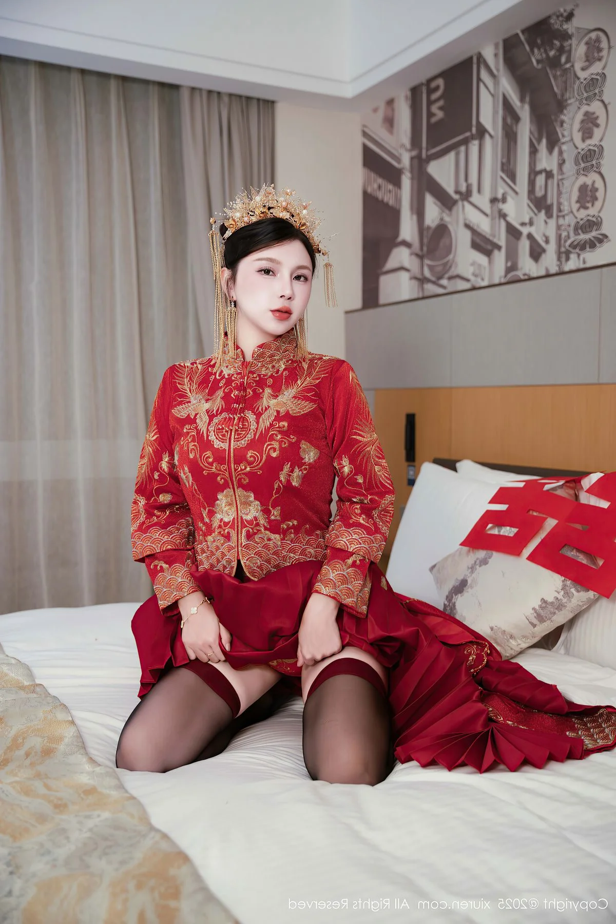 Capturing the essence of a dreamlike afternoon in Shanghai, Yue Er Yue Er shines with captivating grace in this exquisite shoot from XiuRen No.10827. The atmosphere is filled with a sense of intimate elegance, where every frame tells a story of charm and modern beauty. Her choice of attire, a delicate white lace ensemble accented with bold red ribbons, perfectly balances a sense of playful innocence with a sophisticated and alluring edge. The soft lighting of the indoor setting highlights the intricate textures of the fabric and the subtle, emotive expressions in her eyes, creating a deeply immersive visual experience. There is a certain poetic quality to her poses, reflecting a high level of aesthetic sensibility that resonates with the vibrant yet nostalgic soul of Shanghai. This collection serves as a beautiful testament to visual storytelling, blending fashion and emotion into a seamless artistic journey that feels both personal and cinematic, leaving a lasting impression of pure elegance.