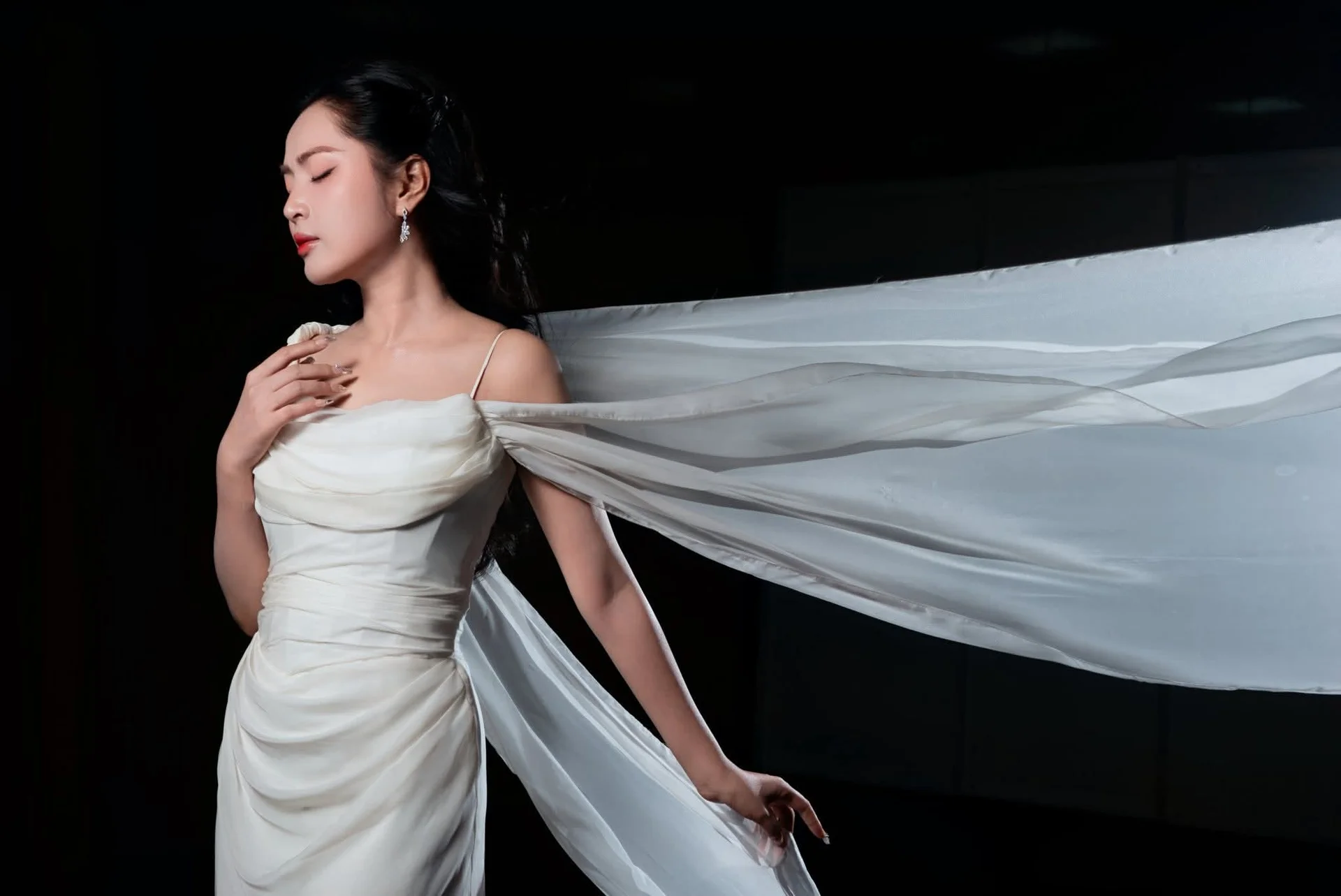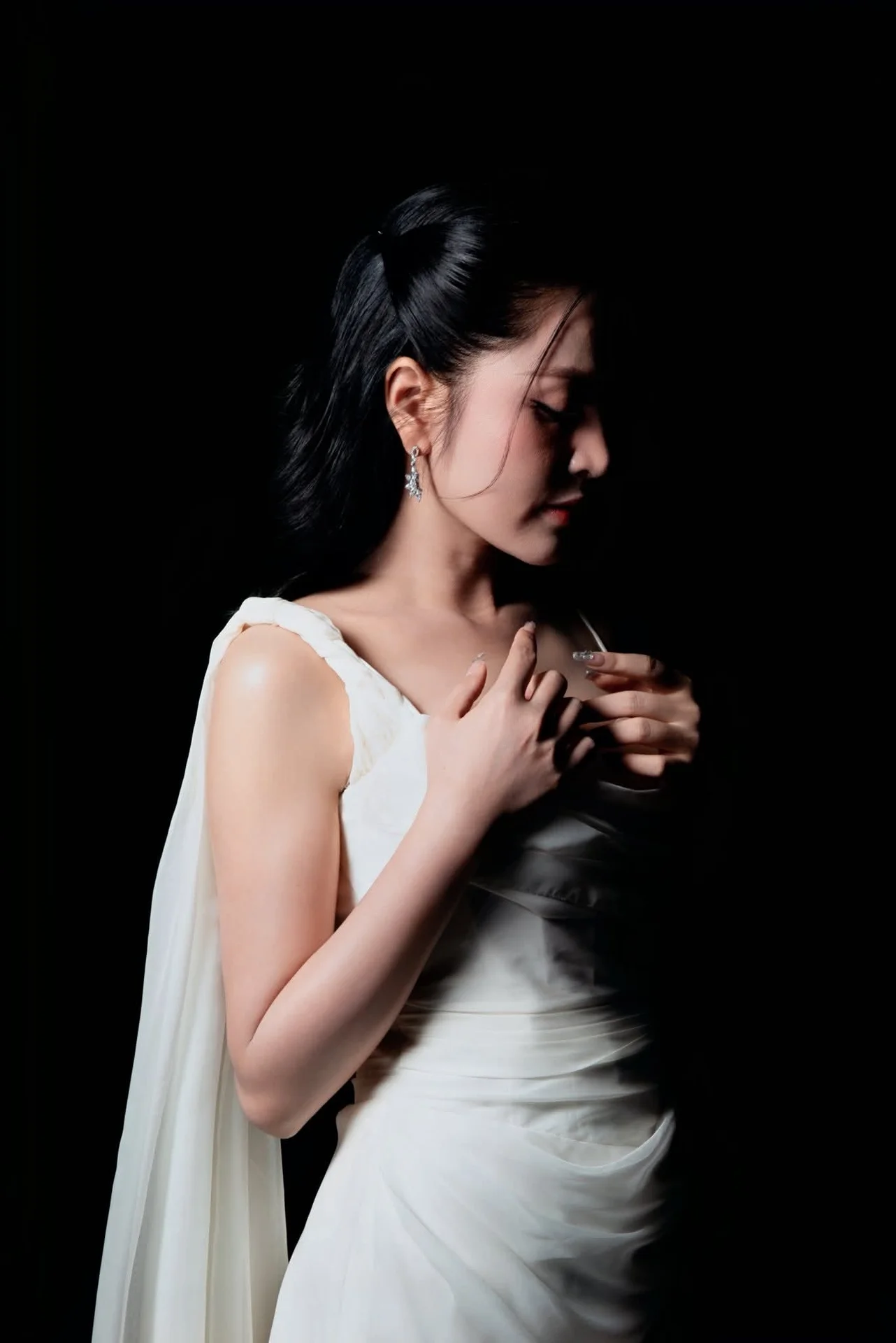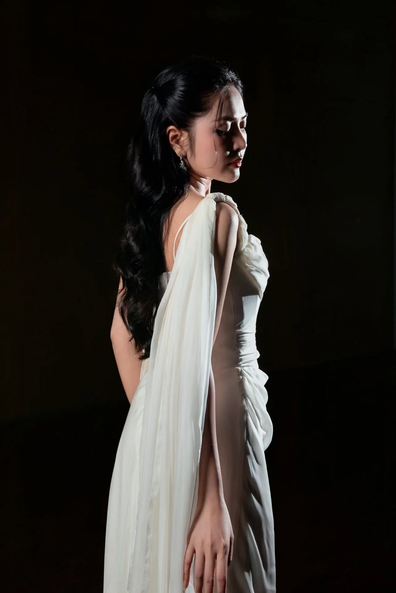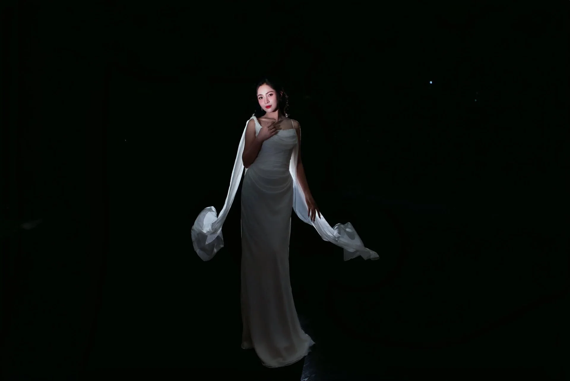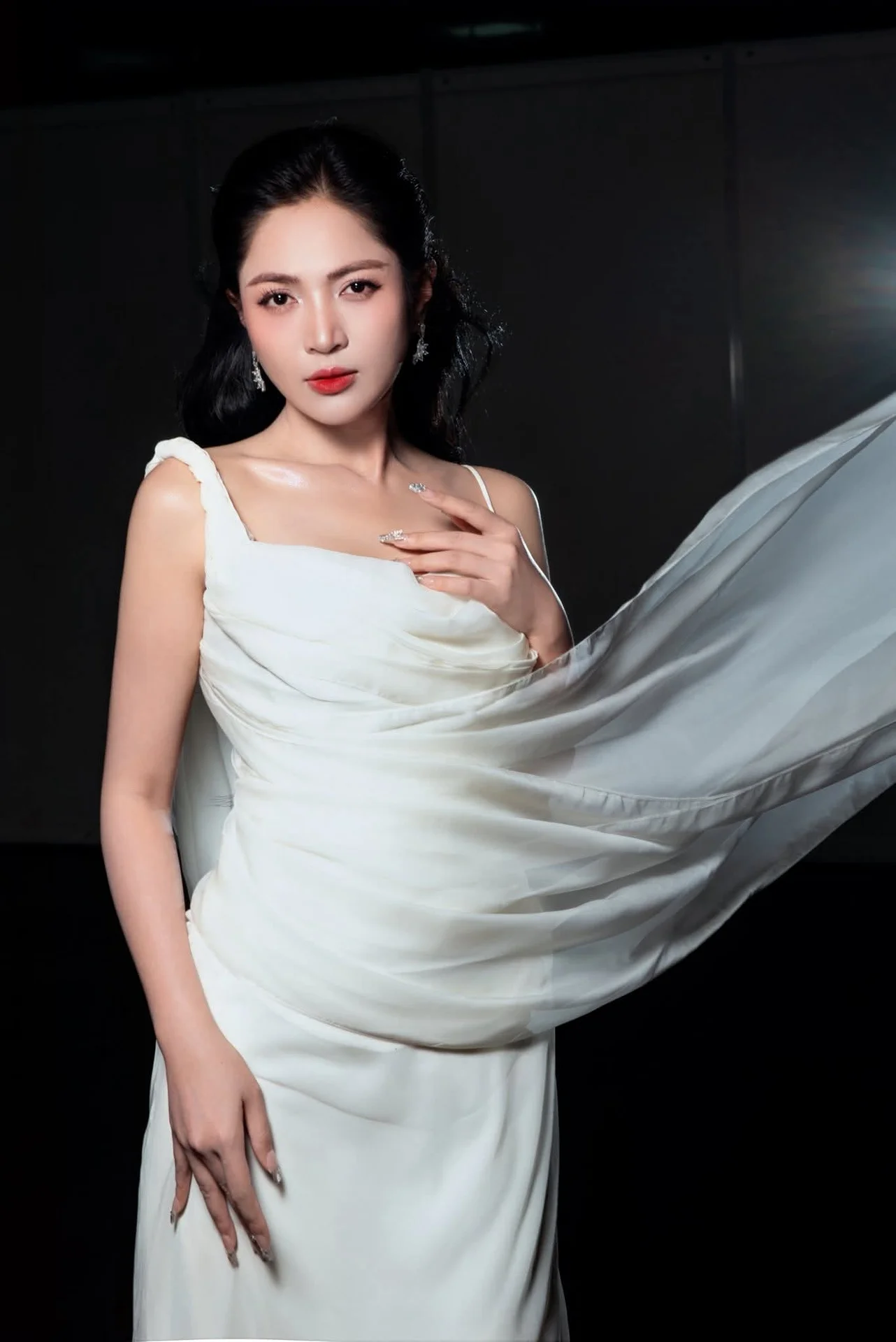 This portrait captures a moment of pure cinematic grace where fashion meets artistic movement. The subject exudes a sophisticated aura, dressed in a flowing white gown that seems to dance around her with every breath. Her expression is both captivating and serene, drawing the viewer into a world of quiet confidence and timeless beauty. The high contrast lighting beautifully highlights the delicate texture of the fabric and the subtle shimmer of her accessories, creating a striking visual balance against the dark backdrop. Every detail, from the gentle draping of the silk to her poised body language, speaks of a refined aesthetic sense. This image FB_IMG_1767930494091.jpg is a testament to the power of minimalist elegance, offering a glimpse into a soul that is as strong as it is delicate. It is a perfect inspiration for those who appreciate high fashion photography and the art of storytelling through visual style.