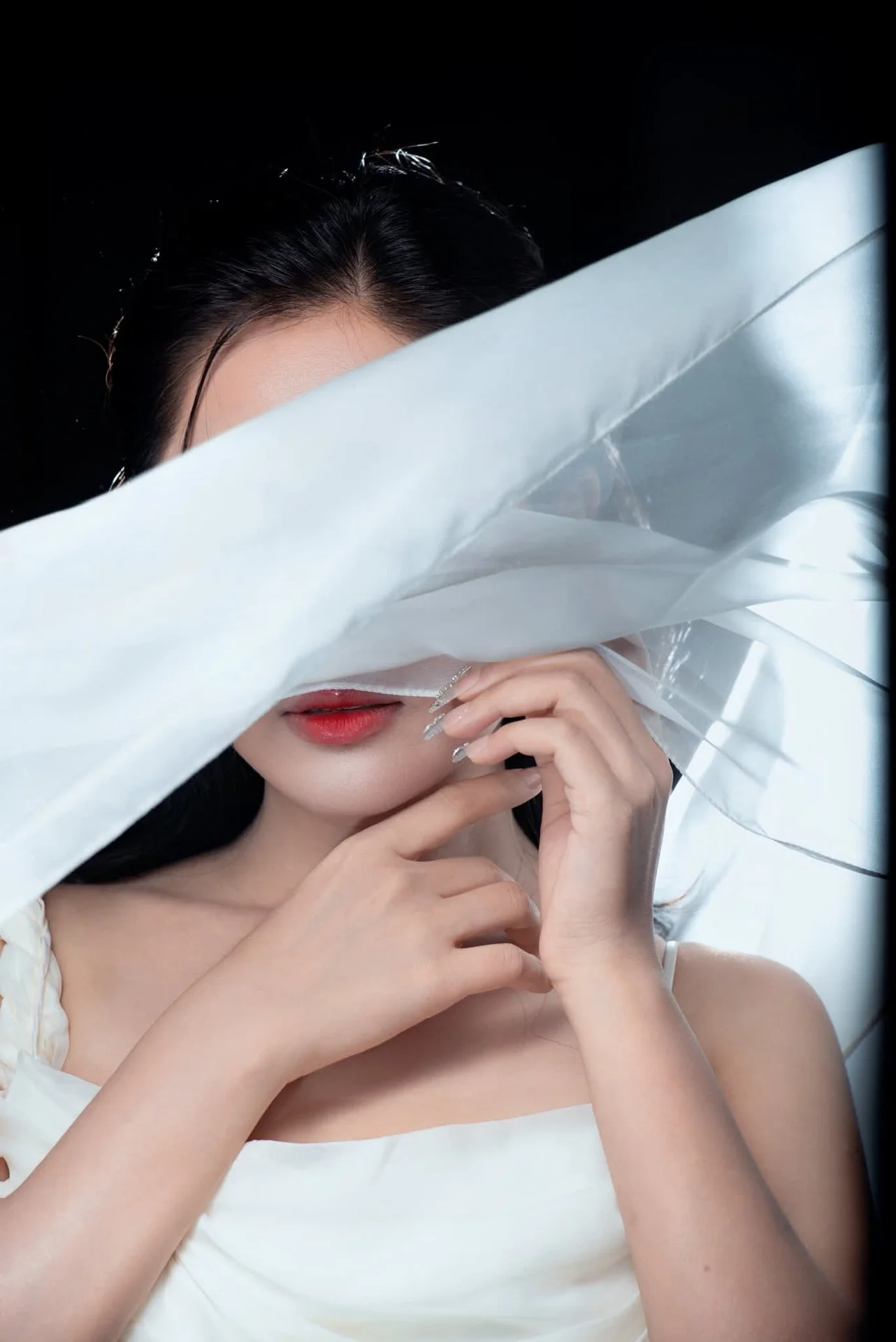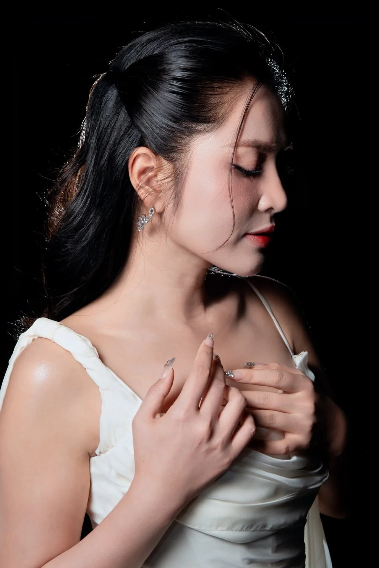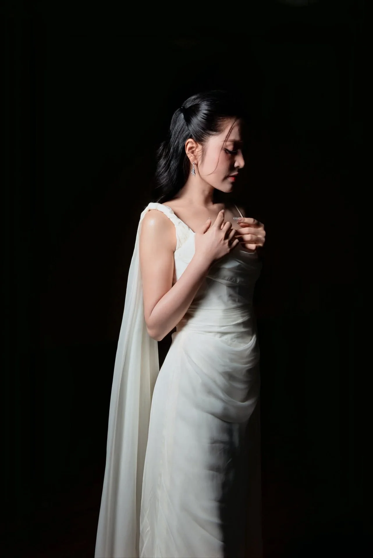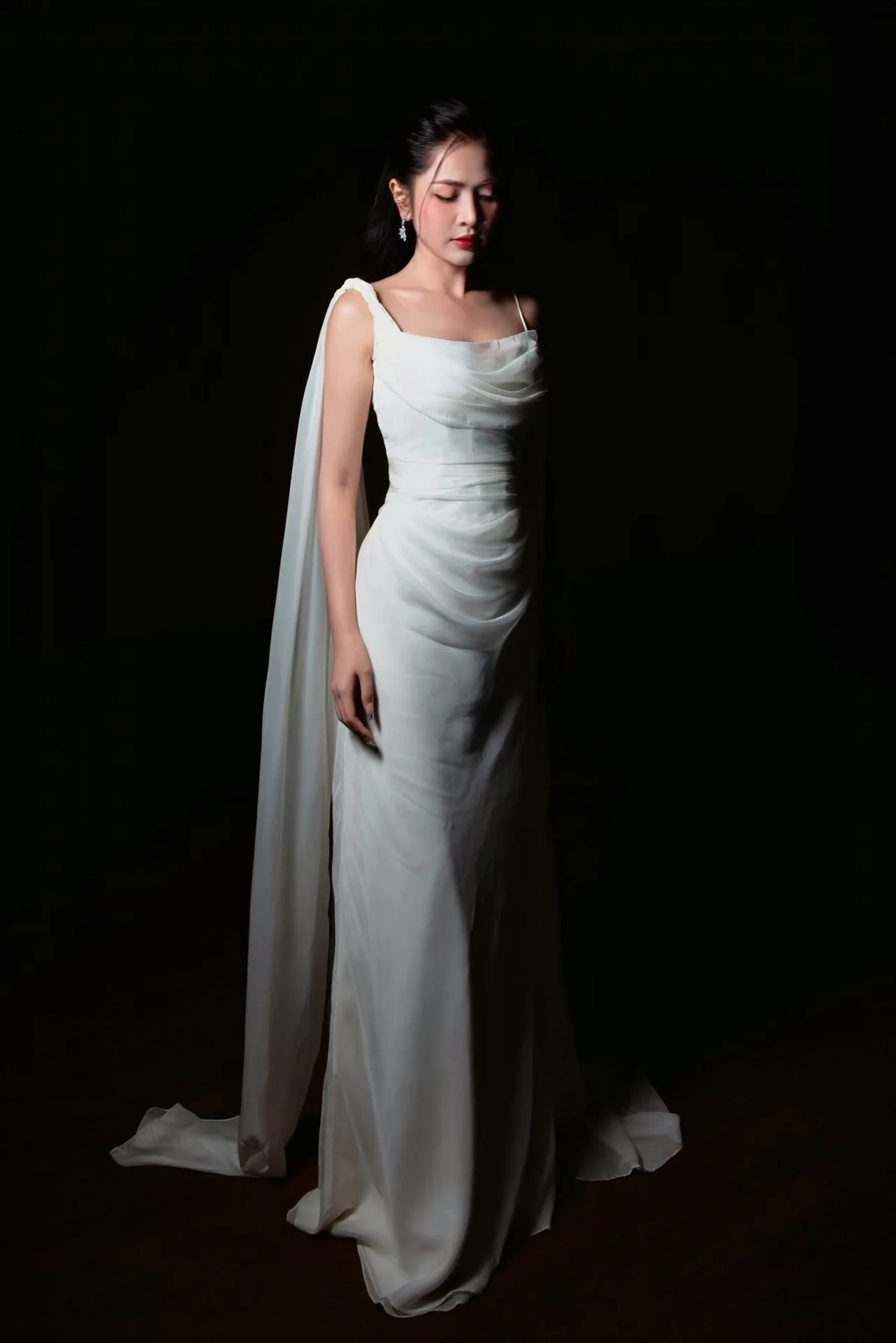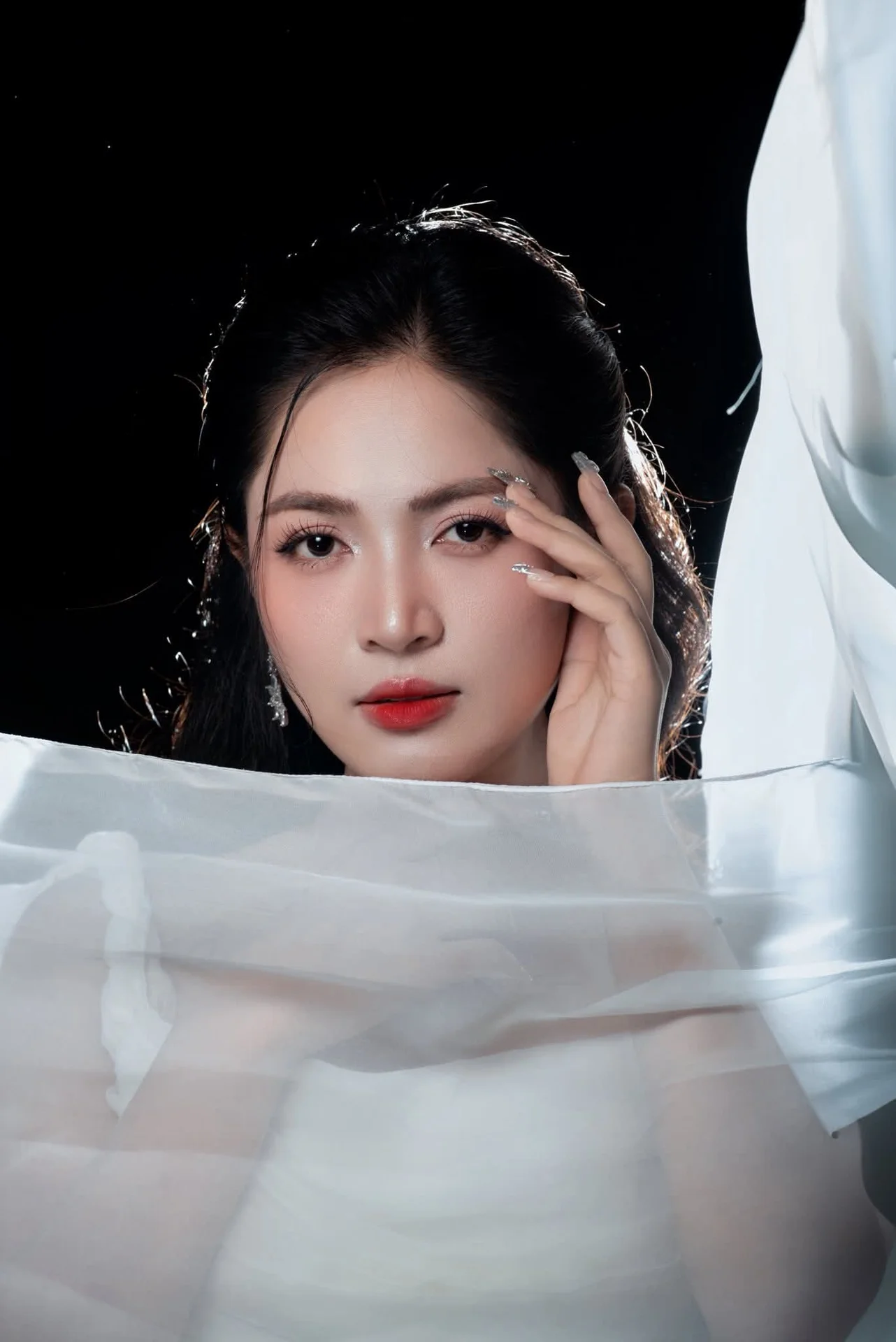 This portrait captures a moment of pure cinematic grace where fashion meets artistic movement. The subject exudes a sophisticated aura, dressed in a flowing white gown that seems to dance around her with every breath. Her expression is both captivating and serene, drawing the viewer into a world of quiet confidence and timeless beauty. The high contrast lighting beautifully highlights the delicate texture of the fabric and the subtle shimmer of her accessories, creating a striking visual balance against the dark backdrop. Every detail, from the gentle draping of the silk to her poised body language, speaks of a refined aesthetic sense. This image FB_IMG_1767930494091.jpg is a testament to the power of minimalist elegance, offering a glimpse into a soul that is as strong as it is delicate. It is a perfect inspiration for those who appreciate high fashion photography and the art of storytelling through visual style.