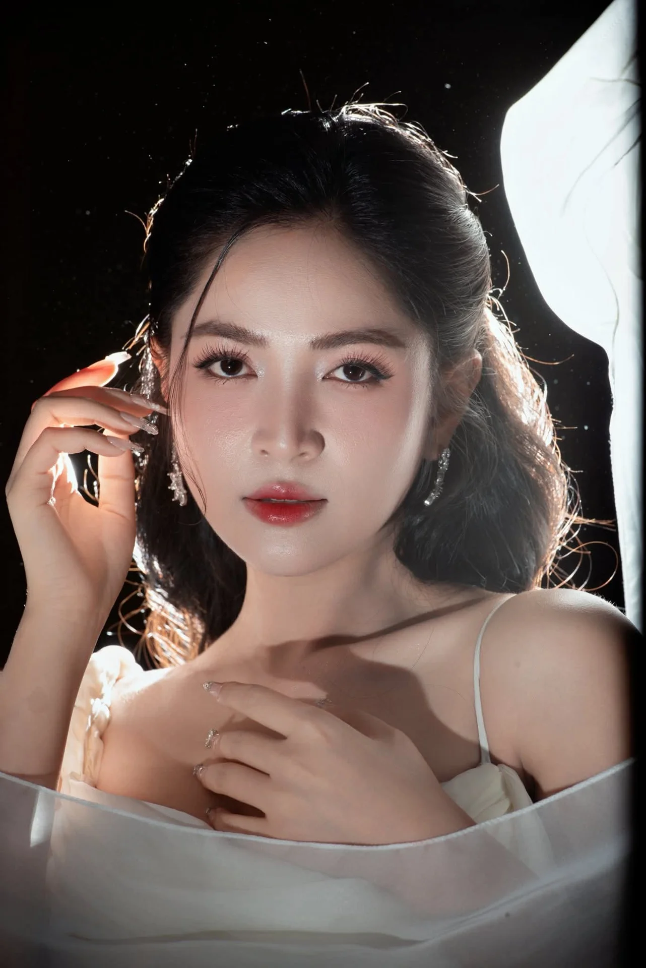Following her journey at Miss National Vietnam 2024, Cam Ly has truly blossomed, showcasing a sophisticated fashion sense and an irresistible aura. In this captivating shot, she embodies the essence of modern glamour through an all black ensemble that balances mystery and allure. The corset style bodice perfectly highlights her silhouette, while the sheer opera gloves add a touch of vintage sophistication reminiscent of classic cinema. Every detail, from the bold floral choker to the delicately patterned skirt, reflects a curated aesthetic that is both bold and refined. Her confident gaze and sharp features are beautifully accentuated by the dramatic night lighting, creating a cinematic mood that feels intimate yet grand. This look is a masterclass in styling black on black, proving that true elegance lies in the confidence of the wearer and the subtle interplay of textures and light. It is a perfect inspiration for those who love high fashion and timeless beauty.