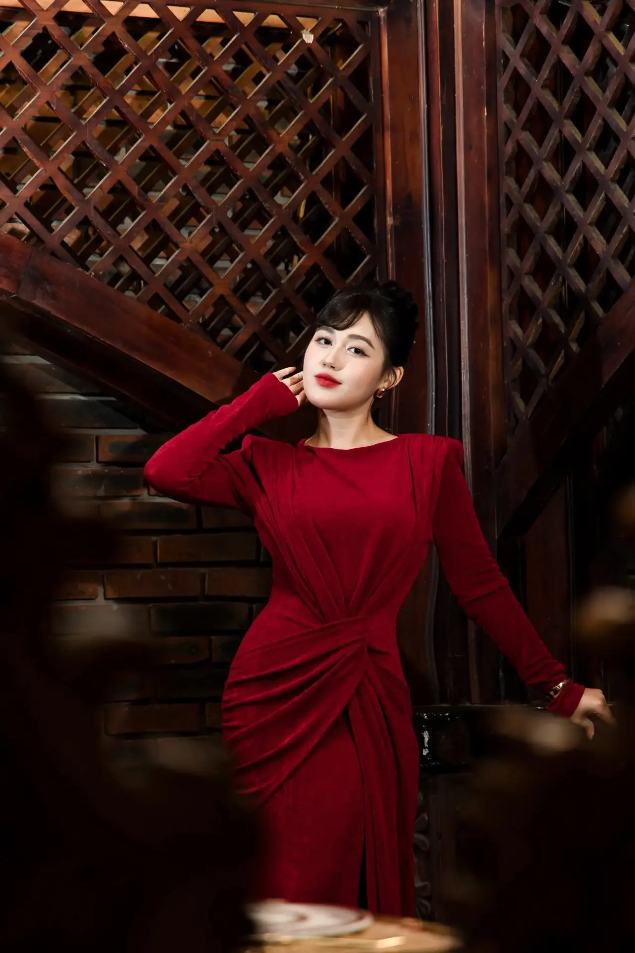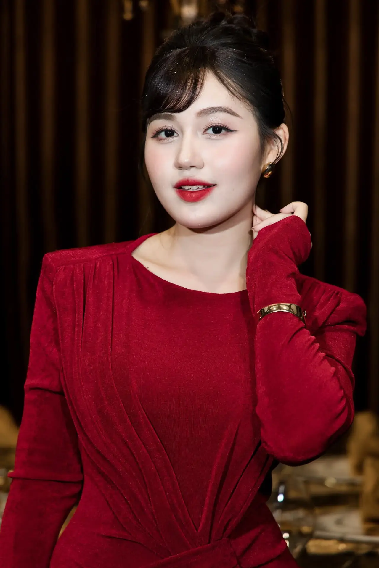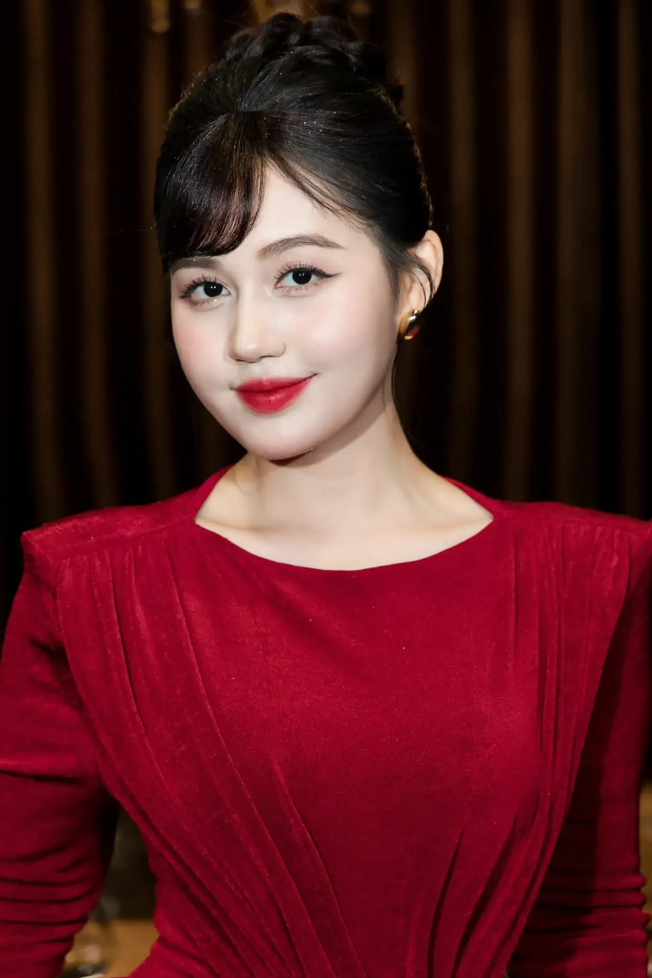 This stunning photograph captures the exquisite beauty of a young woman exuding captivating Asian charm She possesses fair smooth skin and vibrant red lipstick creating a striking focal point on her face Her gentle charming smile radiates confidence and approachability effortlessly captivating viewers The woman is adorned in an elegant deep red dress featuring a sophisticated design structured shoulders and vertical pleats that accentuate her graceful silhouette This red attire not only showcases her refined fashion sense but also highlights her alluring charisma Her dark hair is neatly styled in an updo complemented by soft bangs framing her face harmoniously The overall image portrays a modern beautiful and utterly stylish woman