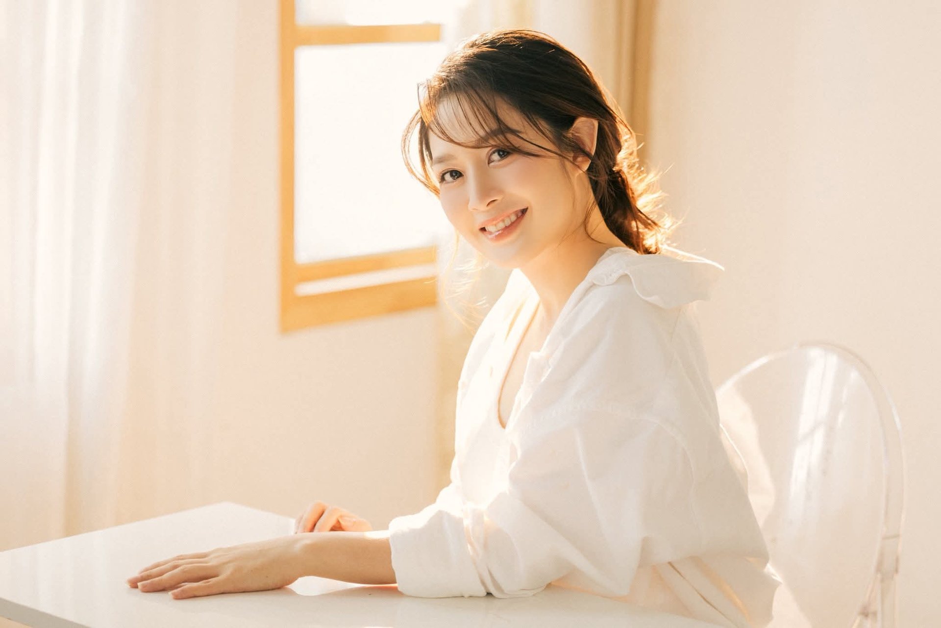 This captivating image portrays Chinese Model Xiao Jie embodying the elegant and professional essence of a modern secretary She is seated gracefully by a large window with natural light highlighting her sophisticated attire a light blue top and a formfitting white skirt Her long slender legs and high heels exude confidence and allure Her poised posture and contemplative gaze holding an object evoke a sense of thoughtful introspection Xiao Jie radiates an intellectual beauty and refined elegance presenting the image of a secretary who is not only capable but also exceptionally stylish This photograph transcends a mere moment becoming a symbol of empowered femininity stirring emotions about hidden beauty and professionalism within the corporate world