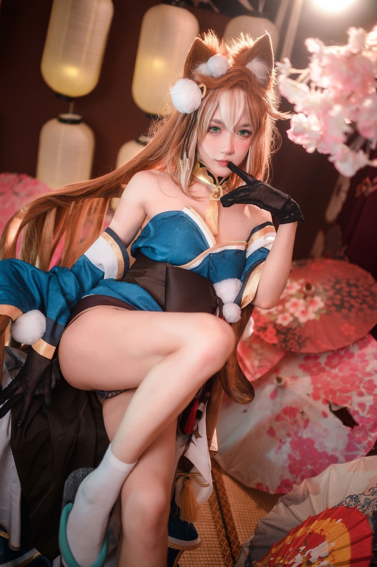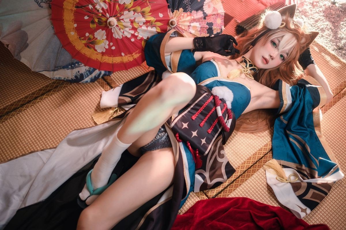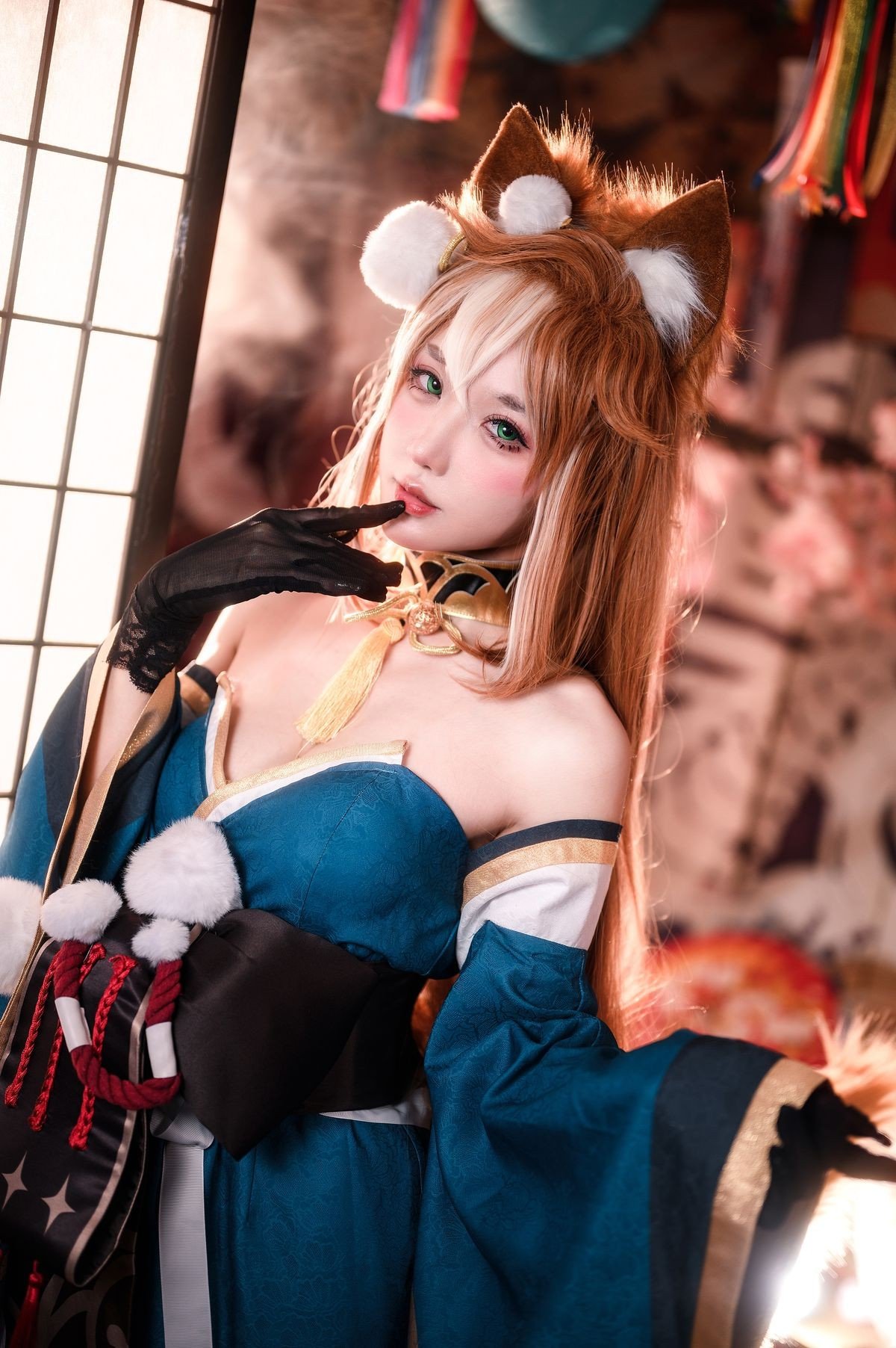 Immerse yourself in the enchanting world of Coser Baiyin as she embodies a mesmerizing shrine fox. With playful fox ears and a stylized traditional outfit she radiates a beauty that is both innocent and alluring. Baiyin's captivating figure and sweet expression bring every frame to life drawing viewers in and highlighting her charm. This outstanding transformation showcases Coser Baiyin's dedication and talent in bringing this mythical character to life. It offers a superb visual experience for fans of cosplay and Japanese culture celebrating the artistry and appeal of her portrayal.