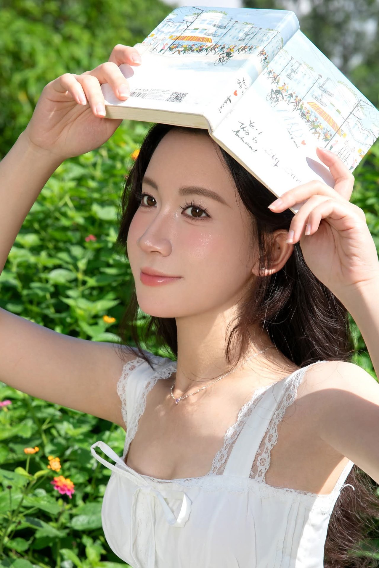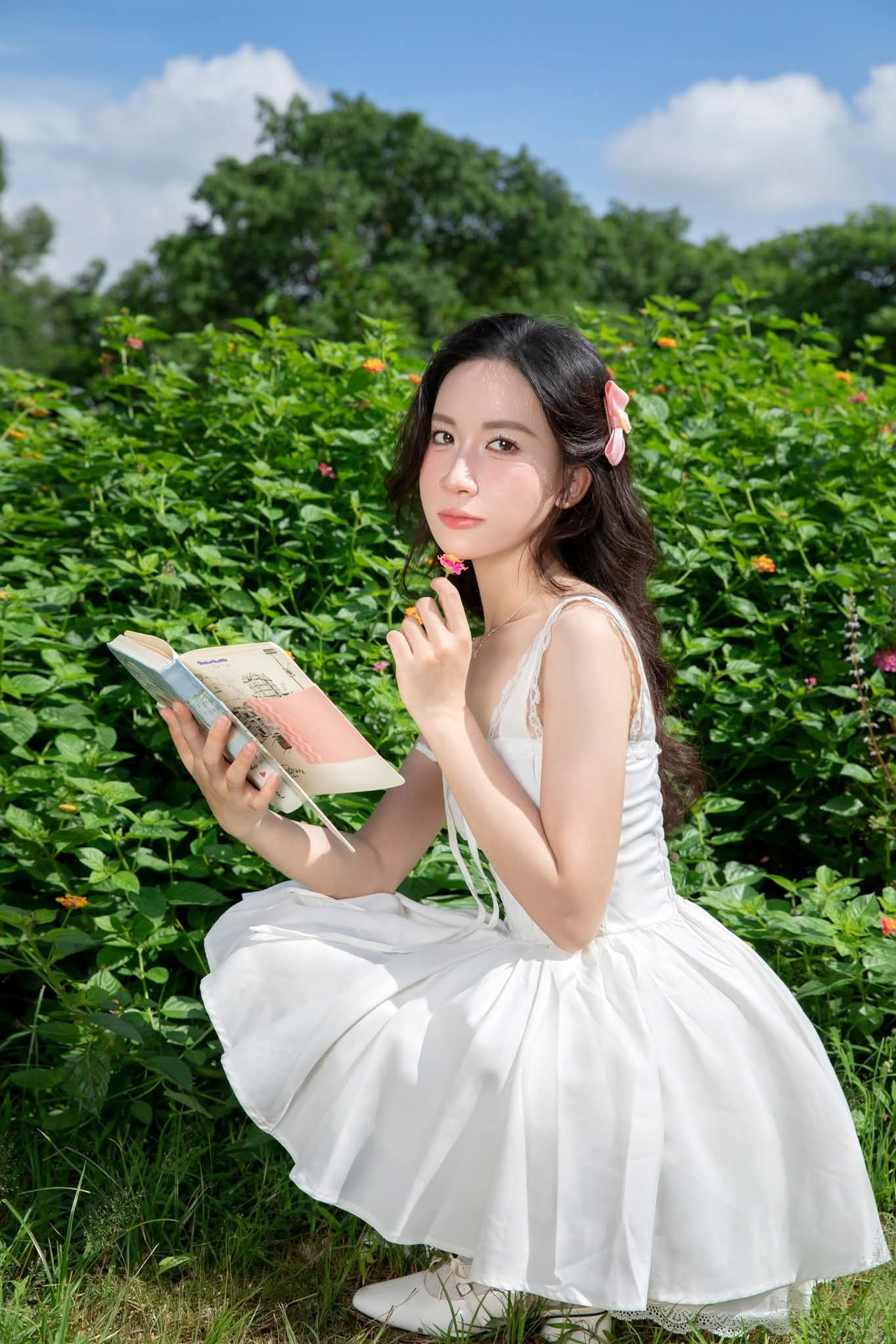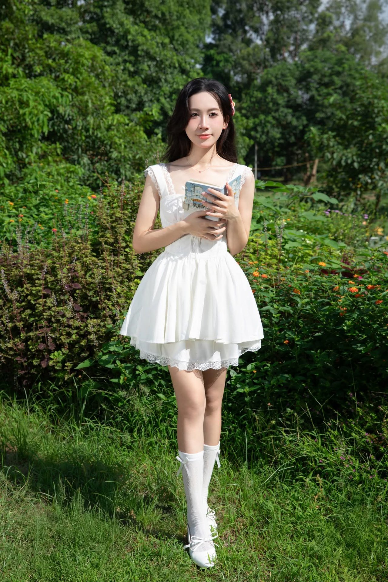 This image captures a gentle moment of a young woman in a pristine white dress, standing amidst the lush green embrace of nature. Her graceful beauty blends seamlessly with the vibrant hues of the trees and grass, creating a truly poetic scene. The flowing white dress and knee-high socks accentuate her innocence and charm. Holding a book in her hands, she appears to be enjoying peaceful, tranquil moments within the garden. The picture evokes a sense of lightness, purity, and refined summer fashion, perfect for those who appreciate natural beauty and elegant style.Serene Natural Beauty: Gentle Girl in Cream Dress Amidst Lush Garden