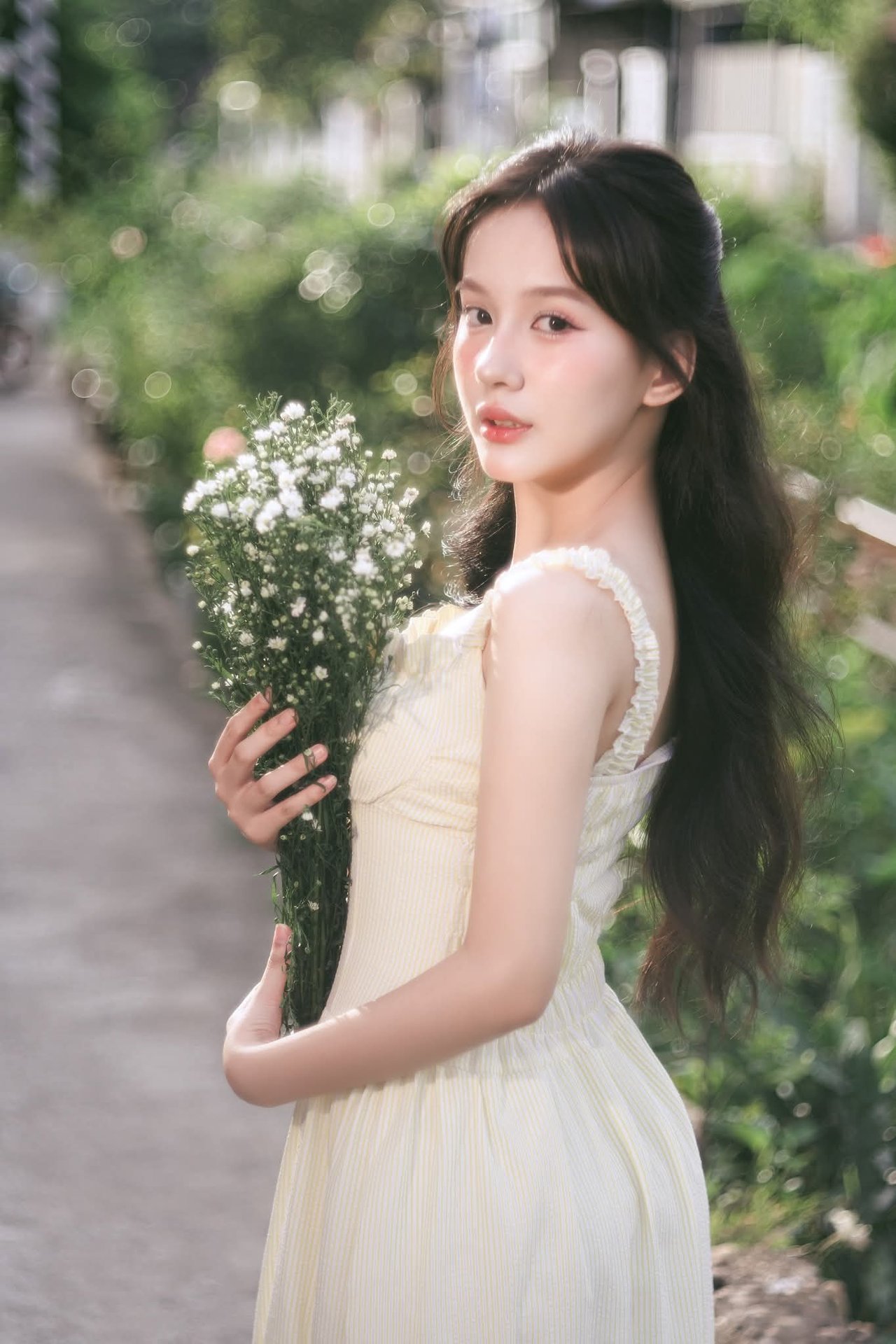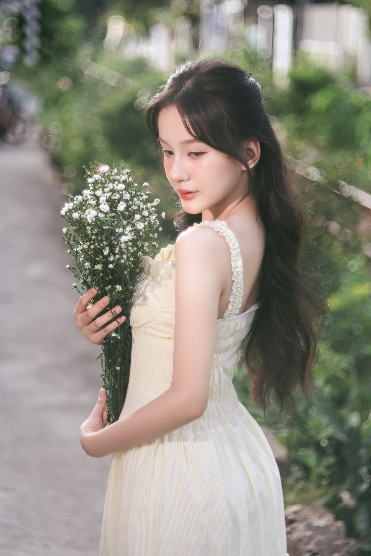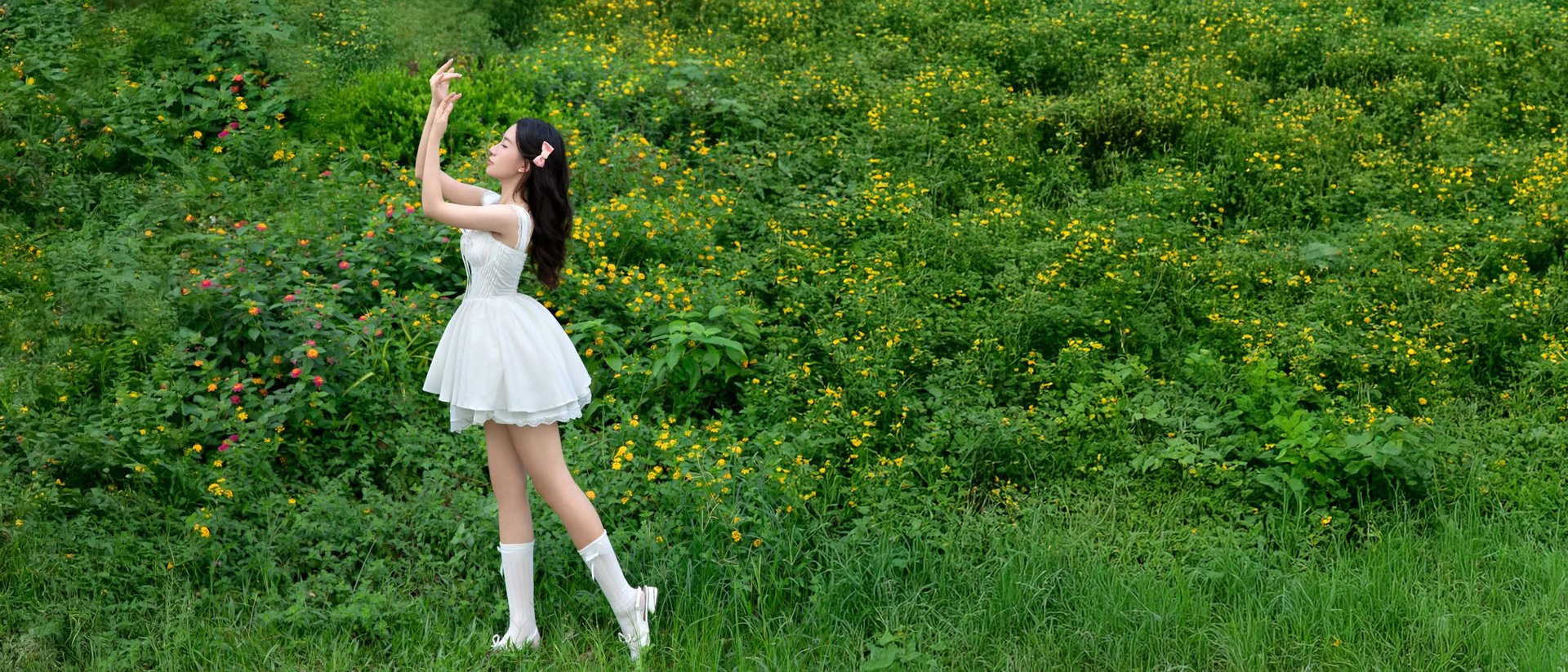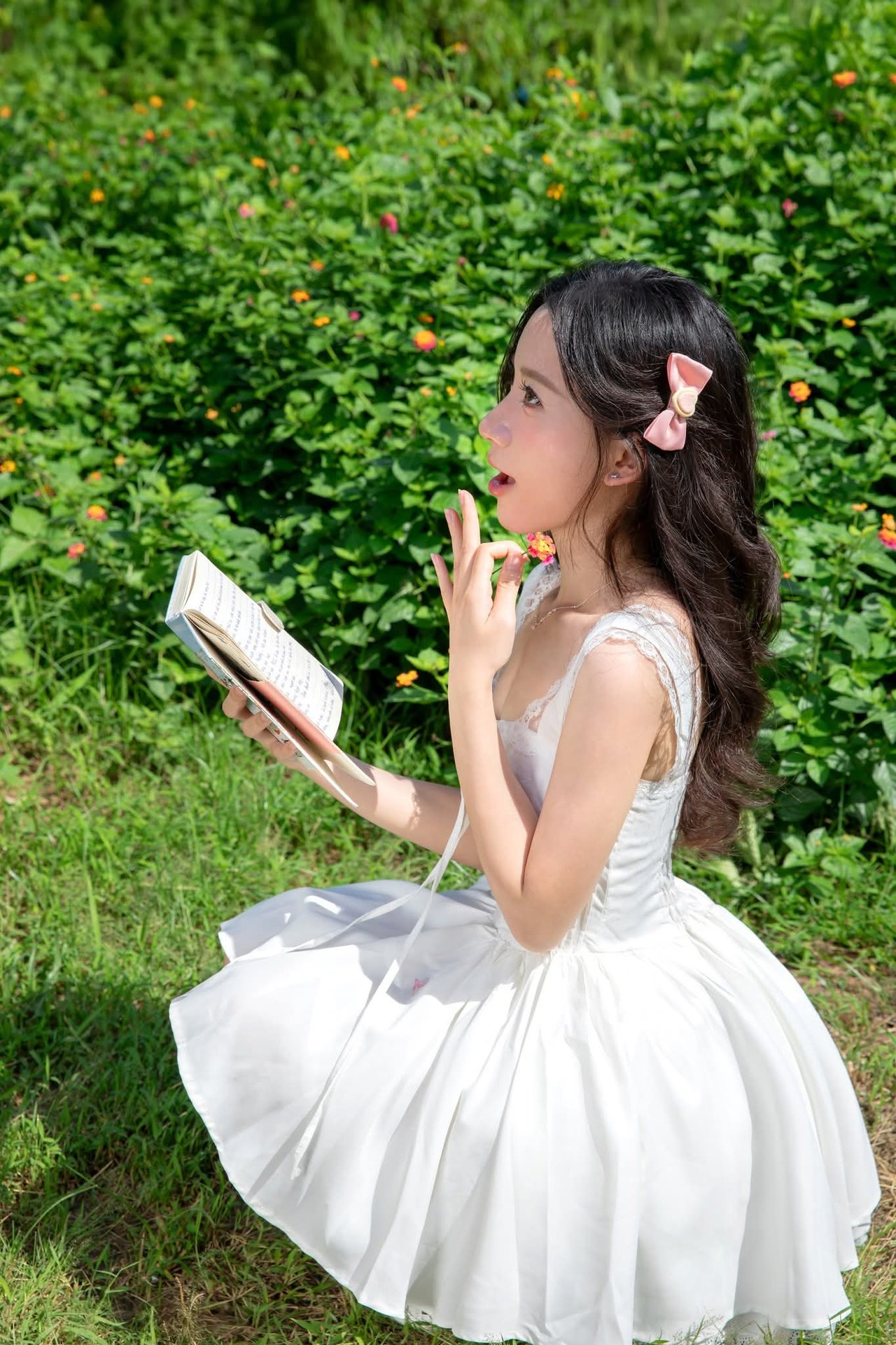 This image captures a gentle moment of a young woman in a pristine white dress, standing amidst the lush green embrace of nature. Her graceful beauty blends seamlessly with the vibrant hues of the trees and grass, creating a truly poetic scene. The flowing white dress and knee-high socks accentuate her innocence and charm. Holding a book in her hands, she appears to be enjoying peaceful, tranquil moments within the garden. The picture evokes a sense of lightness, purity, and refined summer fashion, perfect for those who appreciate natural beauty and elegant style.Serene Natural Beauty: Gentle Girl in Cream Dress Amidst Lush Garden