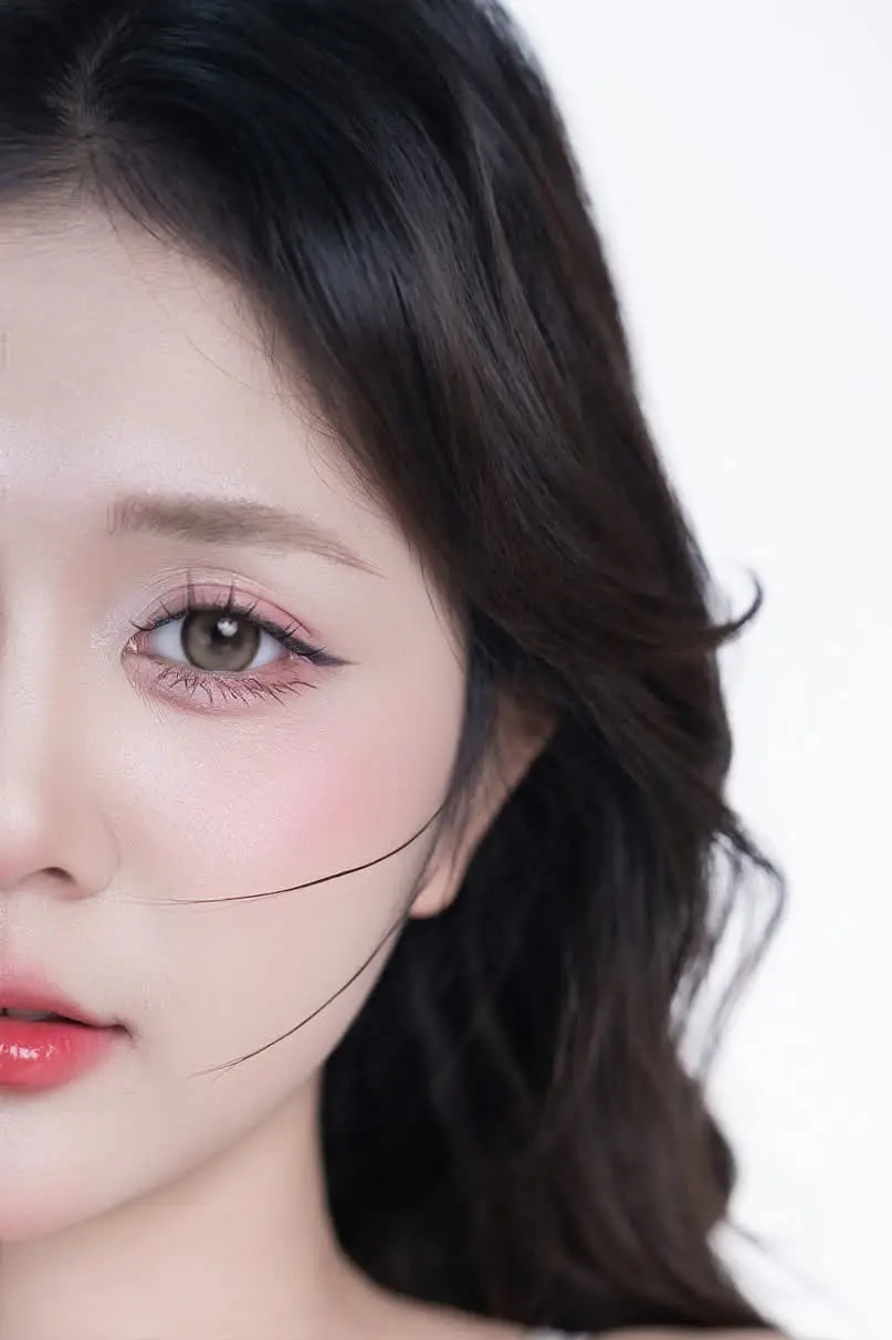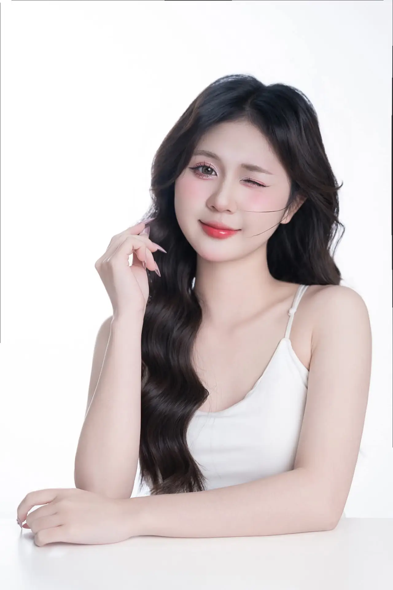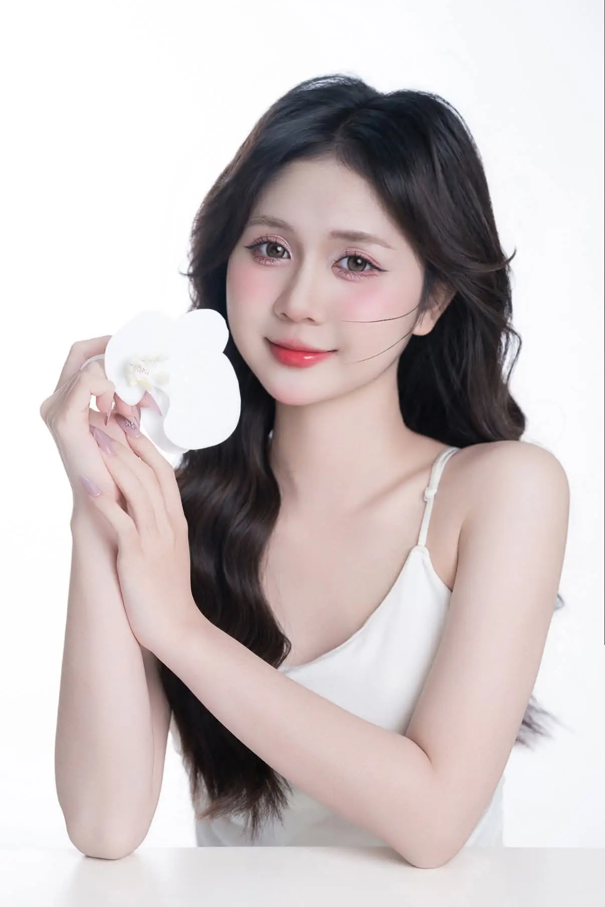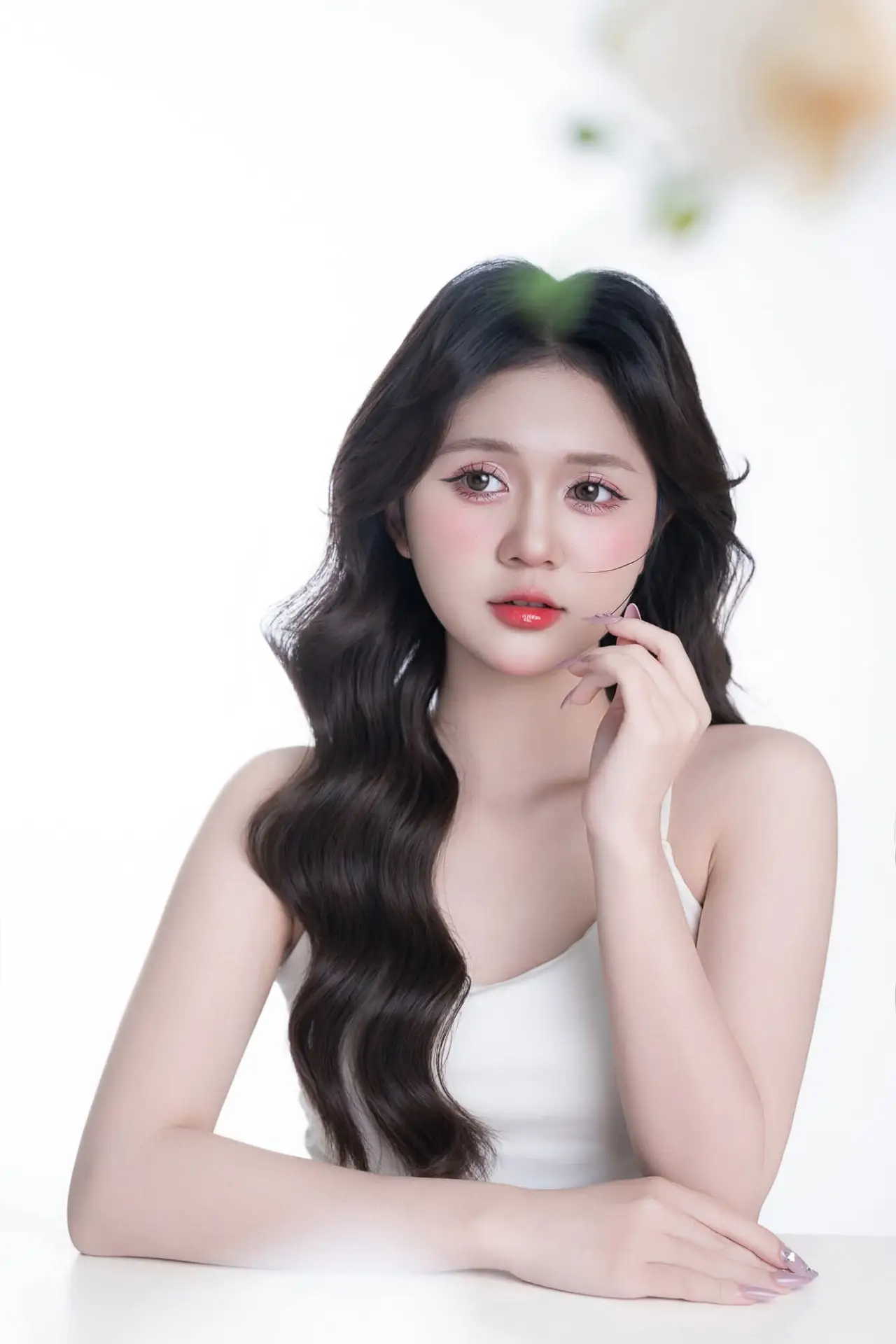 This photo captures the ethereal and gentle beauty of a young woman. With her flowing dark hair and fair, smooth skin, she exudes a pure and innocent charm. Her eyes gaze directly into the camera, full of captivating confidence yet incredibly soft. Her hands are delicately placed near her face, creating an elegant and feminine pose. The pristine white studio background further highlights her flawless natural beauty. Overall, the image conveys a sense of lightness and purity, evoking admiration for her elegant Asian features. This portrait represents grace and sophistication, drawing every eye.#VietnameseBeauty #Muse #Portrait #BeautyPhotography #GentleBeauty