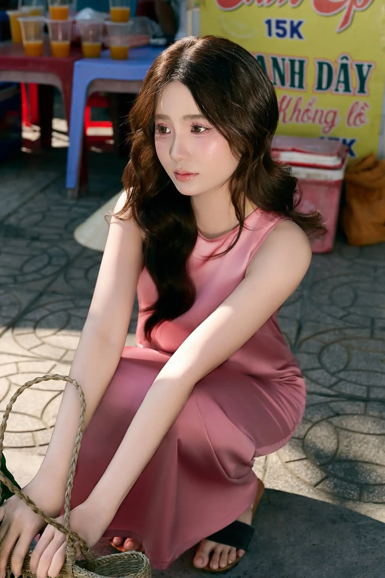 This photo captures a serene moment of a young woman with natural beauty and flowing hair. She wears a delicate pink dress, highlighting her slender figure and fair skin. Her gentle smile and clear eyes create an irresistible charm. Natural light from above illuminates her facial features and lustrous hair. The simple background of a small alleyway or staircase adds to the rustic, approachable feel of the image. The girl exudes elegance, femininity, and a touch of dreaminess, leaving viewers captivated. This image represents pure, gentle, and utterly captivating East Asian beauty.