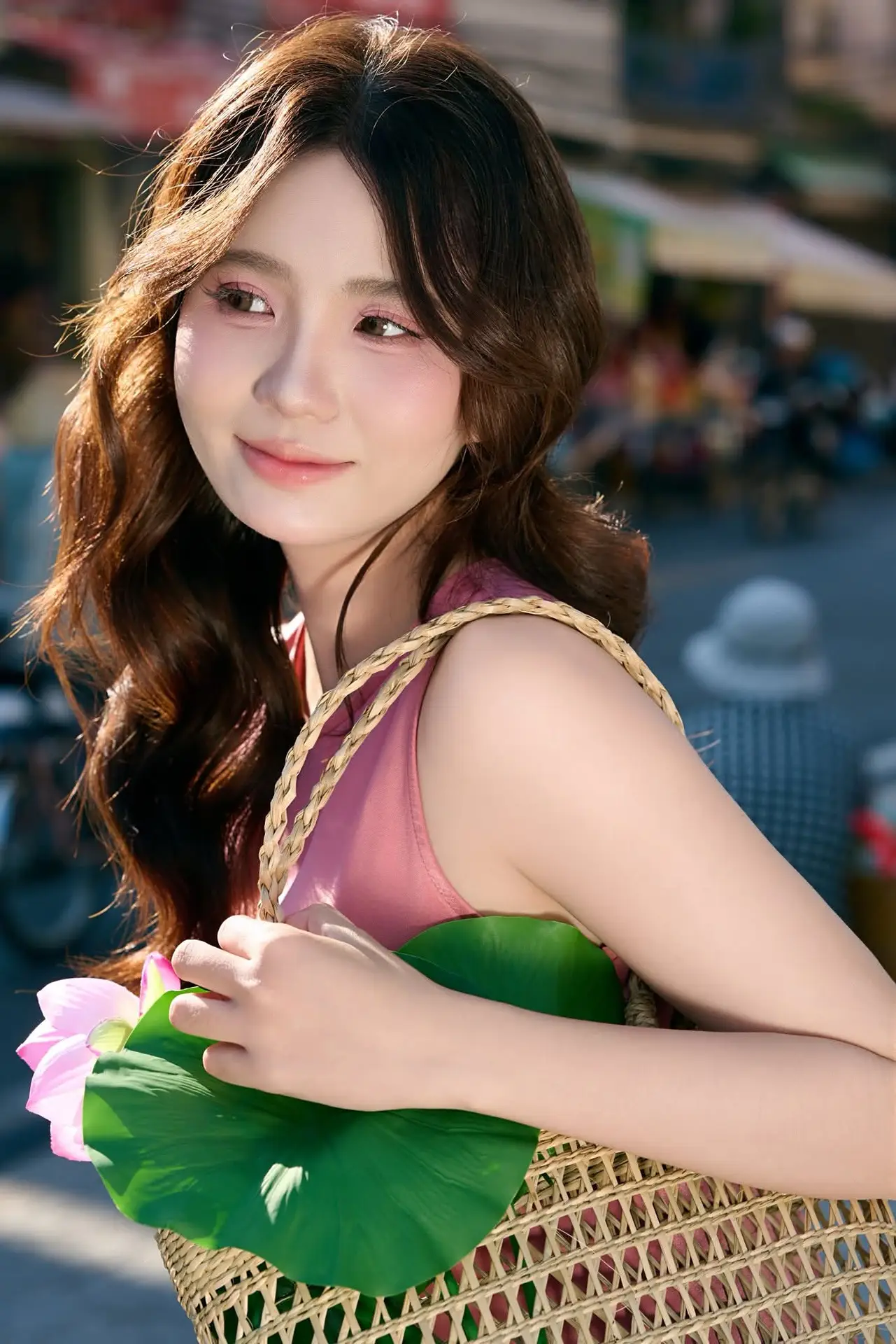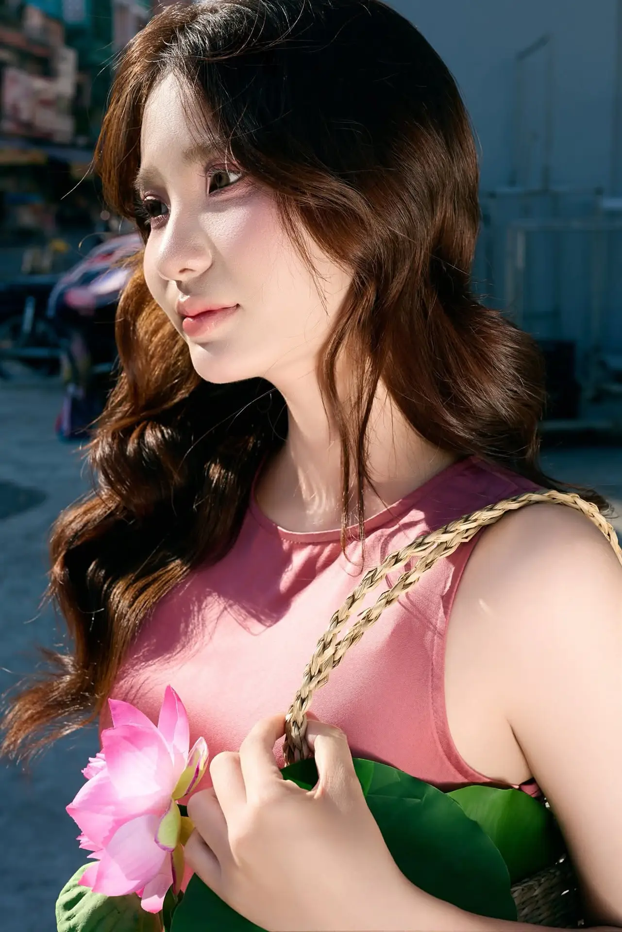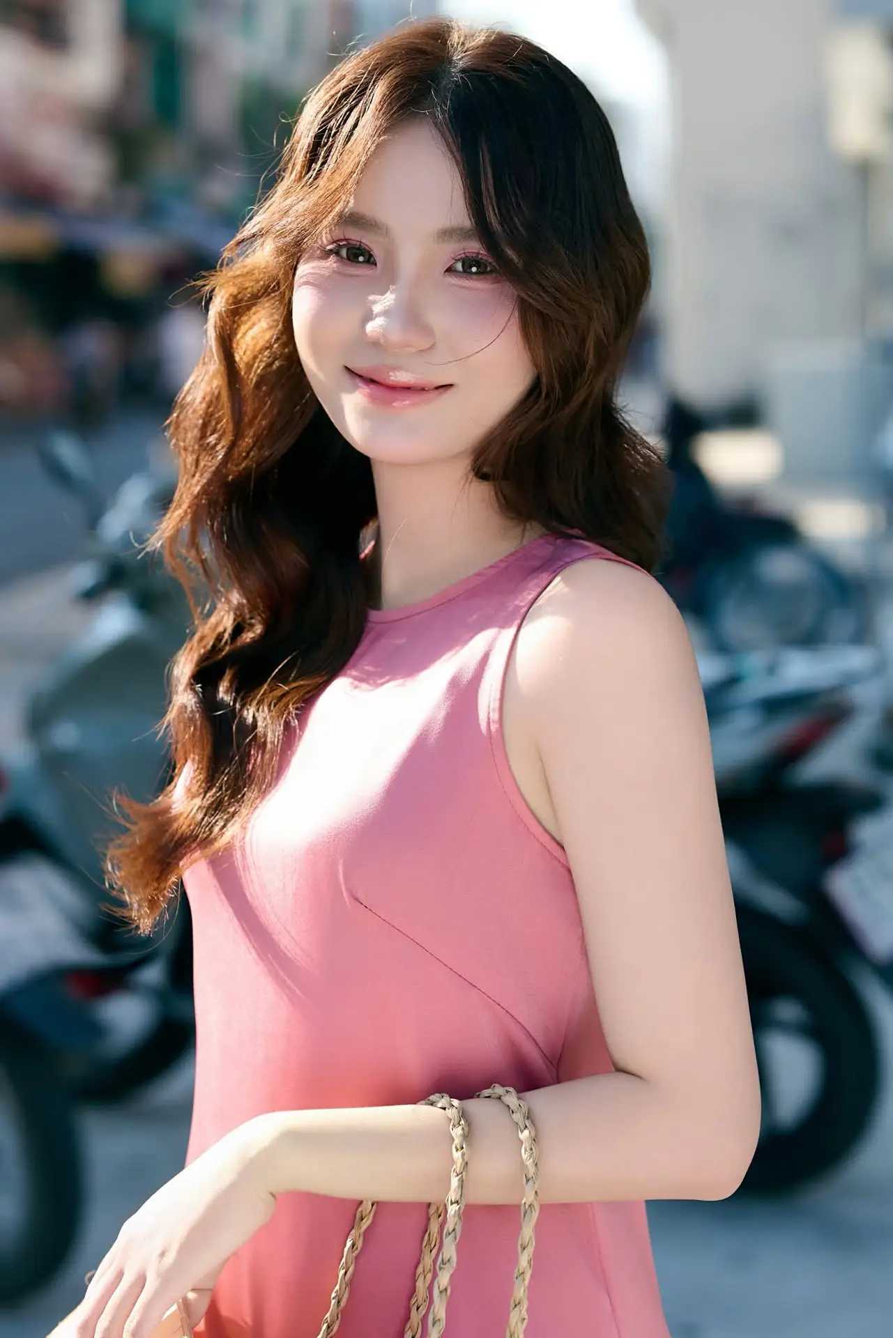 This beautiful image captures a serene moment of a young woman exuding elegant and gentle beauty. Dressed in a chic pastel pink gown, she embodies femininity and purity. Her soft smile, clear eyes, and flowing dark hair enhance her natural charm. She delicately holds a few light pink flowers, creating a romantic and poetic scene. The photograph not only showcases exquisite fashion style but also vividly portrays her fresh and radiant demeanor, evoking a sense of peace and pristine beauty. This image represents timeless grace and captivating allure, drawing every gaze.