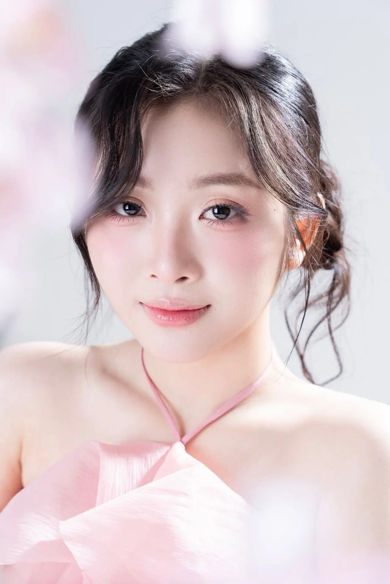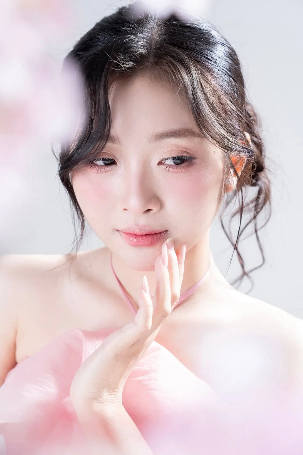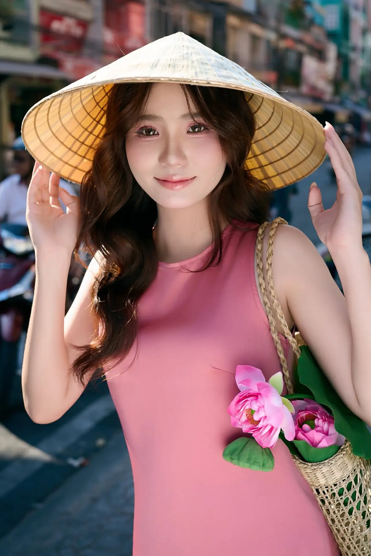 This beautiful image captures a serene moment of a young woman exuding elegant and gentle beauty. Dressed in a chic pastel pink gown, she embodies femininity and purity. Her soft smile, clear eyes, and flowing dark hair enhance her natural charm. She delicately holds a few light pink flowers, creating a romantic and poetic scene. The photograph not only showcases exquisite fashion style but also vividly portrays her fresh and radiant demeanor, evoking a sense of peace and pristine beauty. This image represents timeless grace and captivating allure, drawing every gaze.