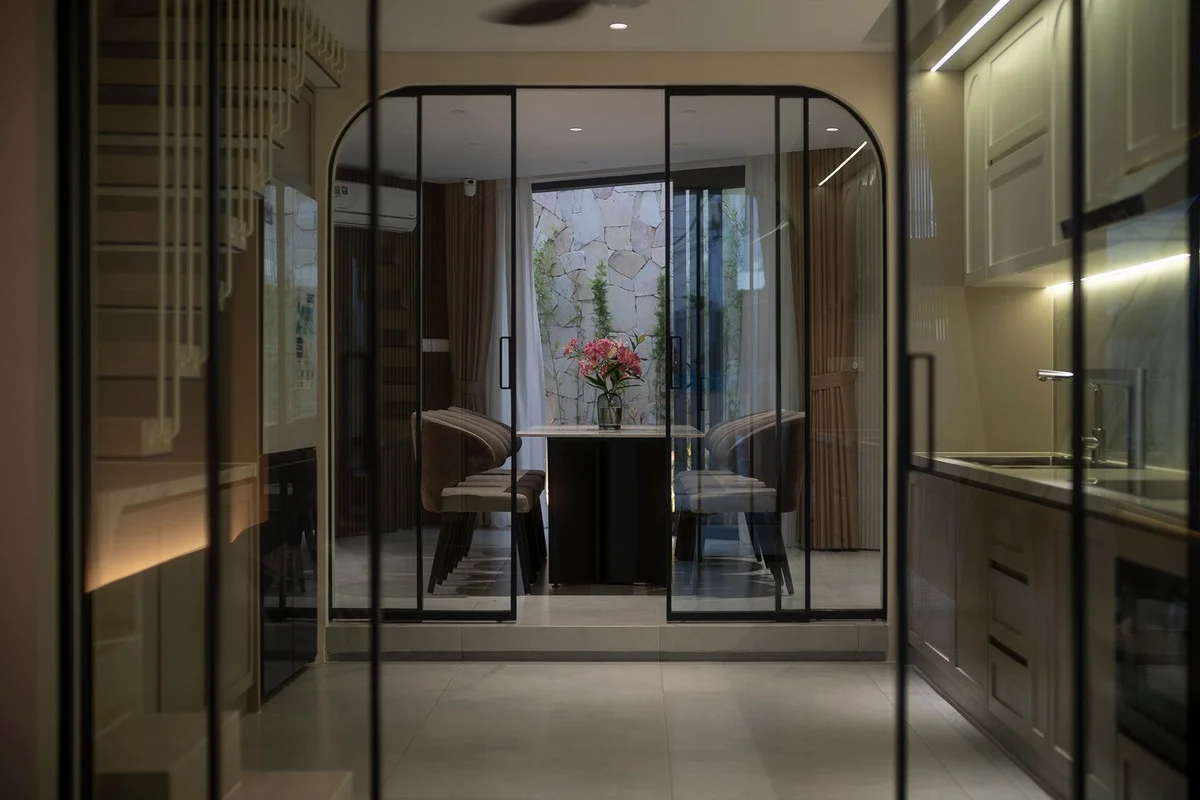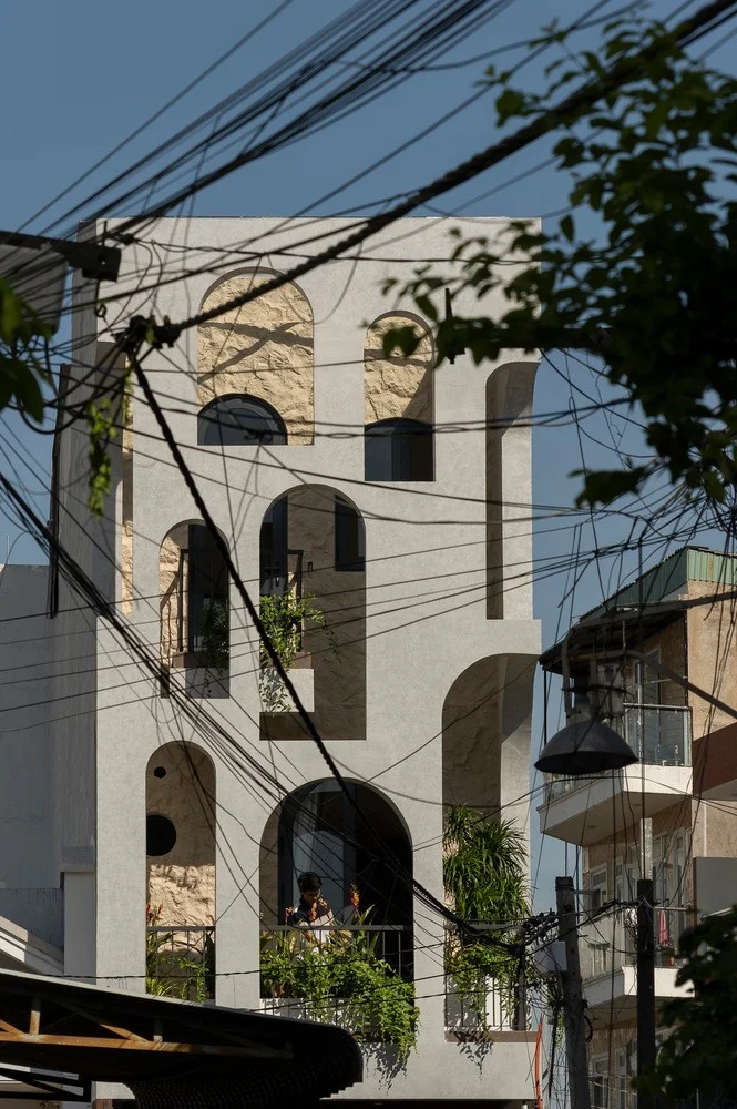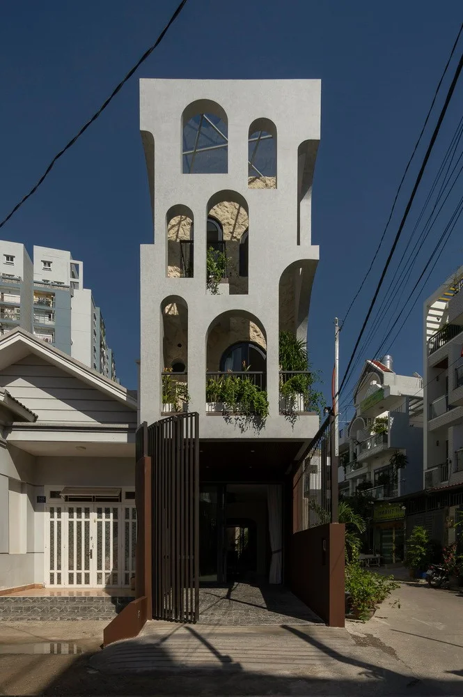 This image captures the unique architectural beauty of a modern tube house, where soft arched openings embrace the exterior space. Through these arched frames, natural light floods in, illuminating every corner and creating an airy and fresh atmosphere. The view opens up to a clear blue sky, dotted with lush green trees, bringing a sense of relaxation and peace amidst the urban landscape. The arched facade design is not only an effective solution for natural light and ventilation but also an artistic highlight, optimizing living space and subtly connecting people with nature. This is truly an ideal living space, full of positive energy.#ModernTubeHouse #ArchedArchitecture #LightFilledHome #UniqueDesign #GreenLivingSpace