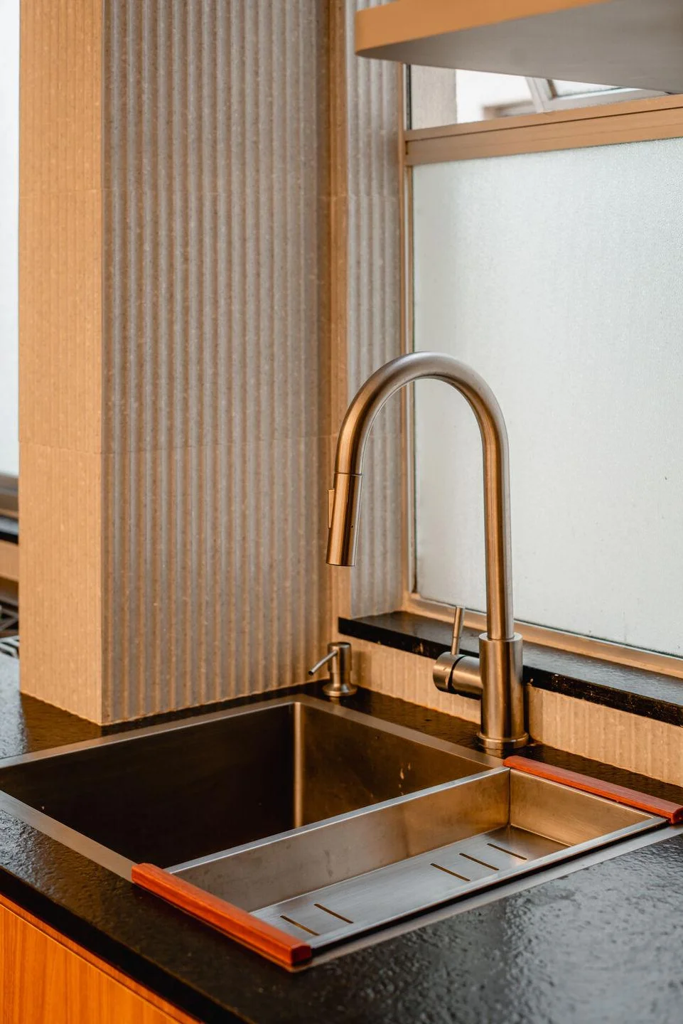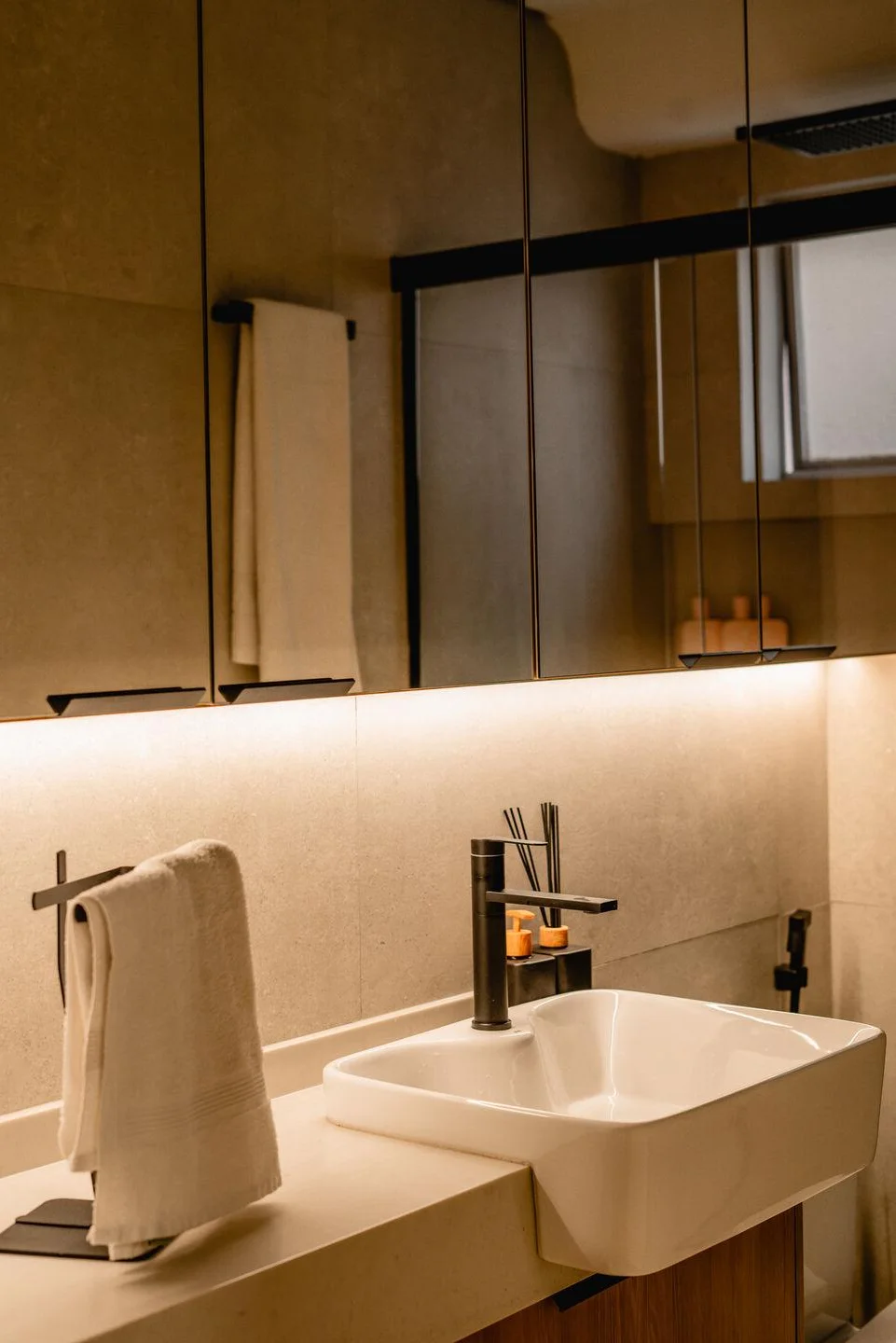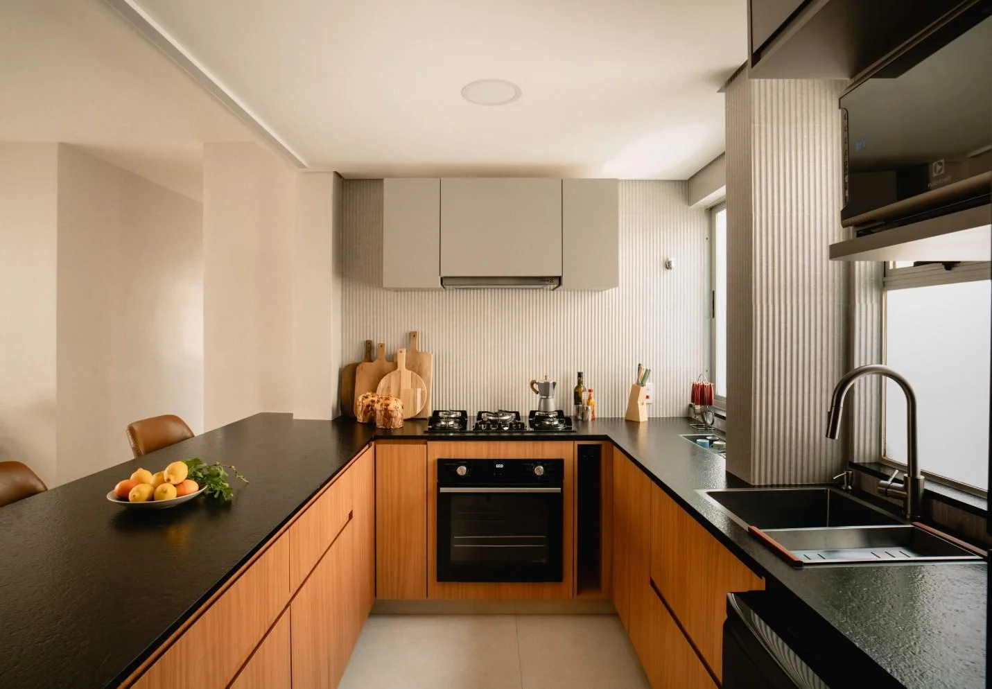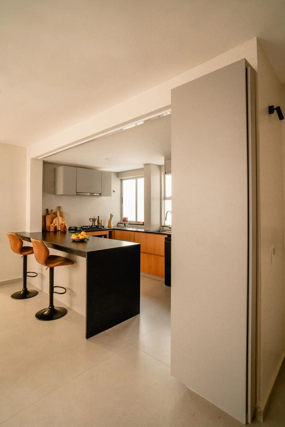 Stepping into this space, one immediately feels a sense of freedom and warmth flowing through every corner. By removing rigid partition walls, the 150m2 layout has been truly liberated, turning the kitchen into the vibrant heart of the home. Natural light from the windows blends seamlessly with sophisticated integrated lighting, highlighting neutral tones and the rustic wooden textures of the cabinetry. The earthy orange bar stools act as a striking visual accent, reflecting a youthful spirit and the owner's modern aesthetic. This is not just a place for cooking but a peaceful sanctuary where family members gather to share daily stories in a minimalist yet incredibly refined atmosphere. Every detail, from the open layout to the color palette, has been carefully curated to create a harmonious and inspiring environment for those seeking contemporary home renovation ideas.#HomeInspiration #MinimalistDesign #KitchenGoals #ApartmentTherapy #ContemporaryStyle