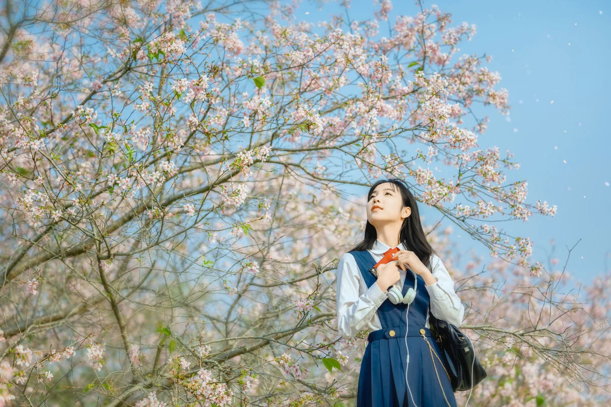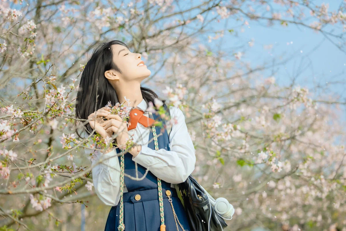 Captured in the heart of a blooming spring garden, this moment feels like a gentle whisper from nature itself. Jian Xiao Cheng embodies the essence of a spring messenger, dressed in a timeless school uniform that evokes a deep sense of nostalgia and purity. The crisp white shirt paired with a deep navy skirt and a vibrant red bow creates a classic visual harmony, perfectly blending with the soft pastel tones of the cherry blossoms in the background. Her serene expression and graceful posture reflect a deep connection with the surroundings, showcasing the sophisticated visual style of YiTuYu Art Language Vol.8920. The soft bokeh effect and warm sunlight enhance the ethereal vibe, making this more than just a photograph, it is a poetic expression of youth and the fleeting beauty of the season. This aesthetic captures the heart of minimalist yet emotional storytelling, inviting the viewer to lose themselves in the tranquility of a perfect spring afternoon where every petal tells a story of rebirth and tenderness.