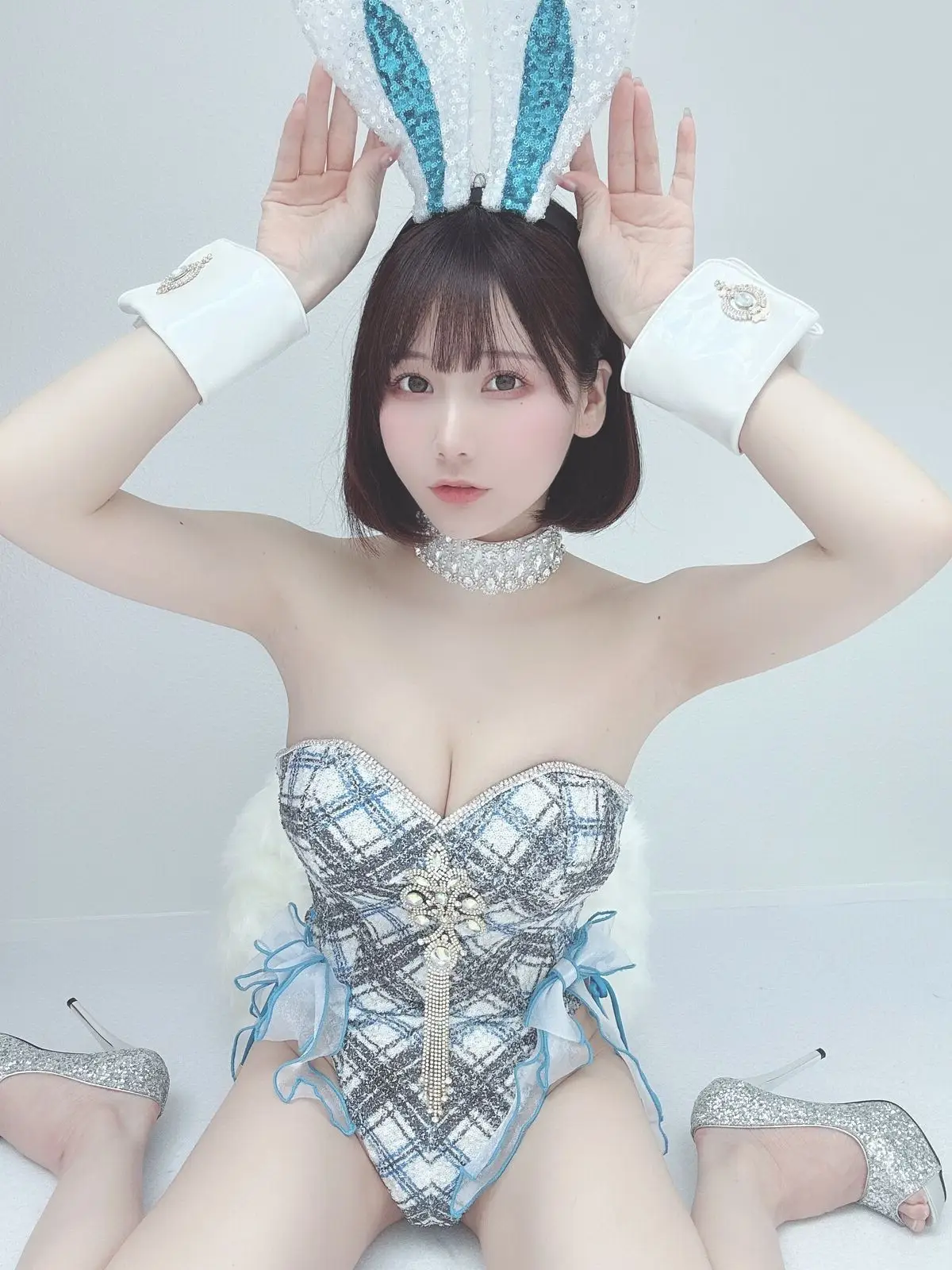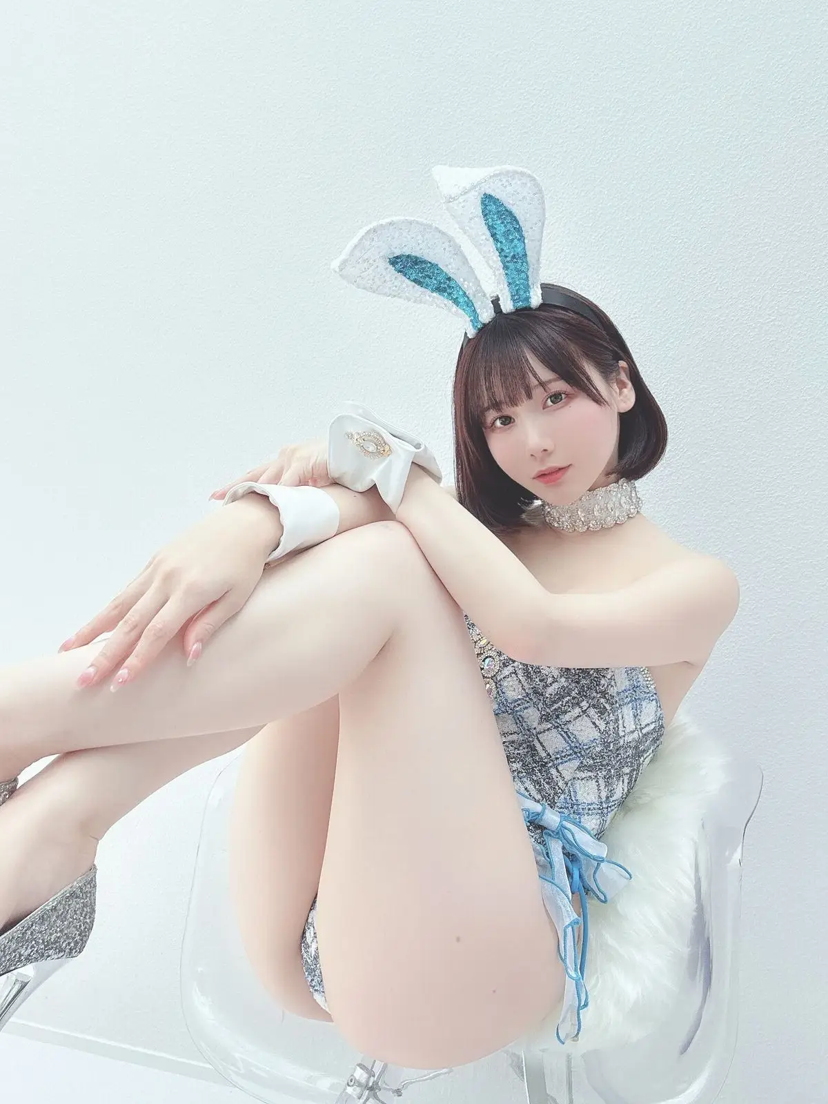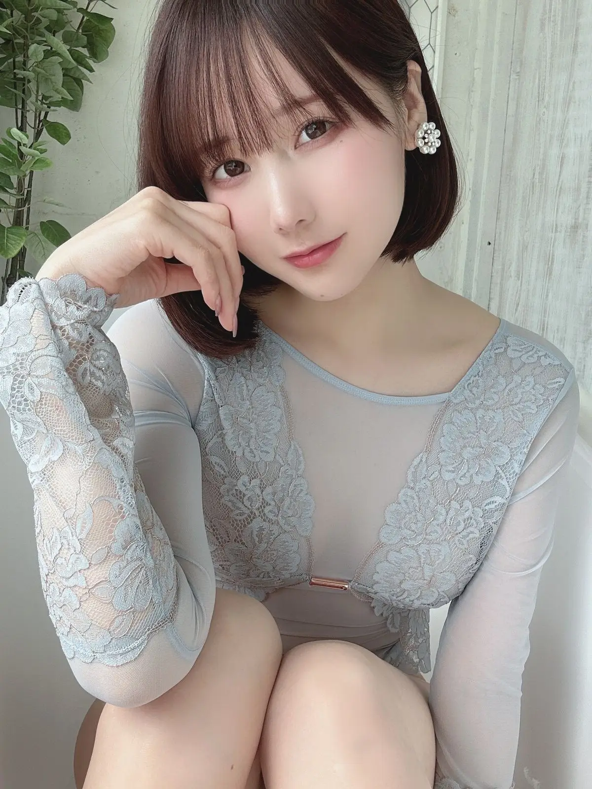 In this captivating image, Coser Ken Ken (けん研 けんけん) radiates a serene and alluring beauty. Her gentle gaze and subtle smile invite viewers in, while her short, stylish hair and delicate sheer lace top in a soft blue-grey hue highlight her graceful charm. Every detail, from the pearl earring to her elegant pose, contributes to an aura of sophistication and subtle allure. This picture is part of her exclusive 2023.05 Fantia Part03 collection, promising an exquisite blend of artistry and emotion for her devoted fans. Ken Ken’s natural elegance paired with a tastefully sensual fashion choice makes her a compelling focal point.
