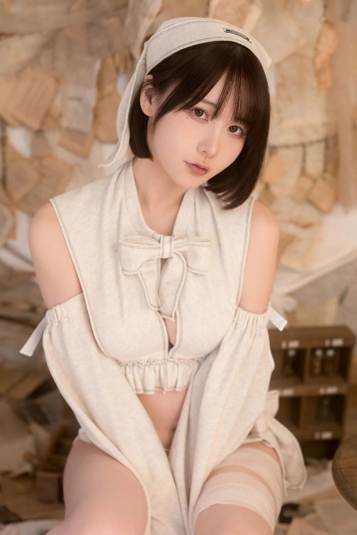 This captivating image is part of Coser@けん研 けんけん's Fantia 2023.10 Part03 collection showcasing a sweet and enchanting beauty. The character is portrayed with an elegant demeanor wearing a soft cream-colored outfit adorned with delicate ruffles and bows evoking the image of a classic doll or a charming maid. Gentle diffused lighting bathes the scene creating a dreamy and ethereal atmosphere that highlights けんけん's porcelain skin and clear eyes. Every detail from her sleek bob haircut to her stylish high heels contributes to a harmonious overall look exuding grace and allure. This is more than just a photograph it is an artistic piece where けんけん fully expresses her unique charisma and distinctive style leaving viewers captivated and eager to explore more from this remarkable collection.