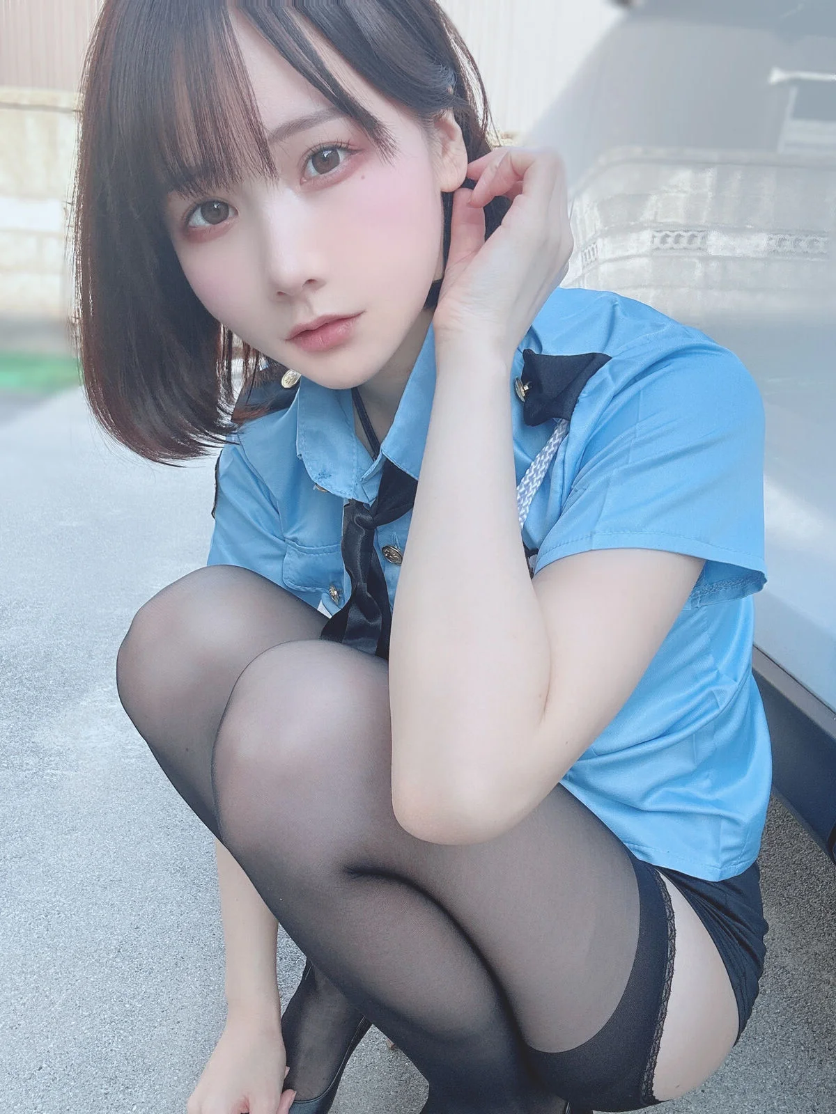 This image features Coser@けん研 けんけん, a familiar face from the Fantia 2023.11 Part01 collection, in an incredibly cute and playful police girl cosplay. With a gentle smile, clear eyes, and rosy cheeks, she exudes an innocent yet captivating charm. The familiar blue police uniform is subtly paired with a dark tie and sheer stockings, creating an image that is both serious and gracefully alluring. Her graceful sitting pose and neat short hair further highlight her youthful energy dynamism and distinctive style. This is undoubtedly a beloved moment, showcasing the coser's skill and confident aura, drawing all eyes to her.