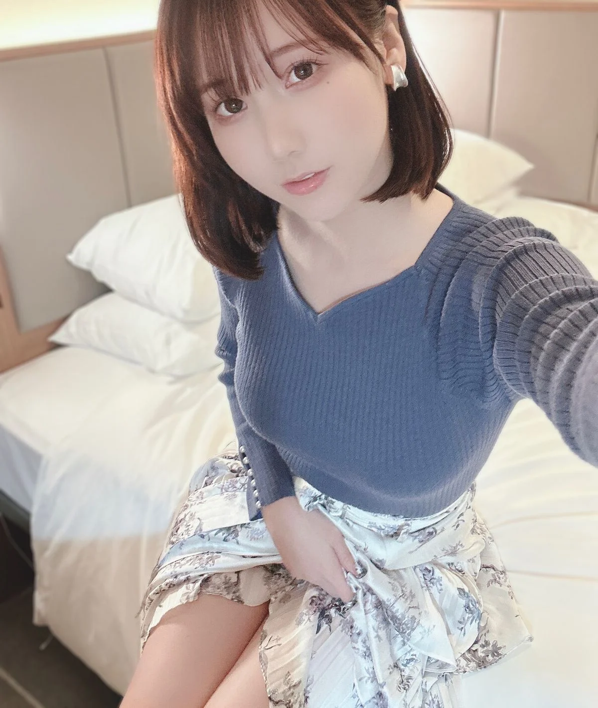 This stunning portrait features Coser けん研 けんけん, exuding a gentle yet captivating beauty. Her deep gaze and subtle smile hint at a playful allure, inviting viewers to explore. She skillfully showcases her figure in a delicate blue V-neck knit top, paired with a unique patterned skirt, creating a style that is both elegant and subtly sensual. Her leaning posture and gentle hand placement further enhance her grace and femininity. This Fantia 2023.01 Part01 collection promises to deliver emotional and artistic moments, captivating every eye with its charm.
