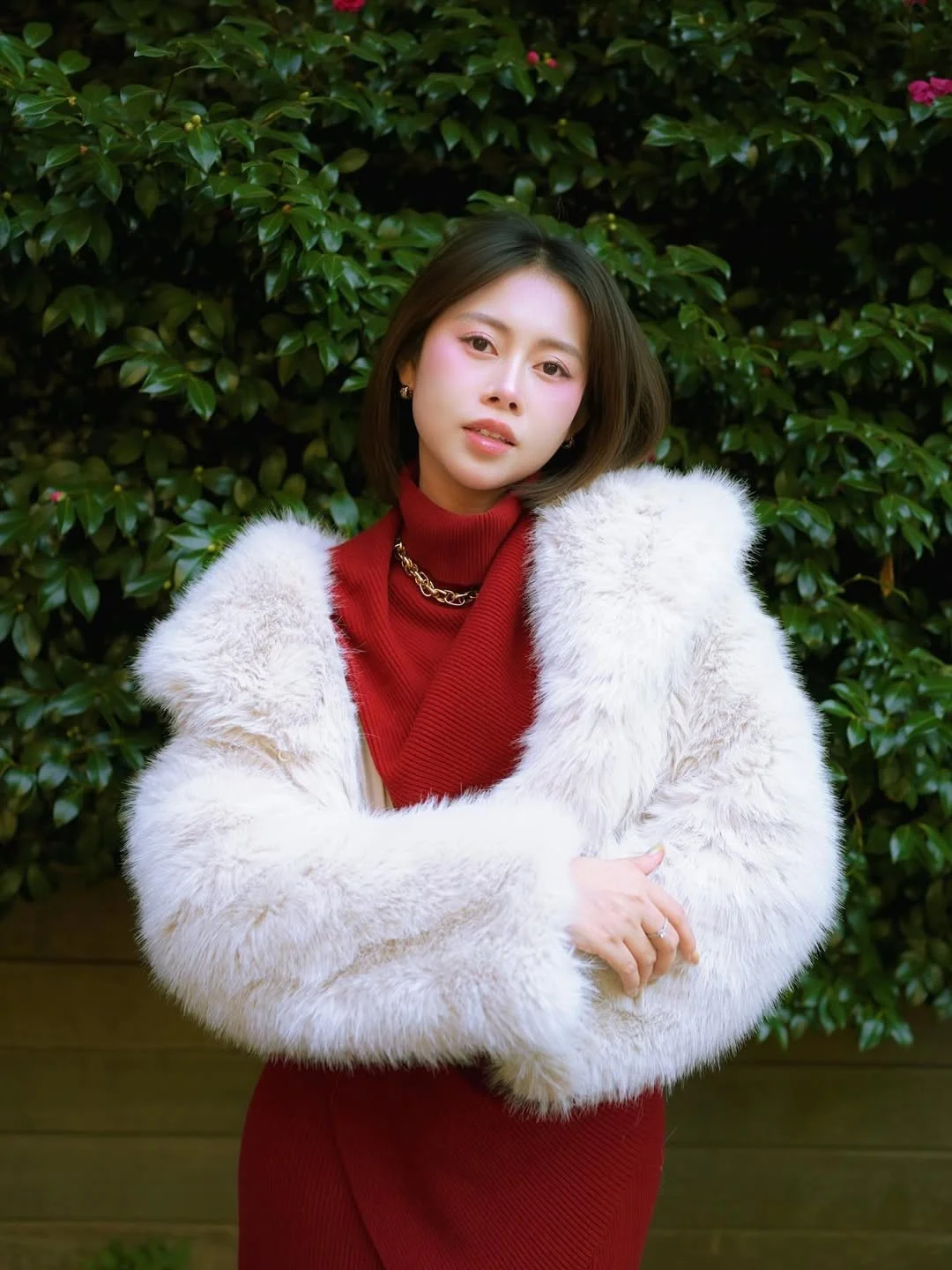Jin Yun Xi Yuki radiates brilliantly in a traditional red kimono, yet styled with captivating allure. The striking red hue, adorned with delicate white floral patterns, highlights her graceful and elegant beauty. The kimono is artfully draped, revealing alluring bare shoulders, creating a harmonious blend of classic charm and modern appeal. Jin Yun Xi Yuki’s captivating gaze and confident demeanor make it impossible for viewers to look away. She stands on wooden steps amidst a lush green setting, forming a picturesque and enchanting scene. This is not merely a fashion photograph but a sophisticated expression of East Asian beauty, exuding an irresistible charm.#JinYun #XiYuki #RedKimono #AsianBeauty #XiuRenNo10683 #SeductiveFashion