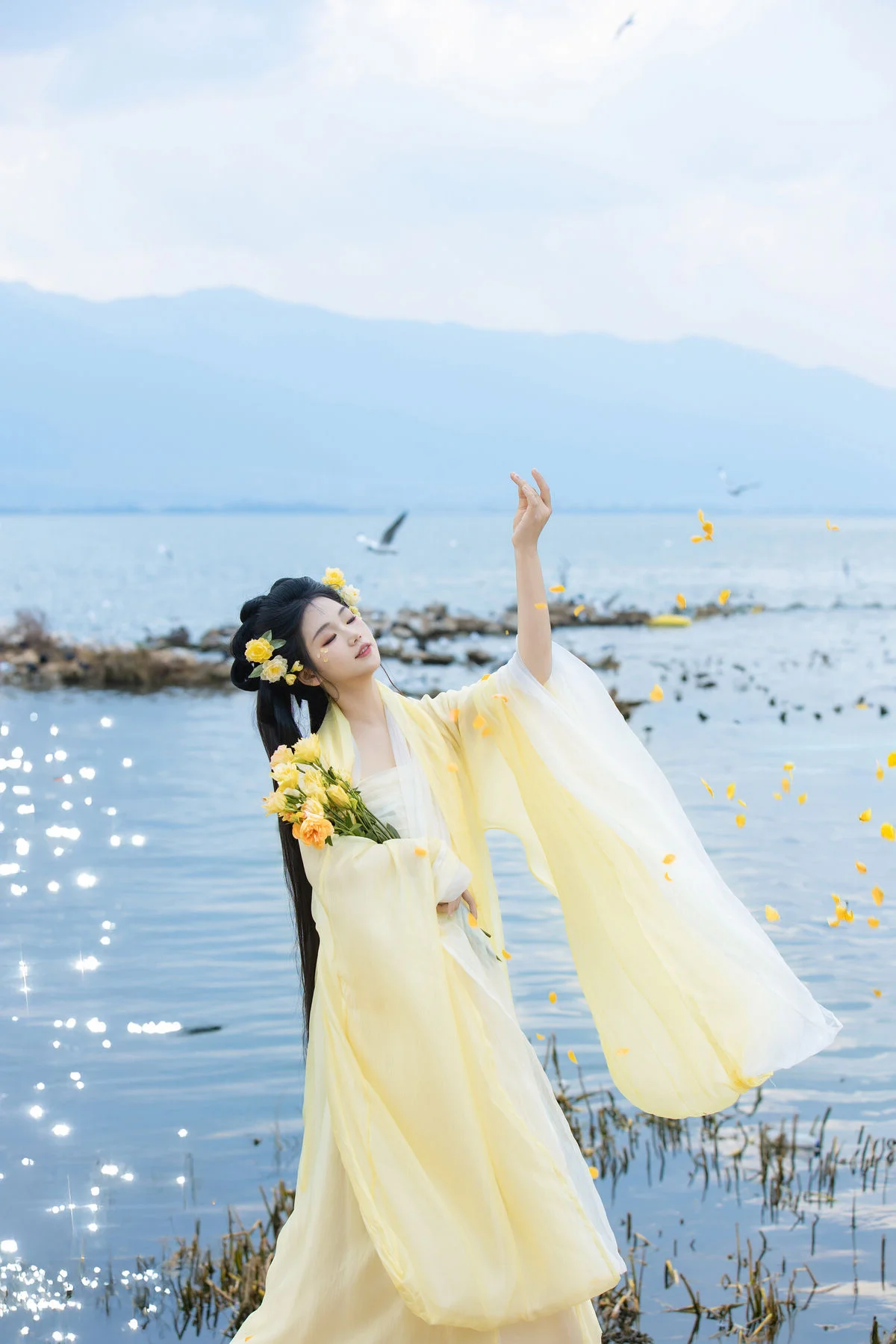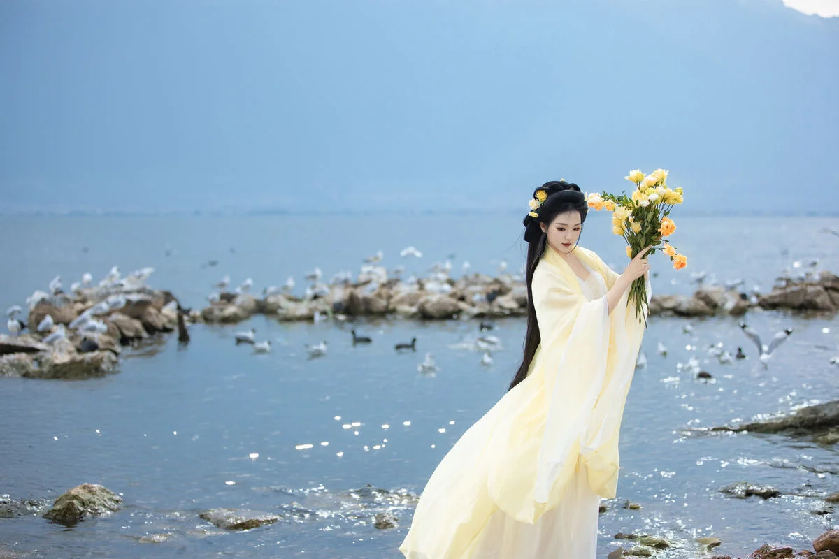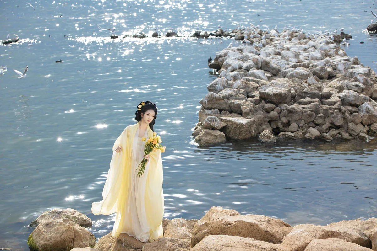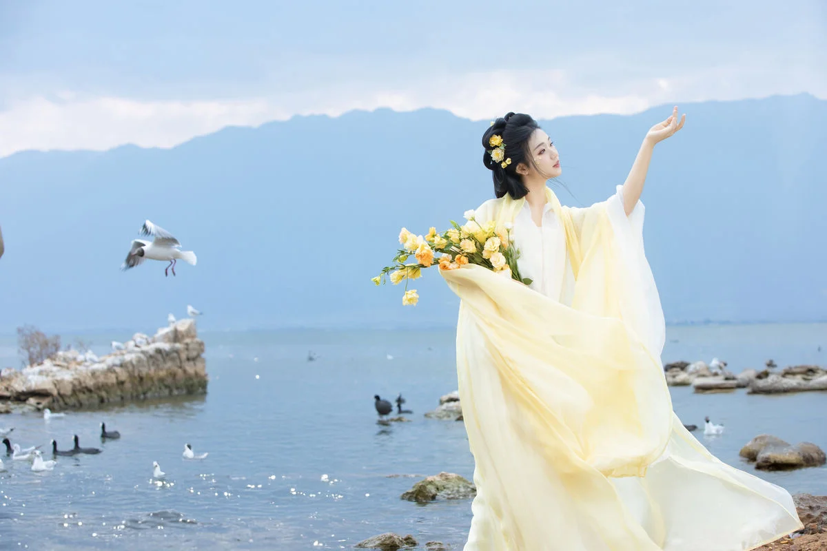 Standing by the serene blue waters, Wan Jiang Ting embodies a poetic grace in the latest YiTuYu Art Language Vol.8851. Her flowing yellow gown, crafted from delicate and airy fabric, dances gracefully with the lakeside breeze, creating a mesmerizing visual rhythm against the tranquil landscape. The composition captures a moment of pure stillness, where the soft sunlight illuminates her gentle expression and the intricate floral hair accessories. Surrounded by the peaceful presence of birds gliding over the mirror-like surface, the scene evokes a sense of nostalgia and romantic minimalism. The choice of a pale yellow palette beautifully complements the natural tones of the shore and the vast sky, showcasing a sophisticated fashion sense that feels both timeless and ethereal. This collection is a breathtaking exploration of visual storytelling, blending the beauty of nature with a refined feminine elegance that inspires the soul.#WanJiangTing #ArtLanguage #LakesideVibes #FineArtPhotography #ElegantStyle #YiTuYu
