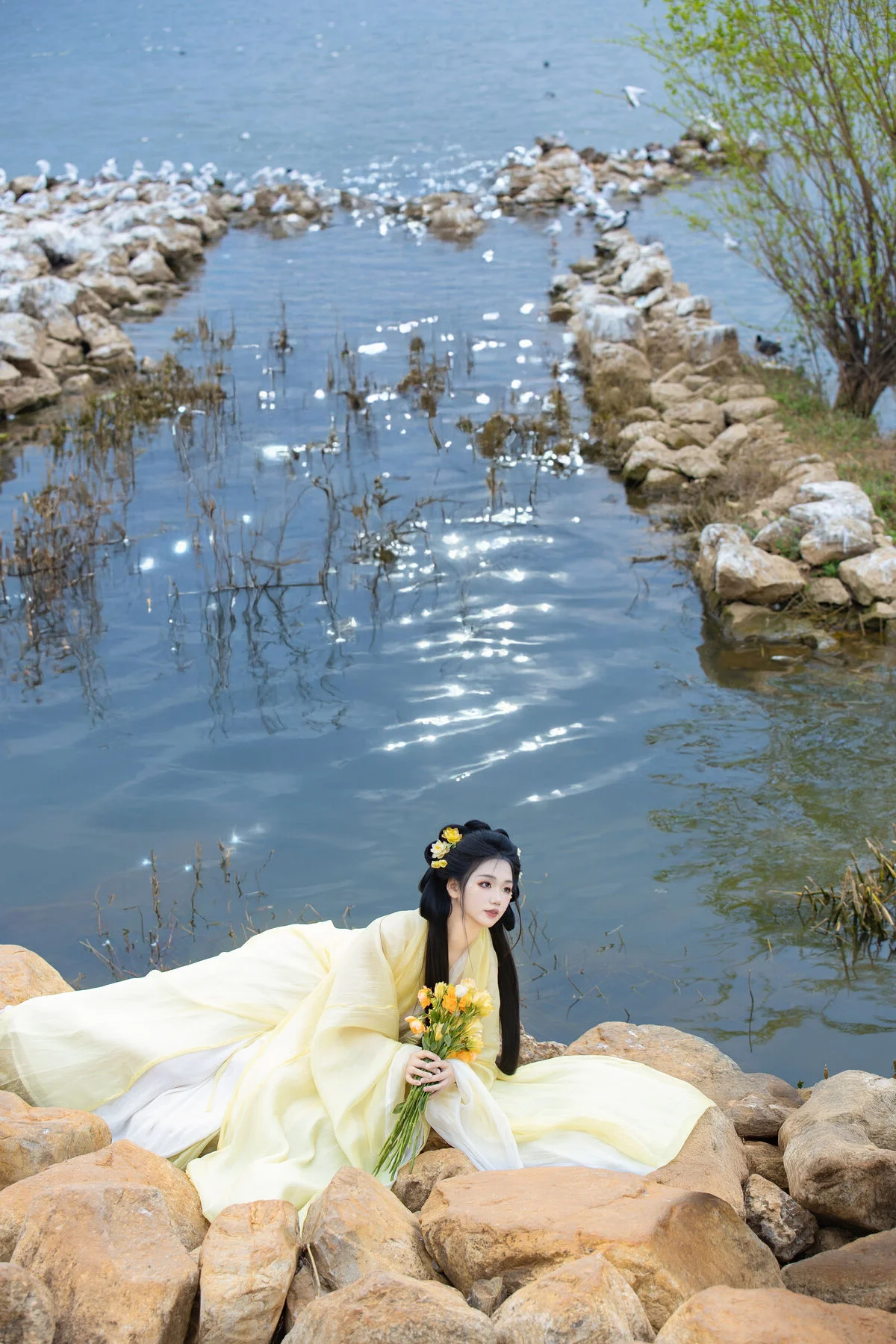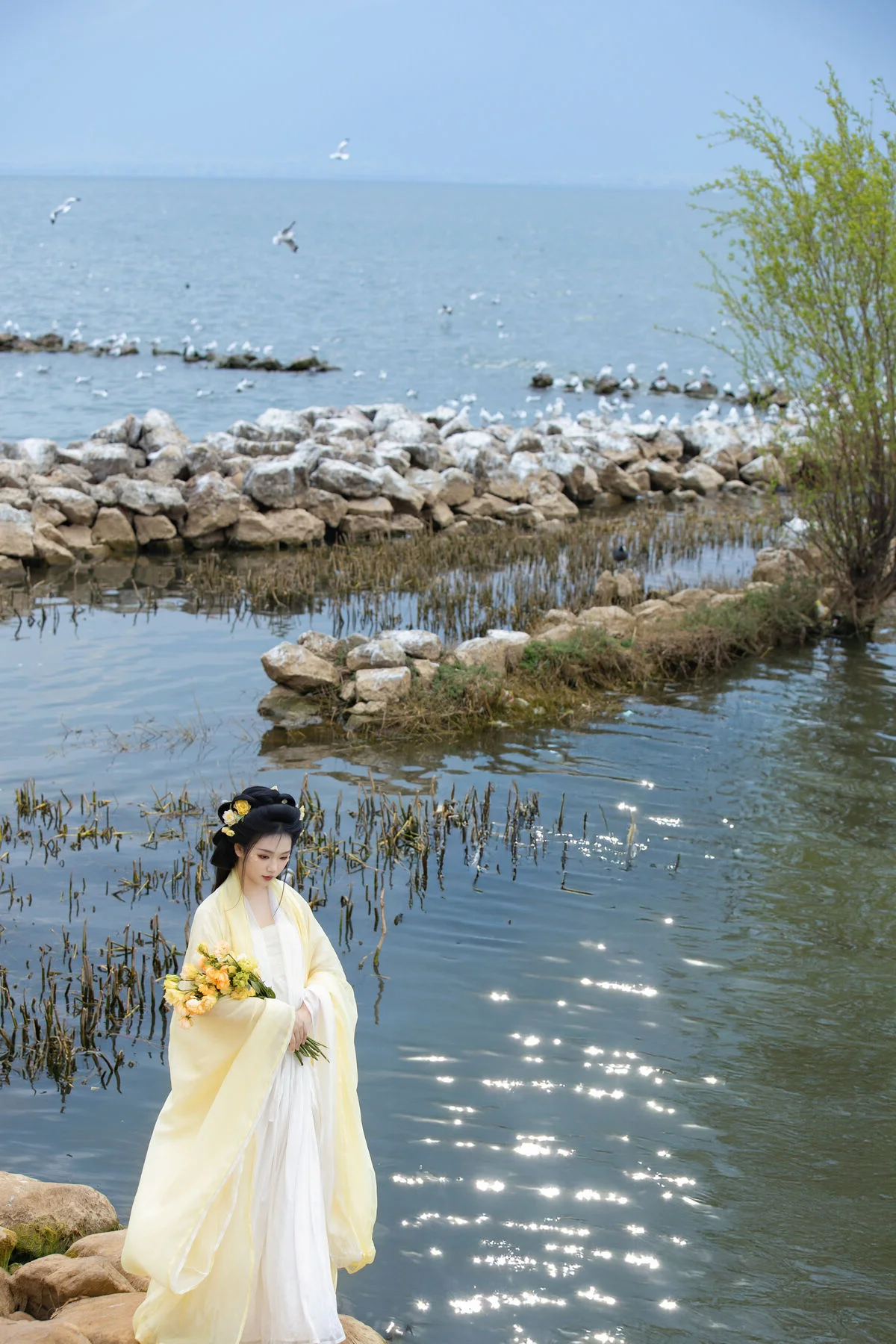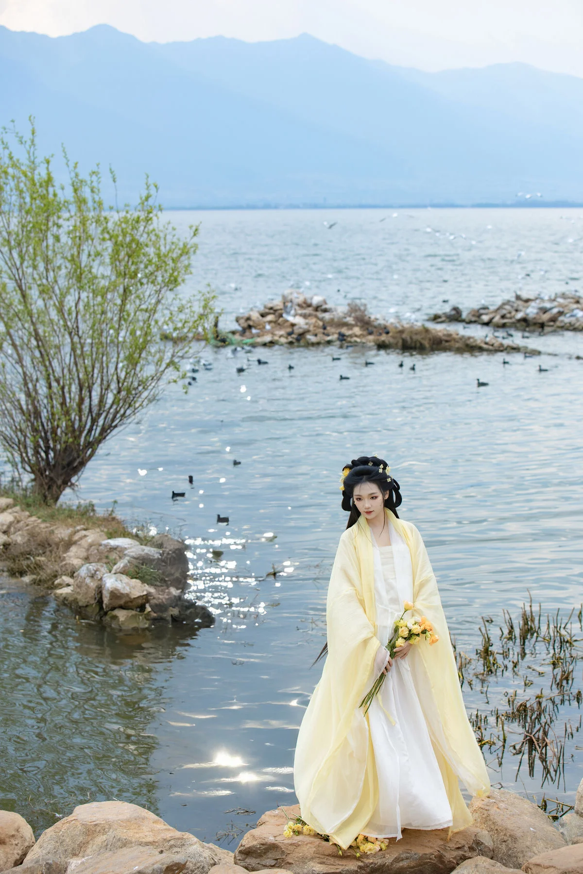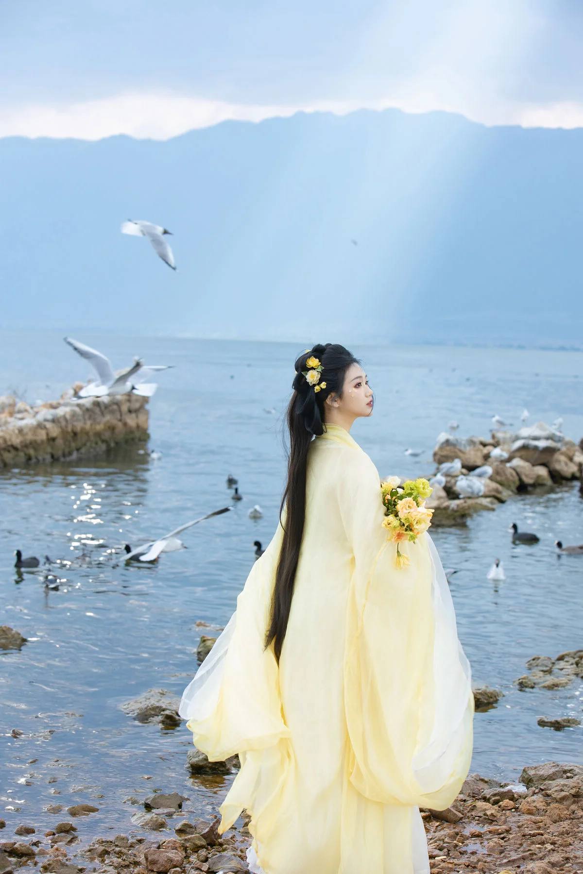 Standing by the serene blue waters, Wan Jiang Ting embodies a poetic grace in the latest YiTuYu Art Language Vol.8851. Her flowing yellow gown, crafted from delicate and airy fabric, dances gracefully with the lakeside breeze, creating a mesmerizing visual rhythm against the tranquil landscape. The composition captures a moment of pure stillness, where the soft sunlight illuminates her gentle expression and the intricate floral hair accessories. Surrounded by the peaceful presence of birds gliding over the mirror-like surface, the scene evokes a sense of nostalgia and romantic minimalism. The choice of a pale yellow palette beautifully complements the natural tones of the shore and the vast sky, showcasing a sophisticated fashion sense that feels both timeless and ethereal. This collection is a breathtaking exploration of visual storytelling, blending the beauty of nature with a refined feminine elegance that inspires the soul.#WanJiangTing #ArtLanguage #LakesideVibes #FineArtPhotography #ElegantStyle #YiTuYu
