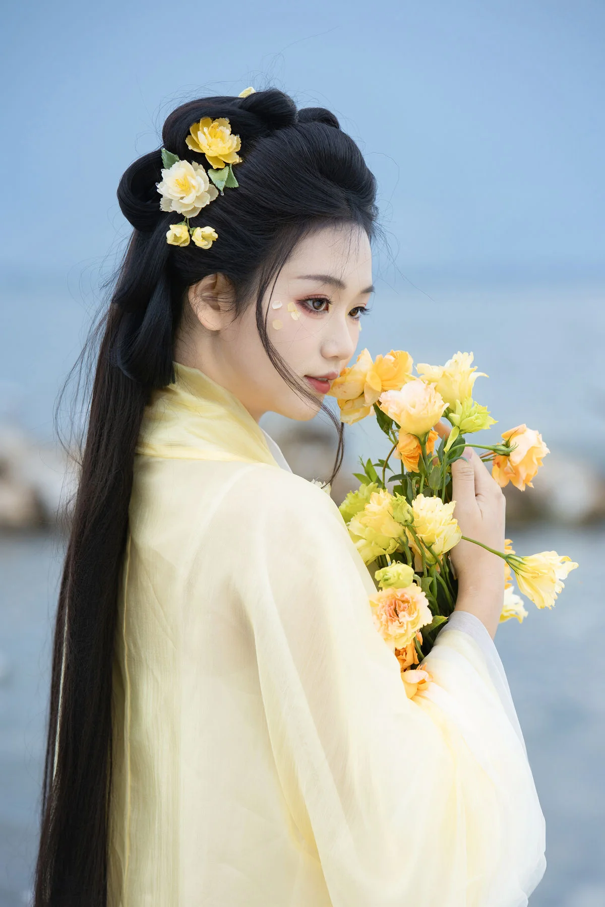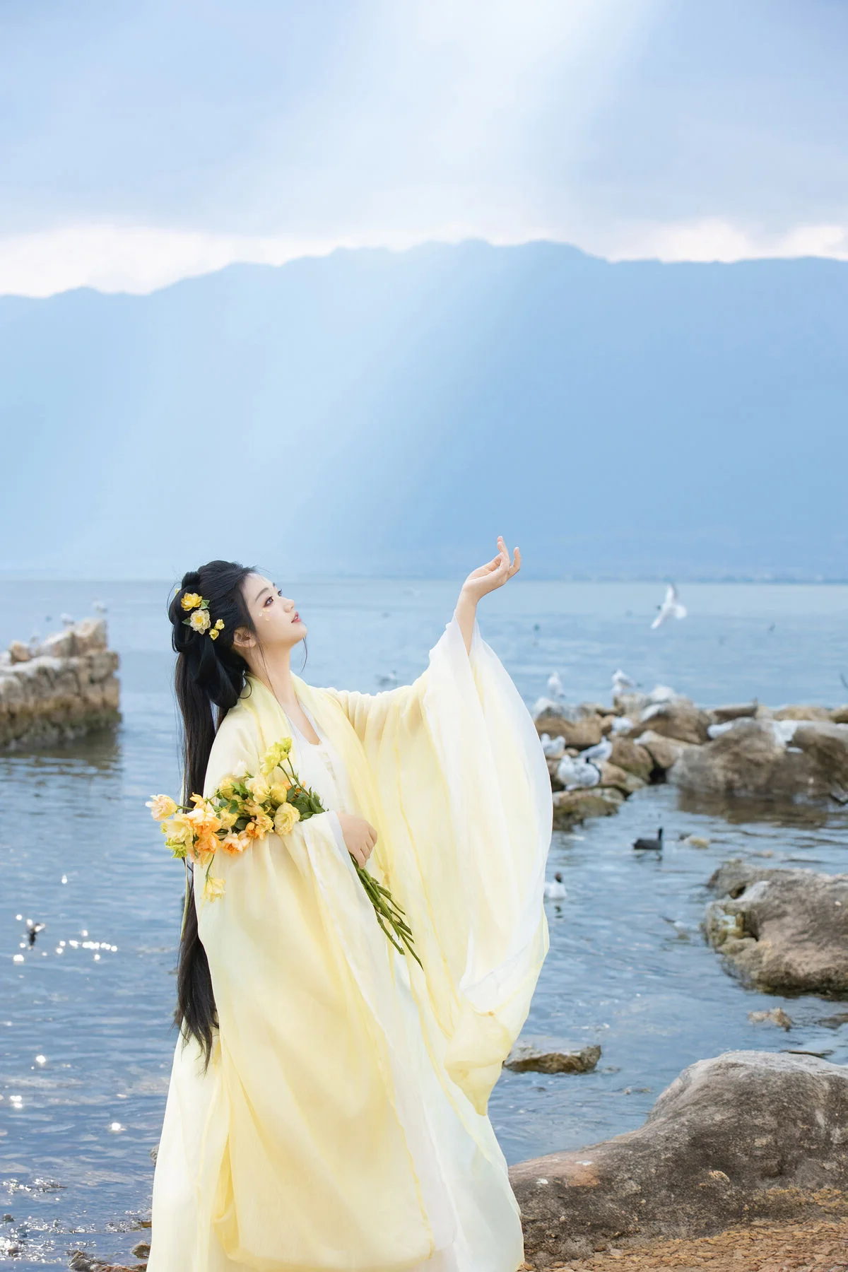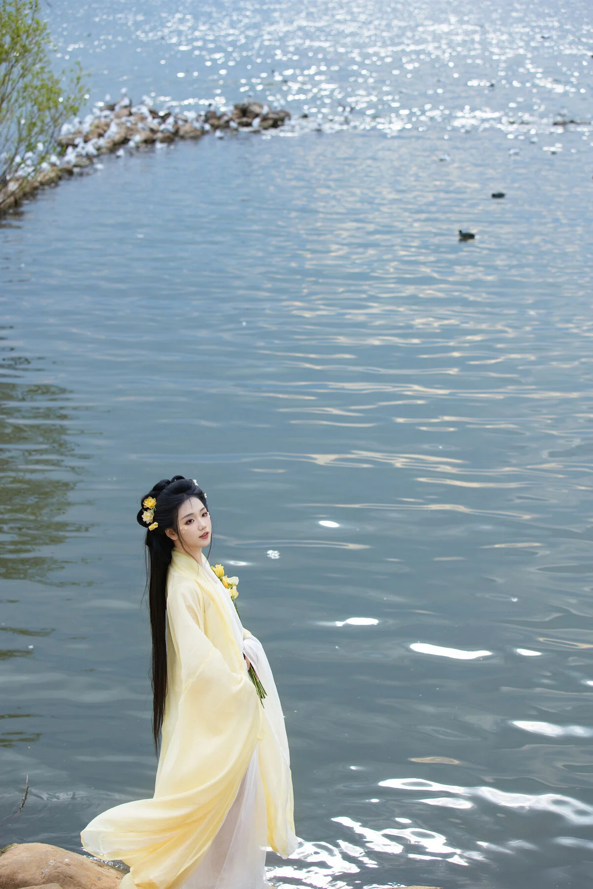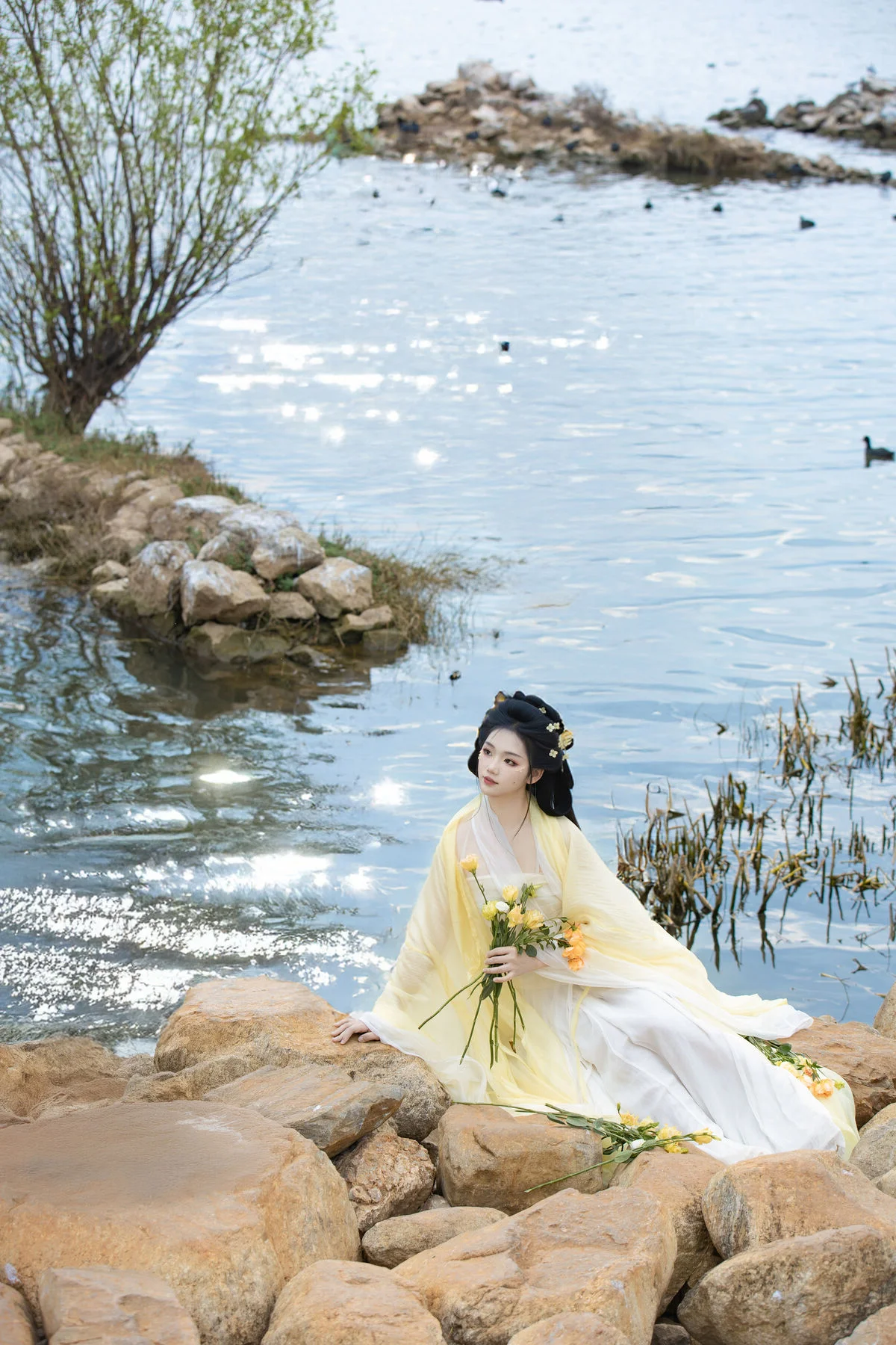 Standing by the serene blue waters, Wan Jiang Ting embodies a poetic grace in the latest YiTuYu Art Language Vol.8851. Her flowing yellow gown, crafted from delicate and airy fabric, dances gracefully with the lakeside breeze, creating a mesmerizing visual rhythm against the tranquil landscape. The composition captures a moment of pure stillness, where the soft sunlight illuminates her gentle expression and the intricate floral hair accessories. Surrounded by the peaceful presence of birds gliding over the mirror-like surface, the scene evokes a sense of nostalgia and romantic minimalism. The choice of a pale yellow palette beautifully complements the natural tones of the shore and the vast sky, showcasing a sophisticated fashion sense that feels both timeless and ethereal. This collection is a breathtaking exploration of visual storytelling, blending the beauty of nature with a refined feminine elegance that inspires the soul.#WanJiangTing #ArtLanguage #LakesideVibes #FineArtPhotography #ElegantStyle #YiTuYu