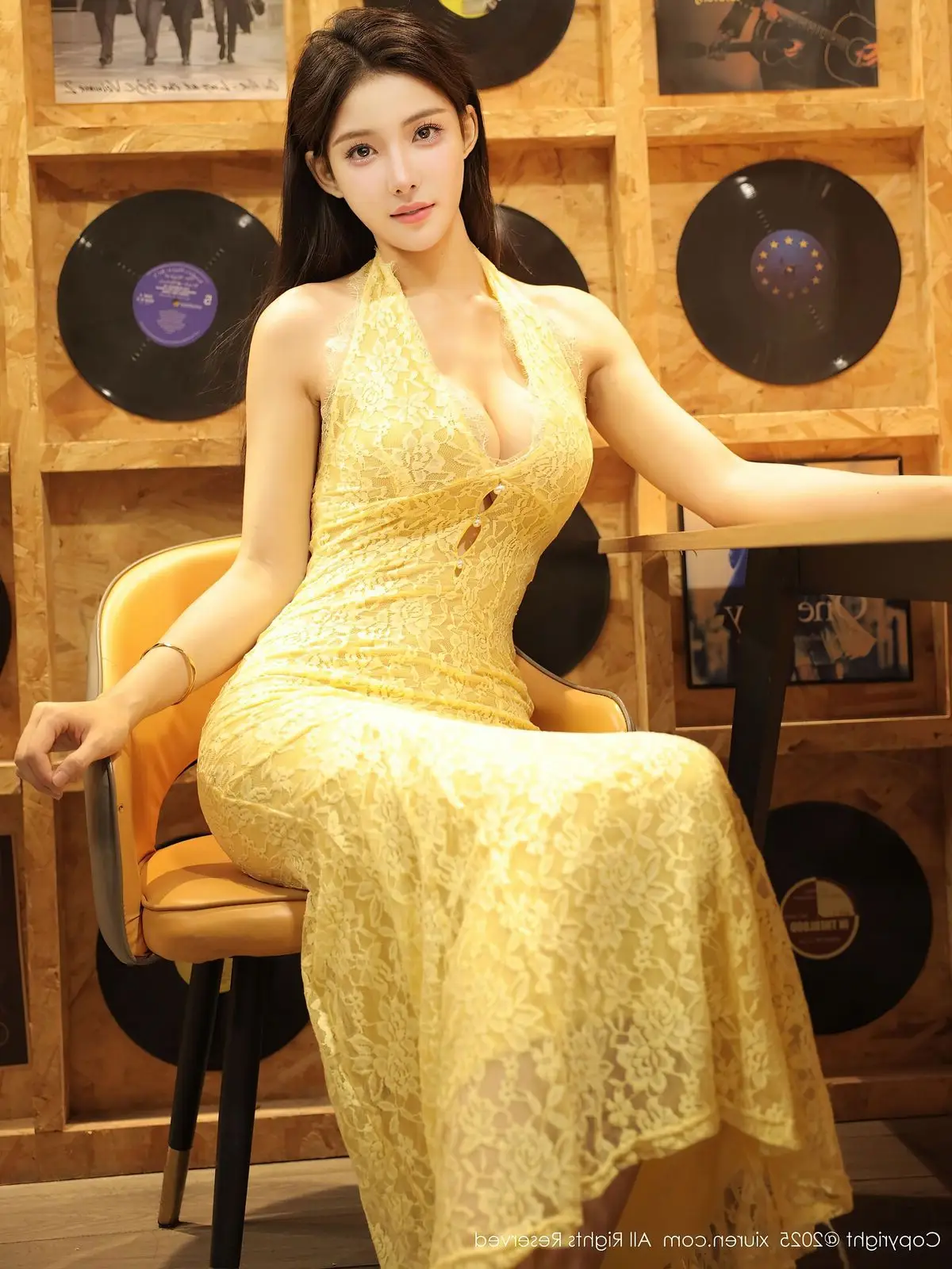 In the captivating XiuRen No.10715 photoshoot model Li Shuang Er radiates a pure and irresistible charm She graces the scene in an exquisite yellow lace dress elegantly accentuating her graceful figure Her poised sitting posture on warm wooden surfaces against a backdrop of vintage vinyl records creates a nostalgic and poetic atmosphere Li Shuang Ers serene gaze and gentle smile seem to tell a story of elegance and timeless style This collection is undoubtedly a must-see for admirers of sophisticated beauty and the harmonious blend of modern allure with classic aesthetics