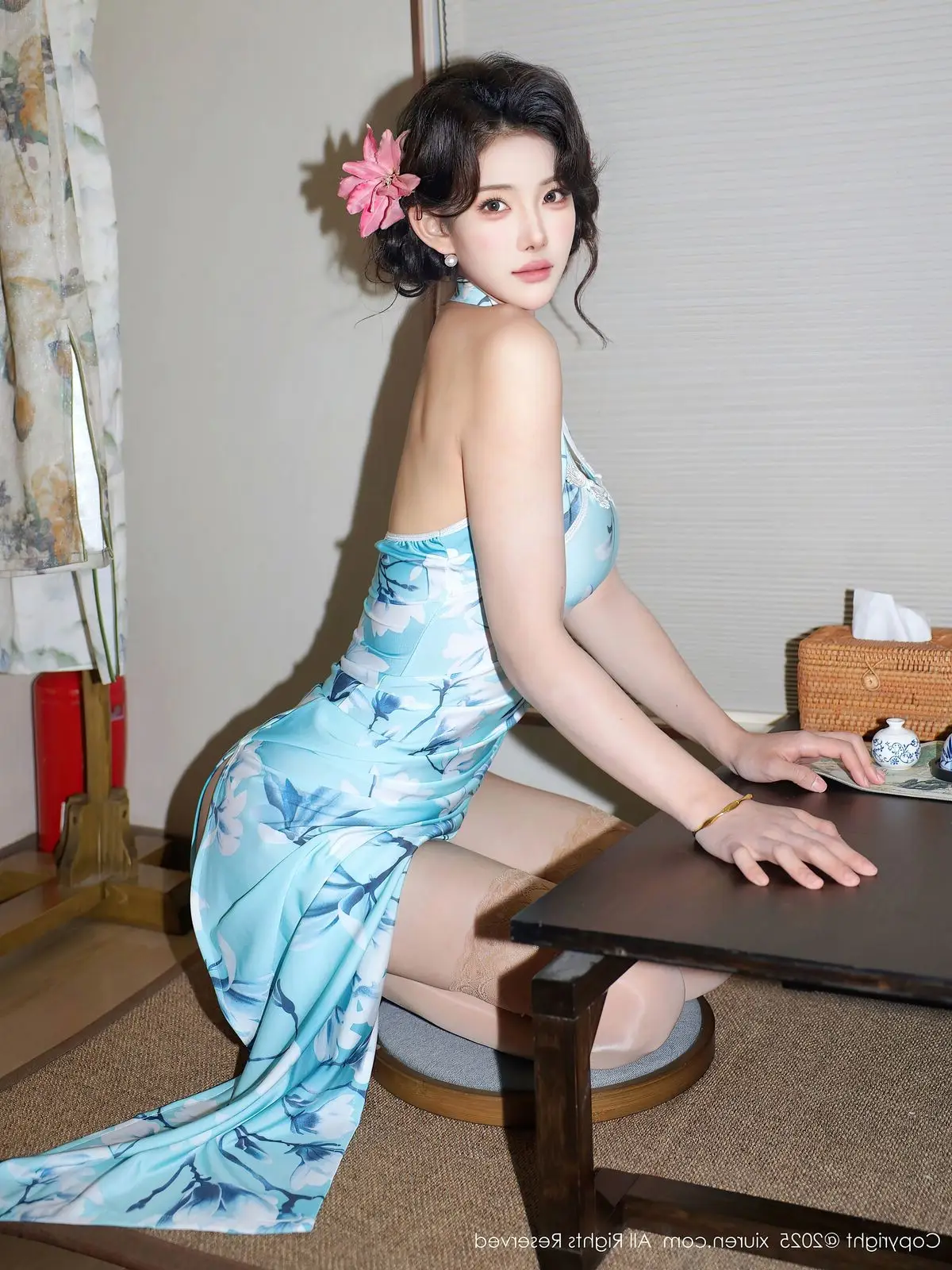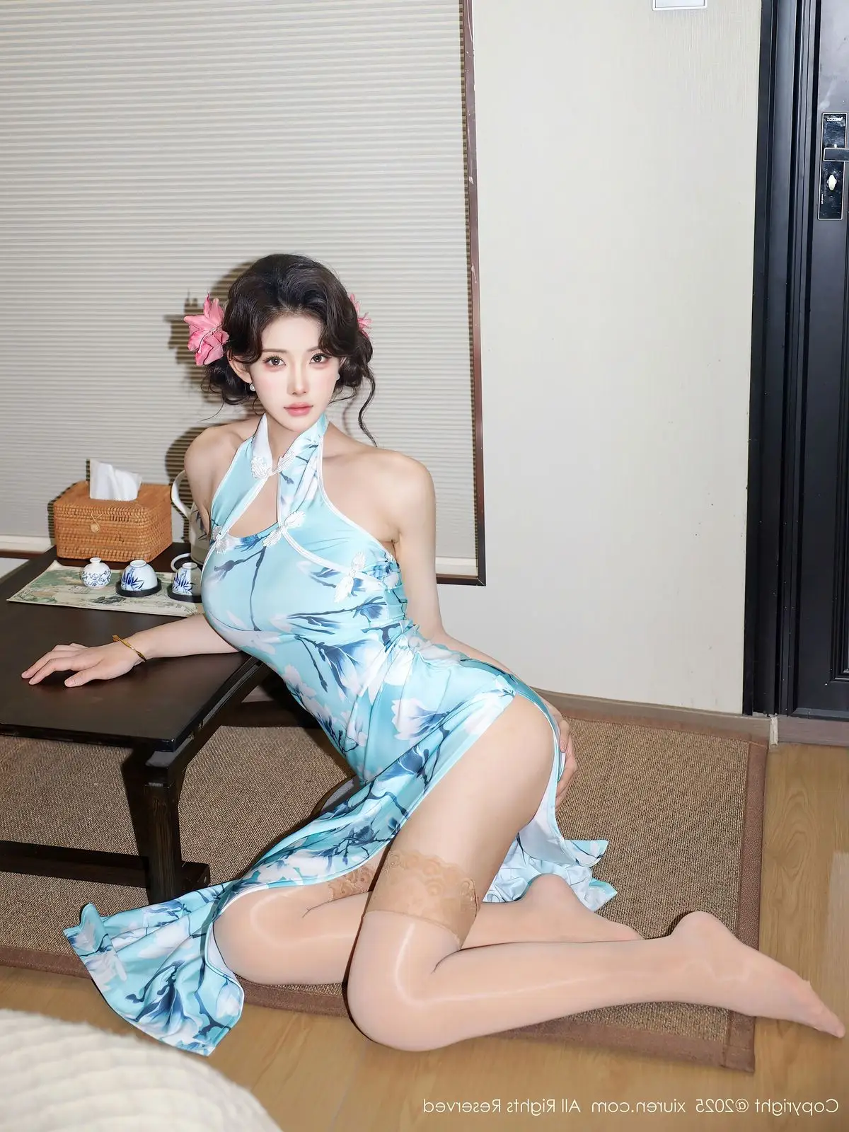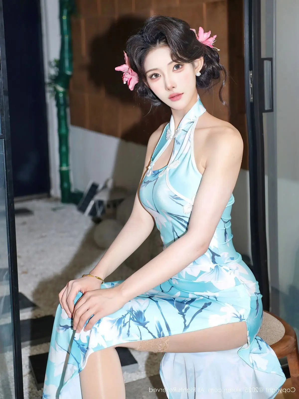 The XiuRen No.10594 collection features model Li Shuang Er, exuding a refined and captivating beauty. She poses gracefully in a light aqua cheongsam adorned with delicate bamboo or lotus patterns, accentuating her soft figure. The modern halter-neck design, combined with smooth silk fabric, elevates her sophisticated aura while preserving the traditional essence of the attire. Li Shuang Er's gaze conveys confidence and allure, complemented by her softly curled hair and floral hairpins, creating a harmonious blend of classic elegance and contemporary flair. The simple yet cozy indoor setting further highlights her pure and vibrant beauty, inviting viewers to explore this unique style.