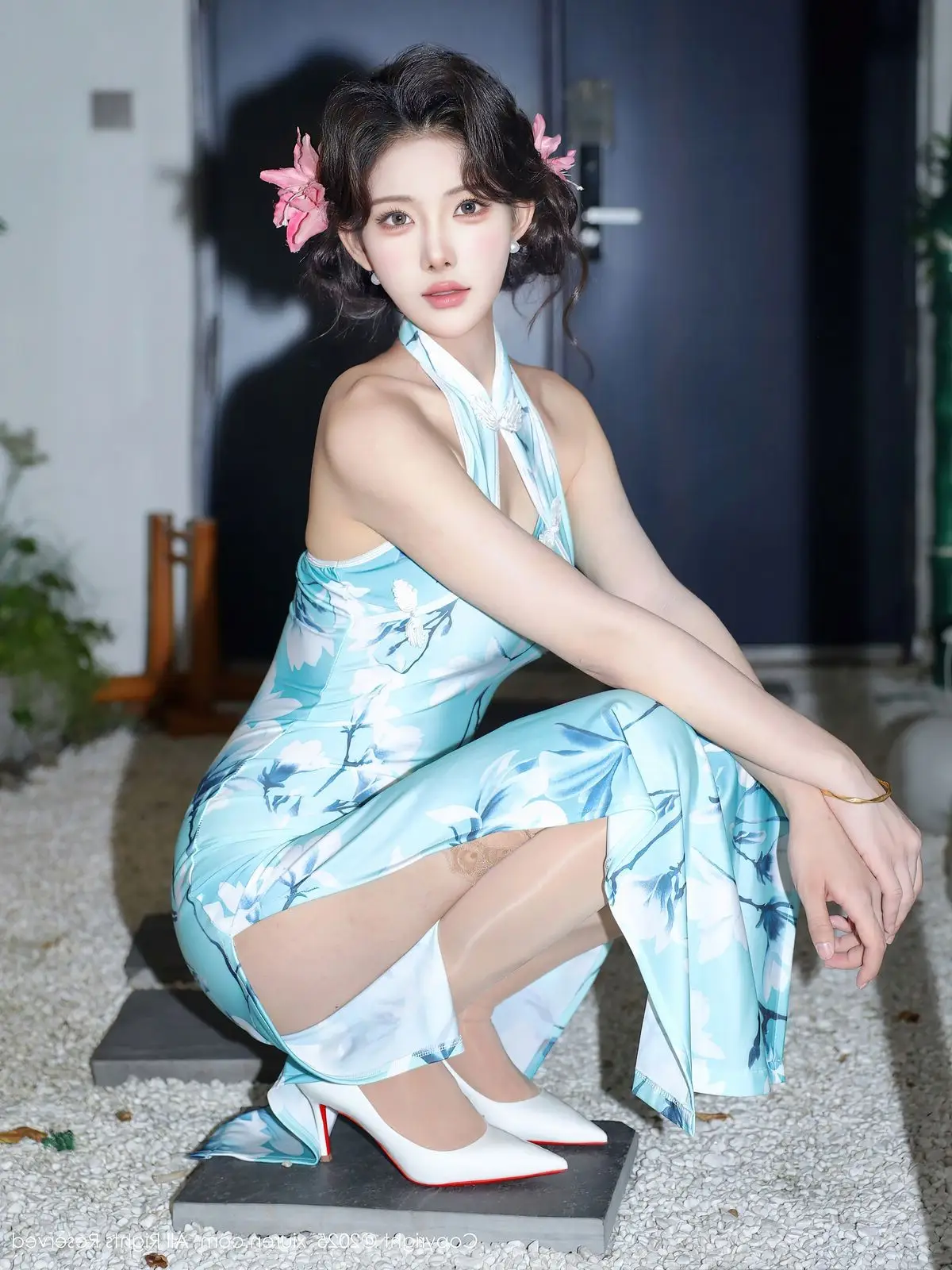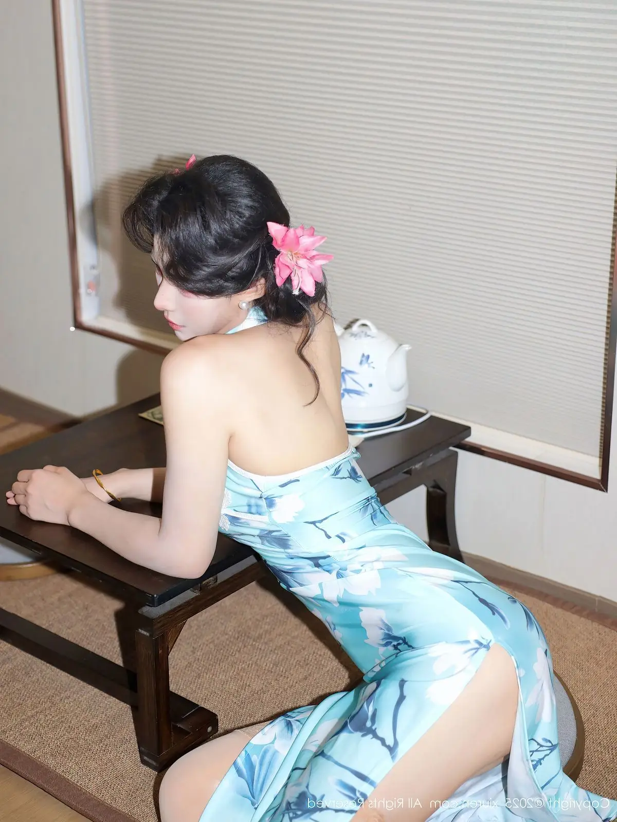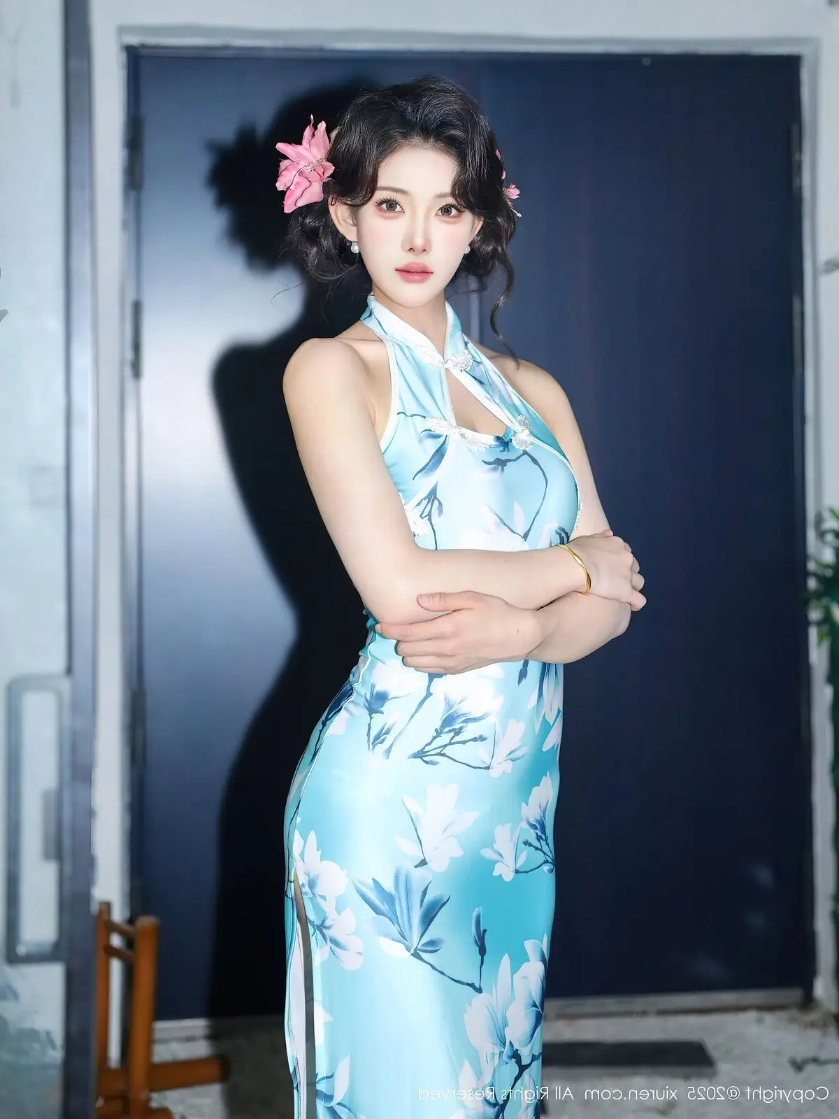 The XiuRen No.10594 collection features model Li Shuang Er, exuding a refined and captivating beauty. She poses gracefully in a light aqua cheongsam adorned with delicate bamboo or lotus patterns, accentuating her soft figure. The modern halter-neck design, combined with smooth silk fabric, elevates her sophisticated aura while preserving the traditional essence of the attire. Li Shuang Er's gaze conveys confidence and allure, complemented by her softly curled hair and floral hairpins, creating a harmonious blend of classic elegance and contemporary flair. The simple yet cozy indoor setting further highlights her pure and vibrant beauty, inviting viewers to explore this unique style.