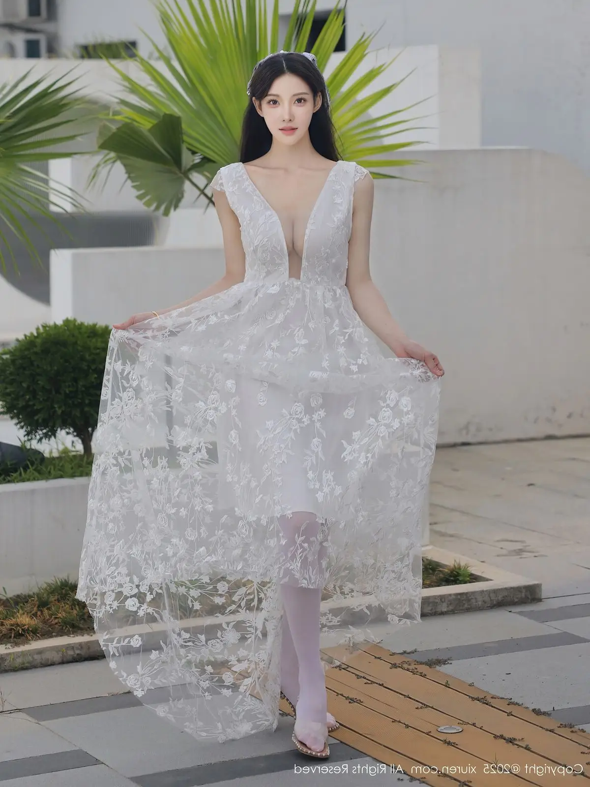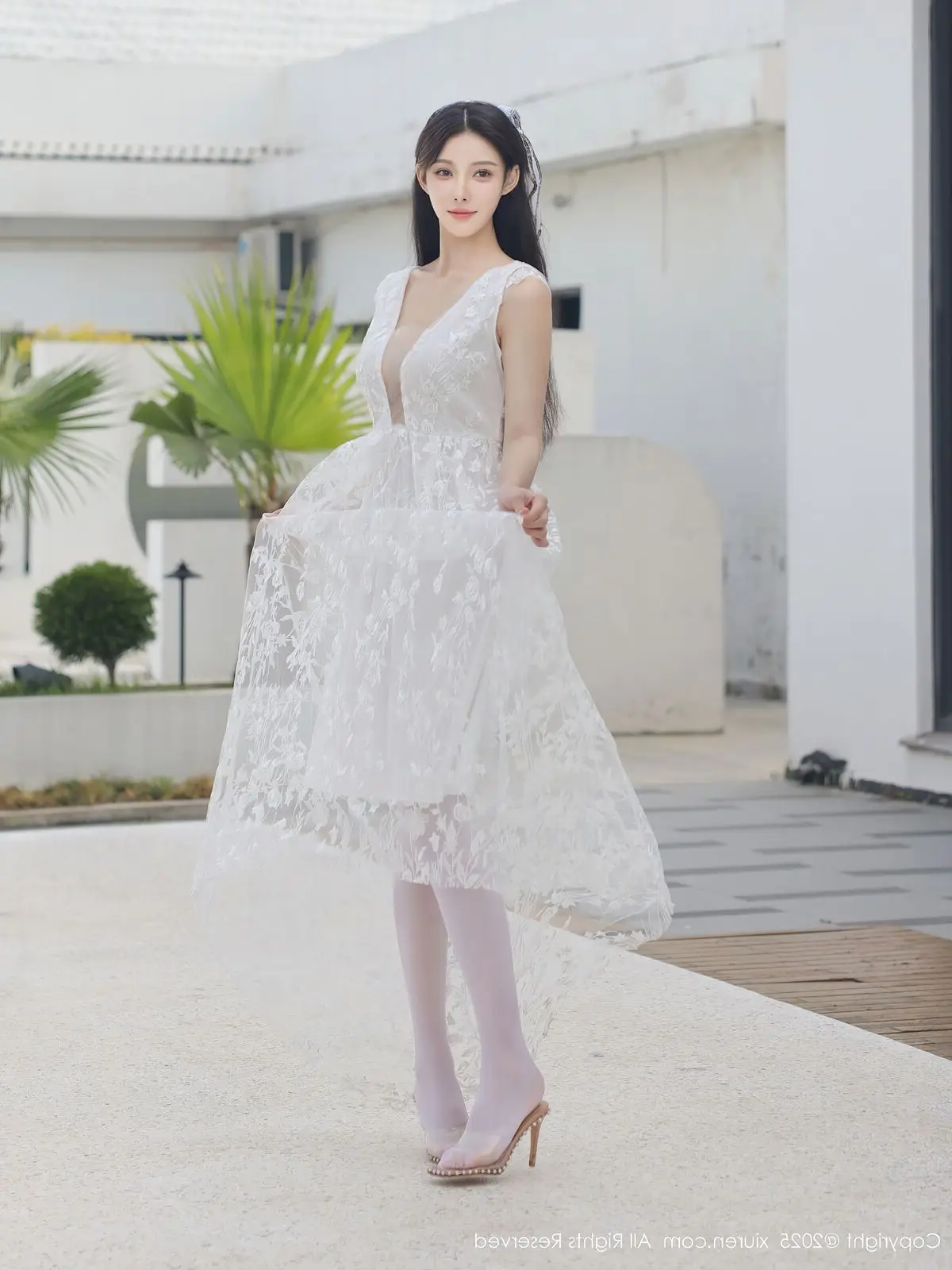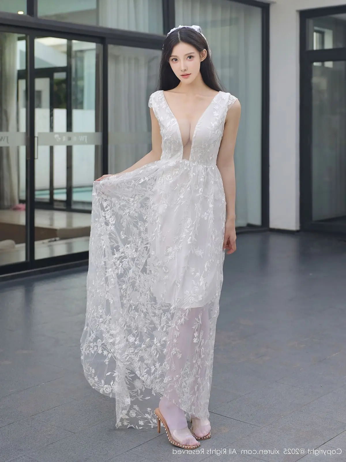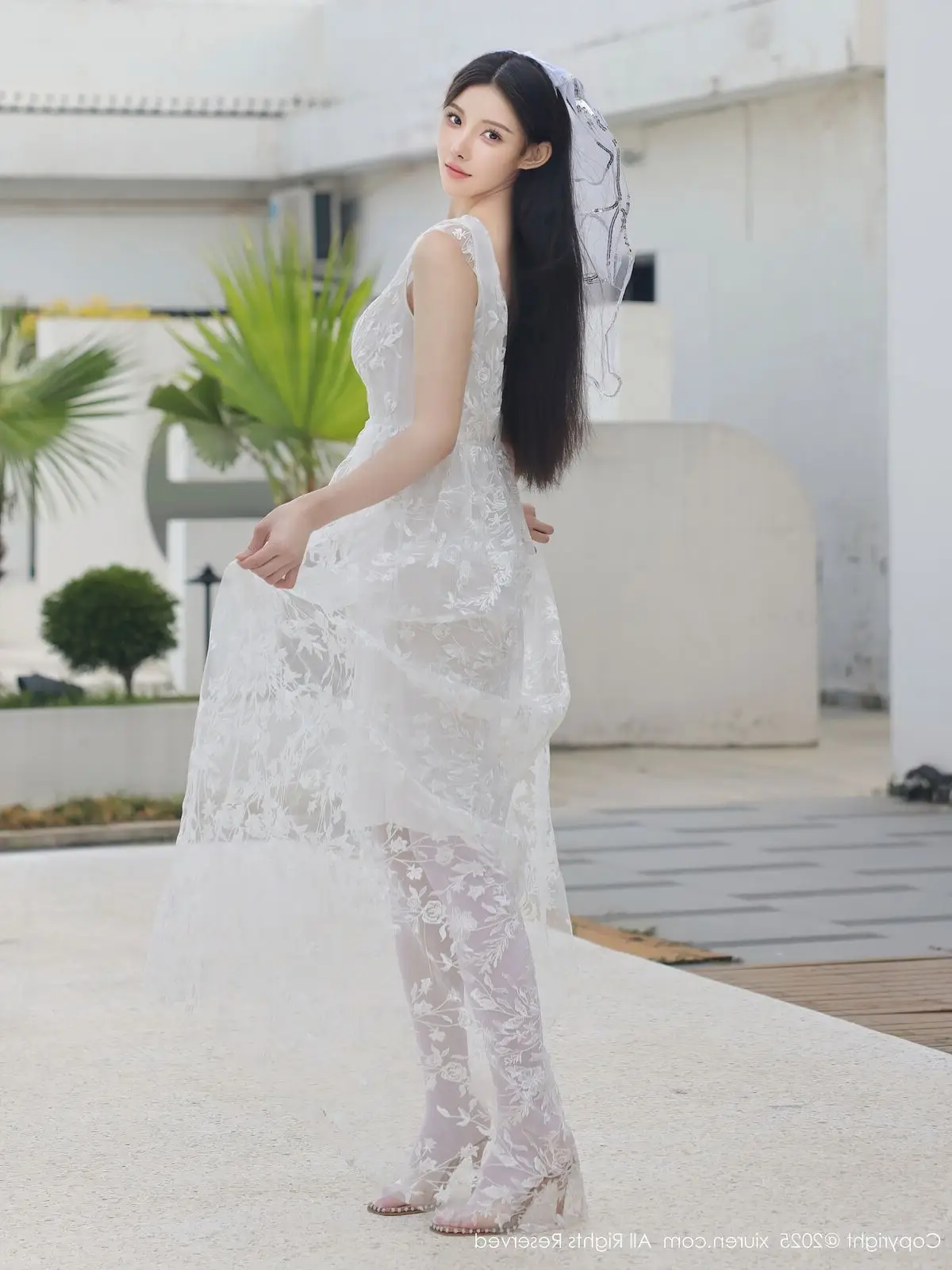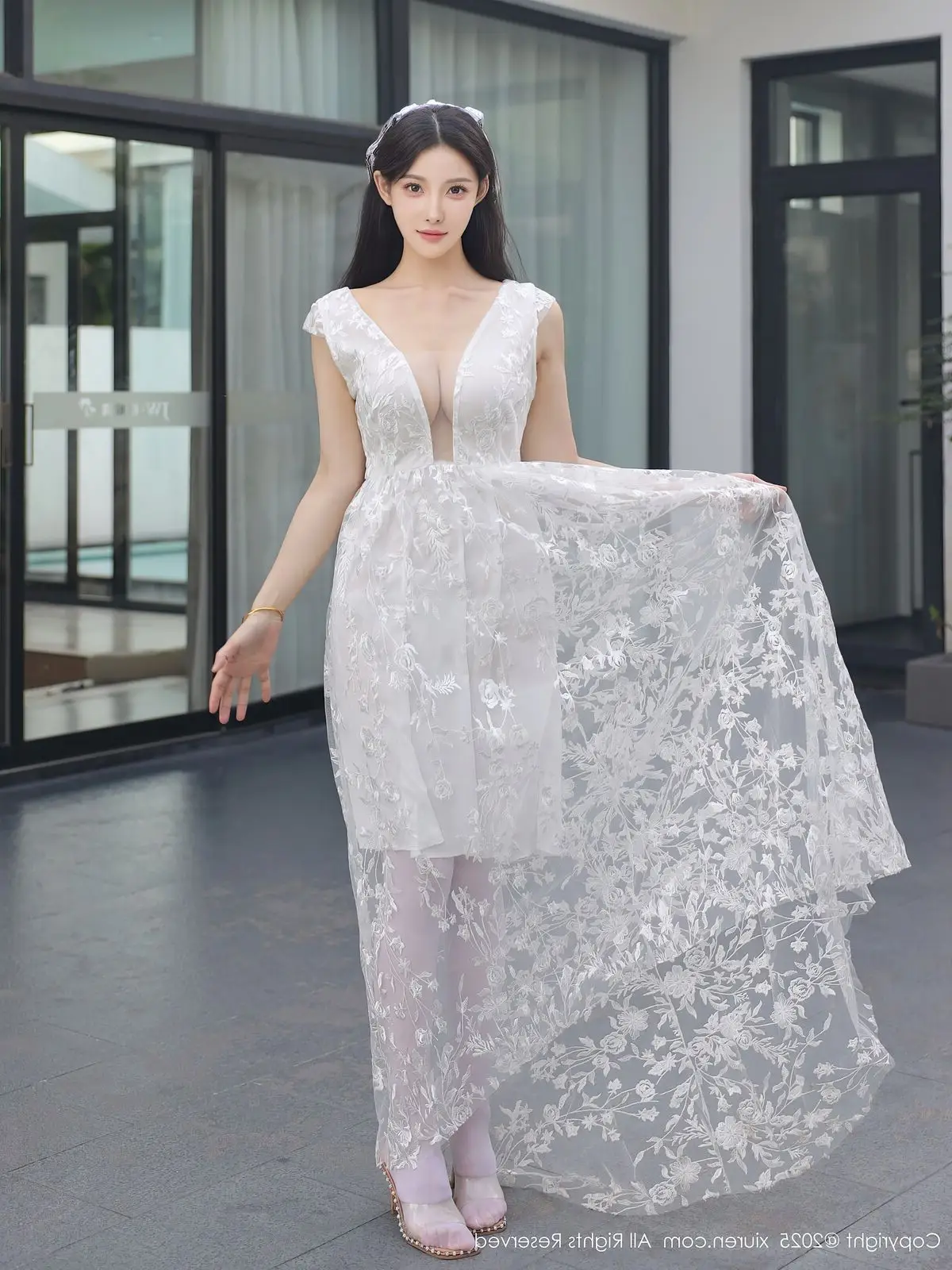 In this captivating XiuRen No.10661 collection model Li Shuang Er showcases her enchanting presence. She gracefully poses in a pristine white gown featuring an alluring design and delicate lace fabric. The flowing dress billows with her every step creating an elegant and refined silhouette. Li Shuang Er's long dark hair gently sways in the breeze highlighting her delicate features and an expressive gaze that draws viewers in. Against a backdrop of modern white architecture and reflective glass her pure beauty truly shines. This harmonious blend of fashion poise and setting crafts an enchanting visual narrative embodying Li Shuang Er's unique blend of allure and sophistication.
