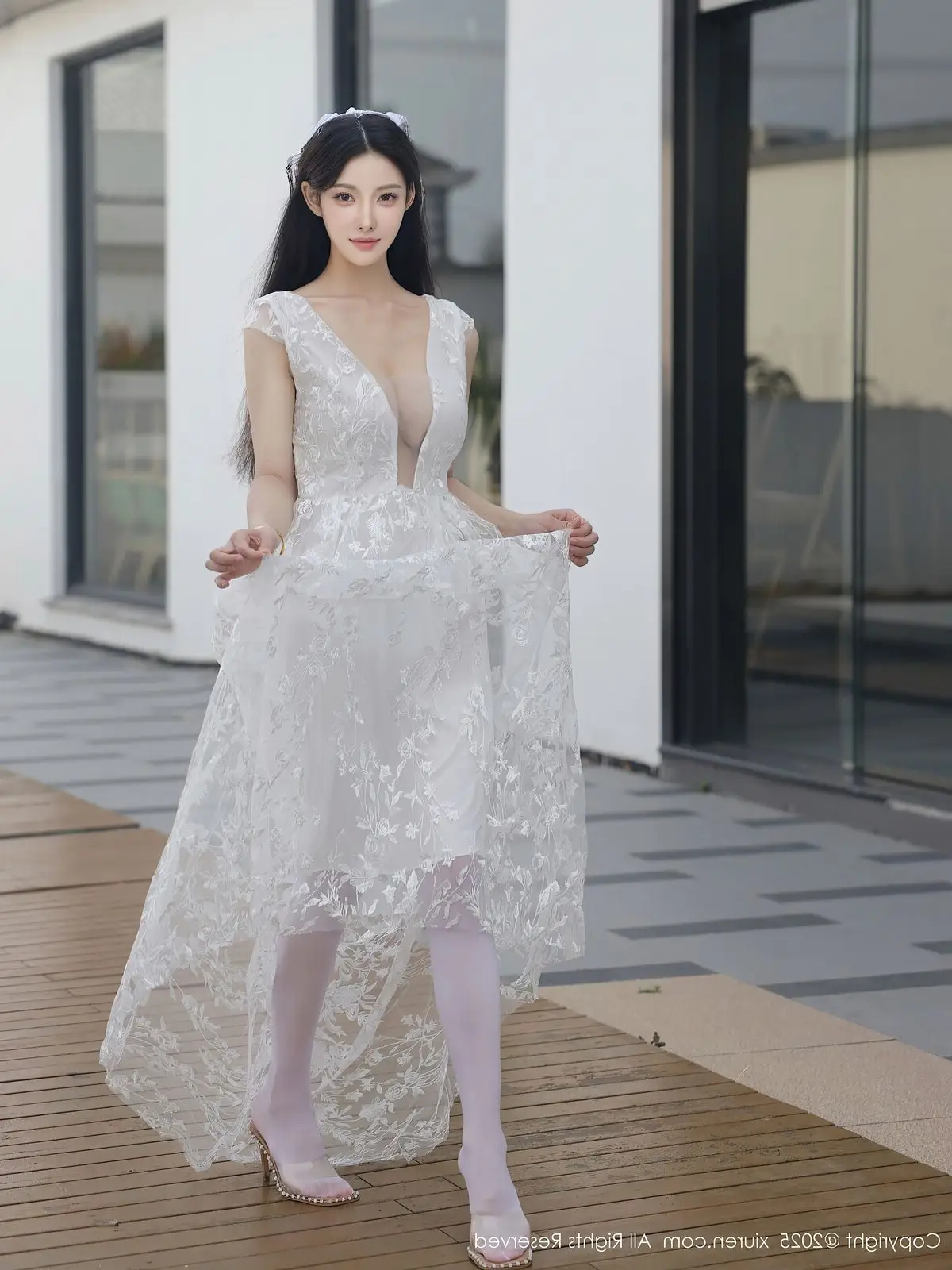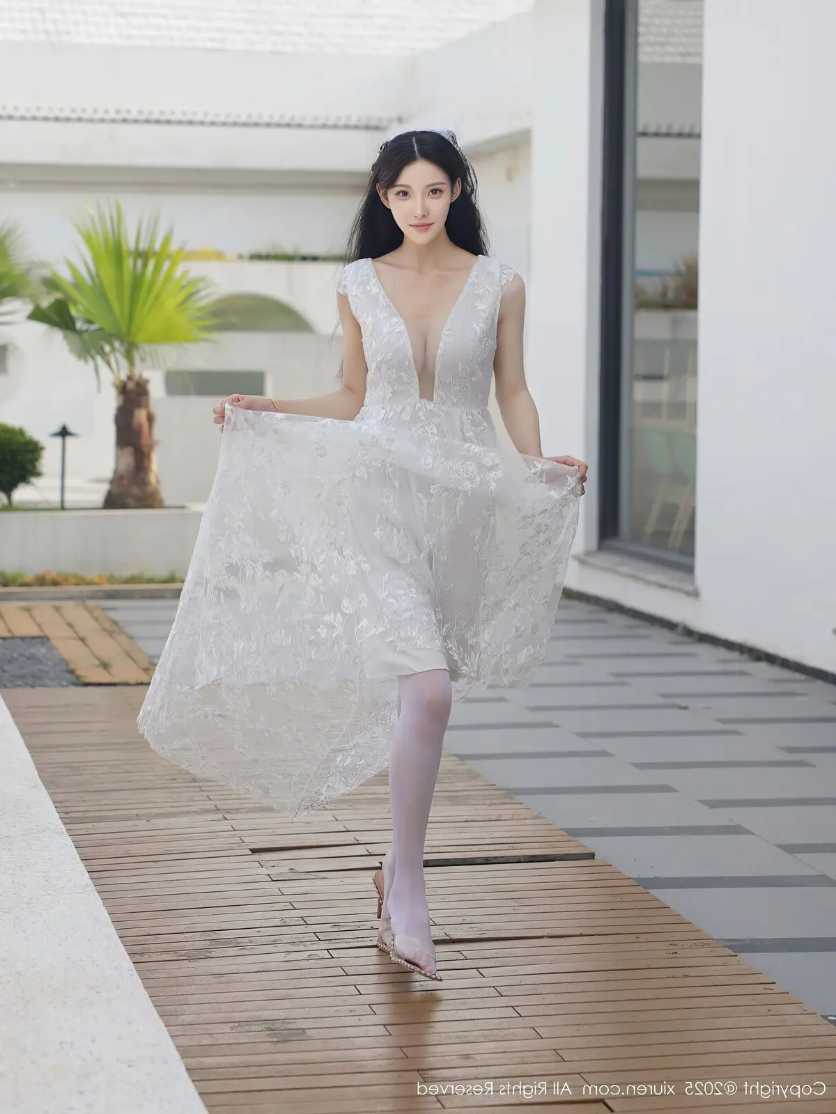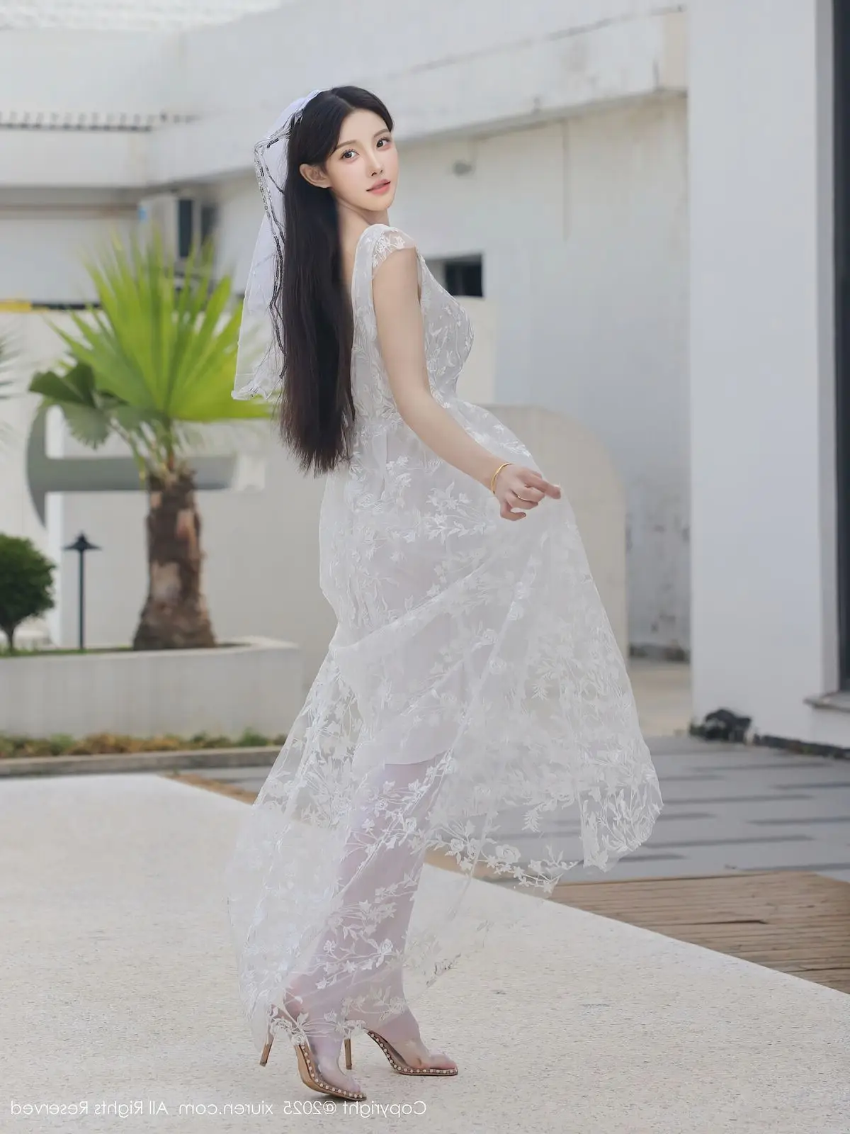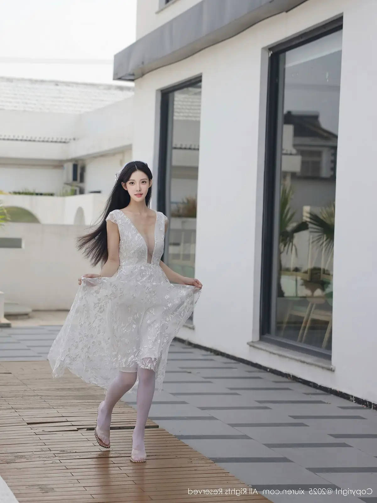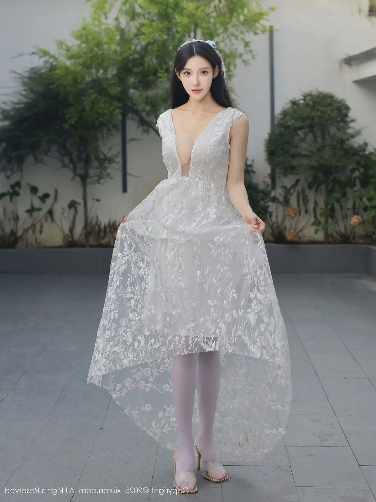 In this captivating XiuRen No.10661 collection model Li Shuang Er showcases her enchanting presence. She gracefully poses in a pristine white gown featuring an alluring design and delicate lace fabric. The flowing dress billows with her every step creating an elegant and refined silhouette. Li Shuang Er's long dark hair gently sways in the breeze highlighting her delicate features and an expressive gaze that draws viewers in. Against a backdrop of modern white architecture and reflective glass her pure beauty truly shines. This harmonious blend of fashion poise and setting crafts an enchanting visual narrative embodying Li Shuang Er's unique blend of allure and sophistication.
