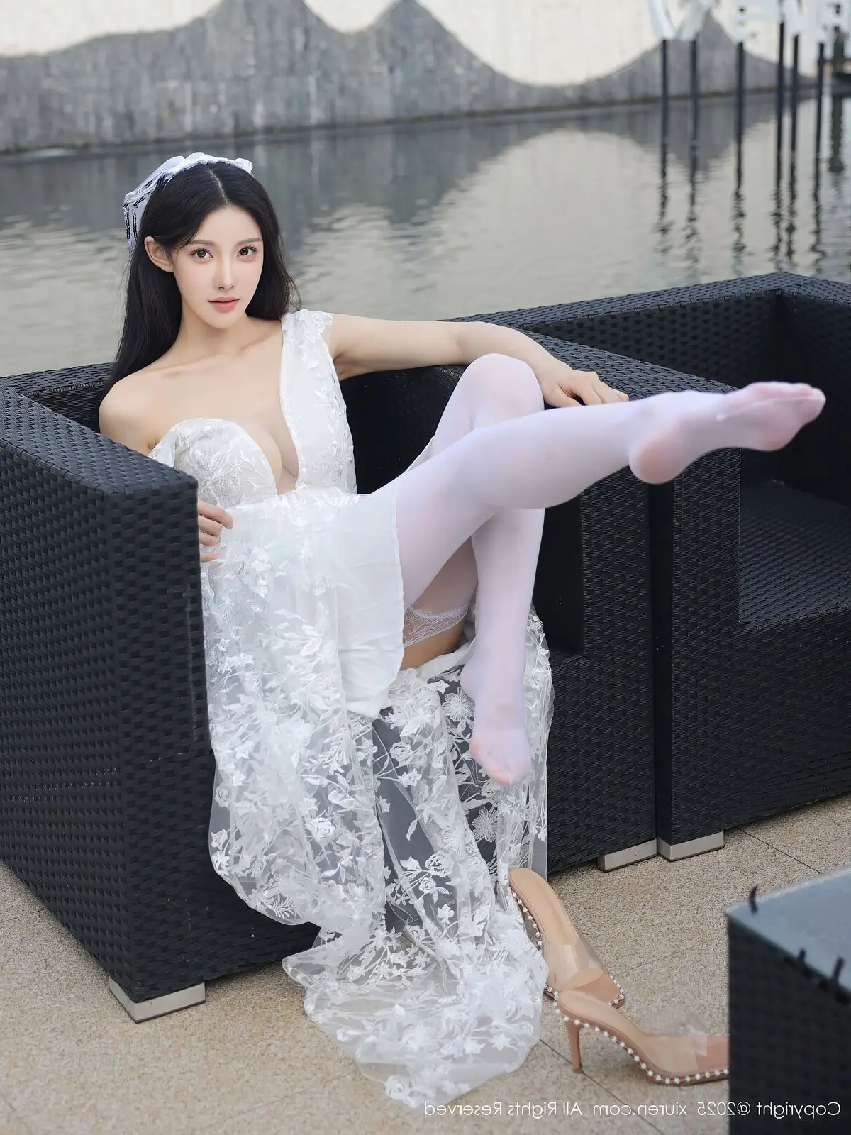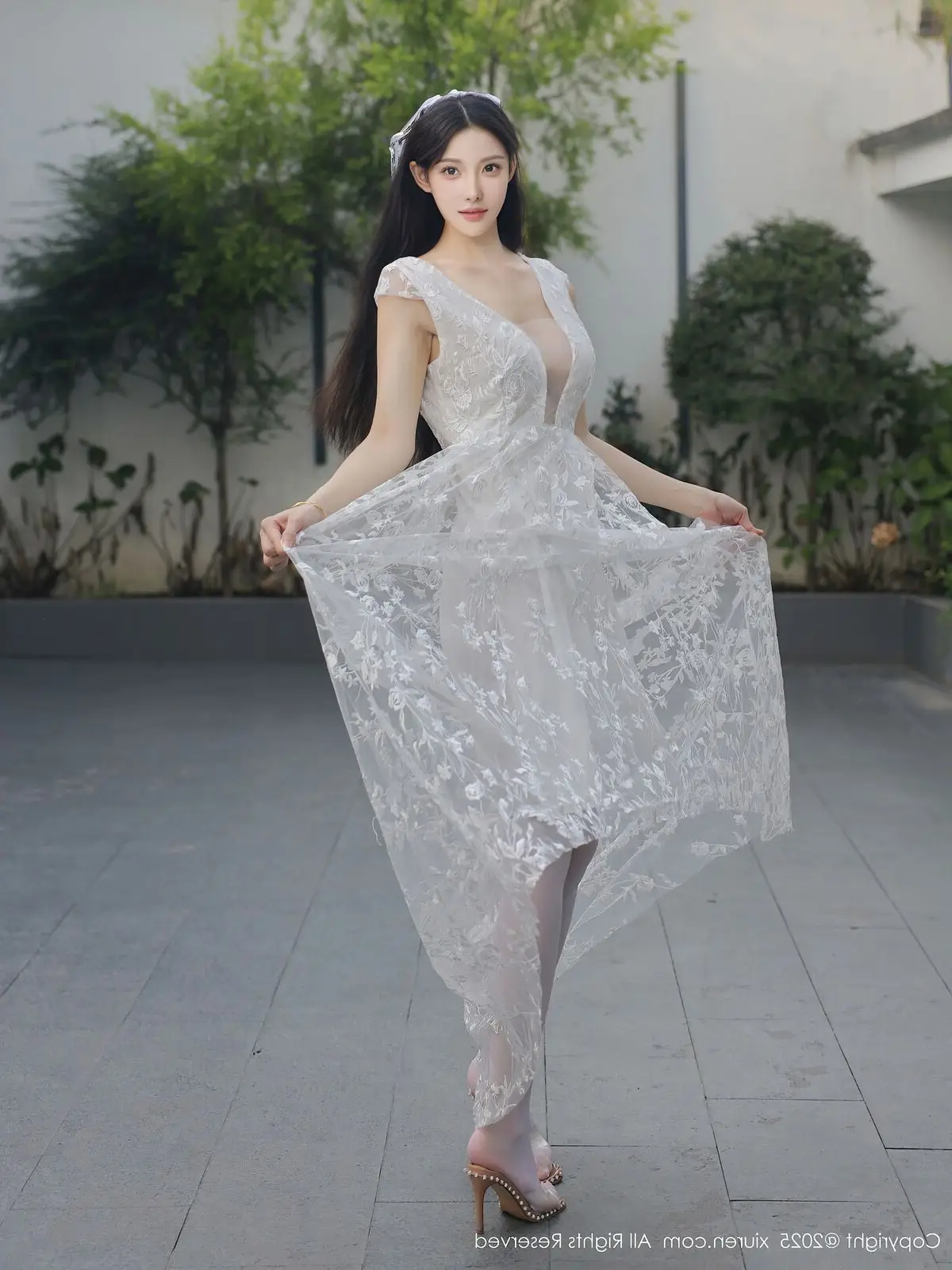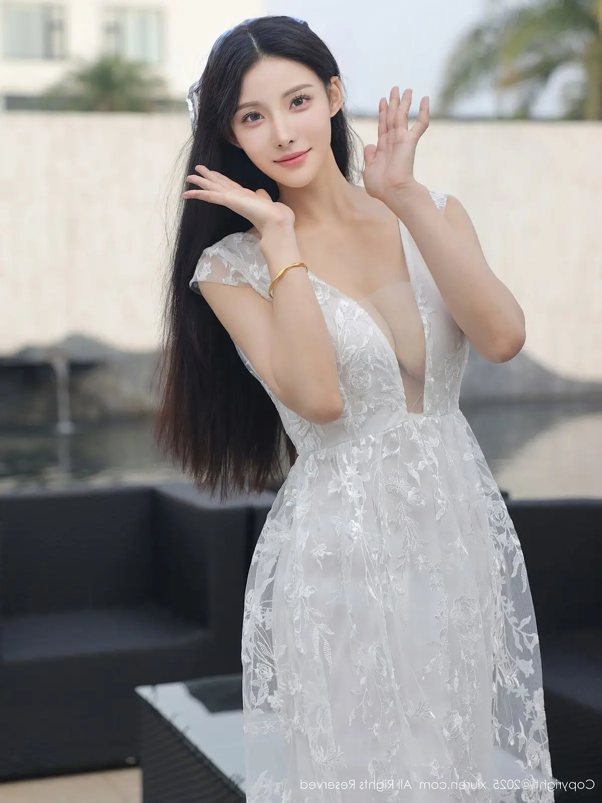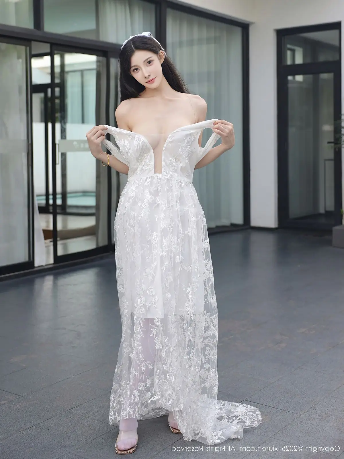 In this captivating XiuRen No.10661 collection model Li Shuang Er showcases her enchanting presence. She gracefully poses in a pristine white gown featuring an alluring design and delicate lace fabric. The flowing dress billows with her every step creating an elegant and refined silhouette. Li Shuang Er's long dark hair gently sways in the breeze highlighting her delicate features and an expressive gaze that draws viewers in. Against a backdrop of modern white architecture and reflective glass her pure beauty truly shines. This harmonious blend of fashion poise and setting crafts an enchanting visual narrative embodying Li Shuang Er's unique blend of allure and sophistication.