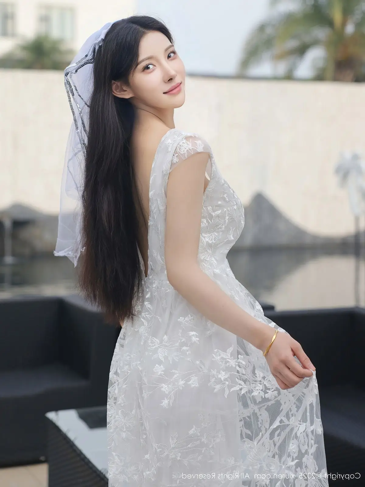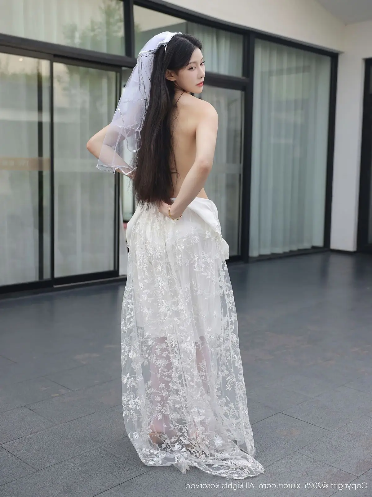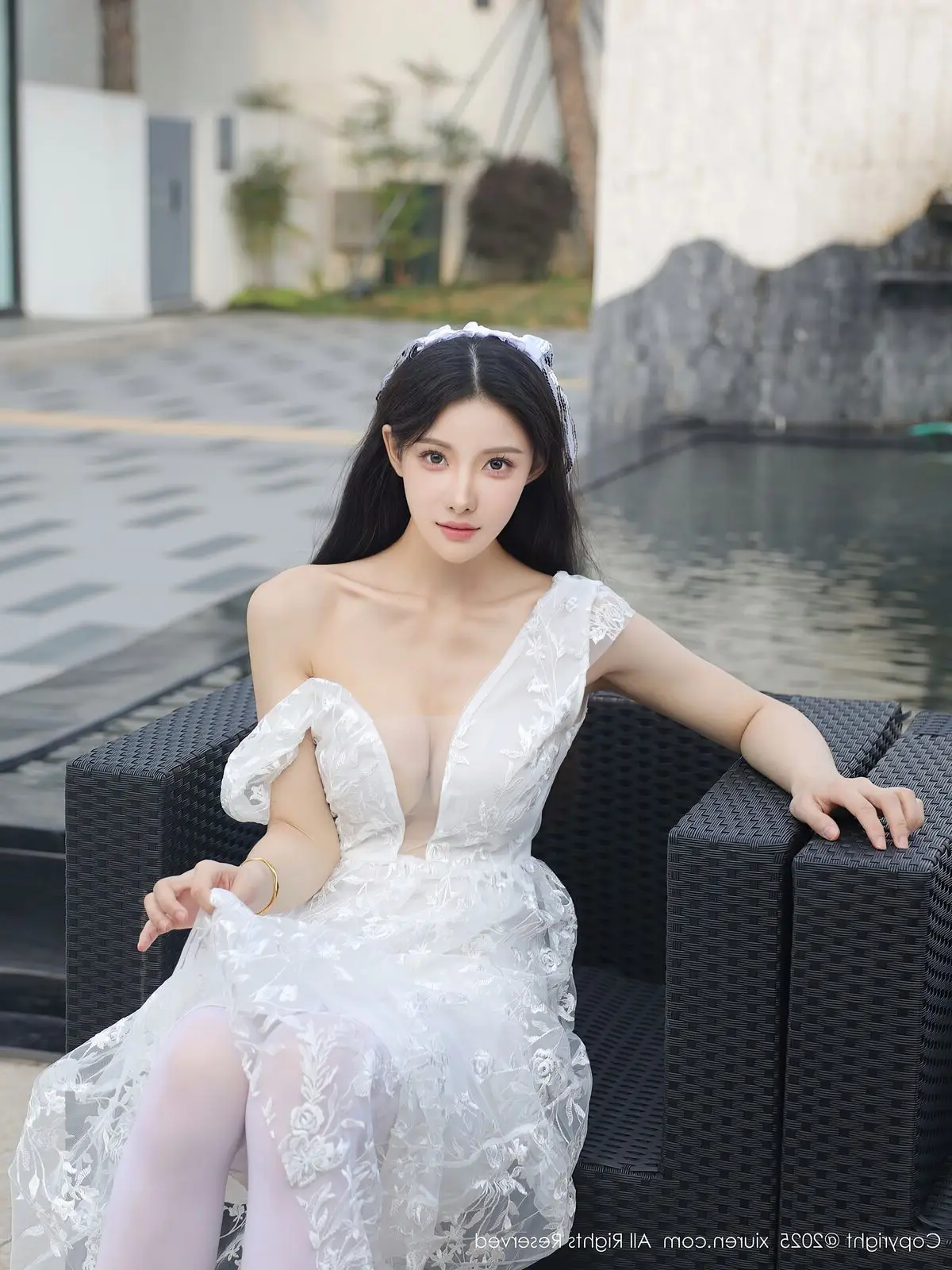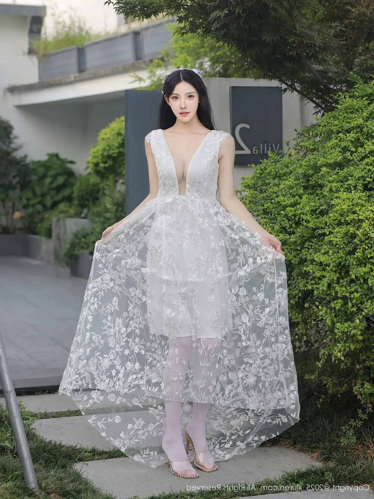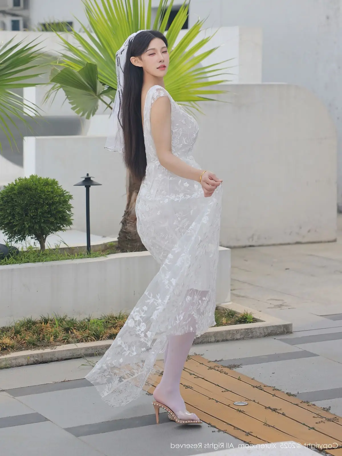 In this captivating XiuRen No.10661 collection model Li Shuang Er showcases her enchanting presence. She gracefully poses in a pristine white gown featuring an alluring design and delicate lace fabric. The flowing dress billows with her every step creating an elegant and refined silhouette. Li Shuang Er's long dark hair gently sways in the breeze highlighting her delicate features and an expressive gaze that draws viewers in. Against a backdrop of modern white architecture and reflective glass her pure beauty truly shines. This harmonious blend of fashion poise and setting crafts an enchanting visual narrative embodying Li Shuang Er's unique blend of allure and sophistication.