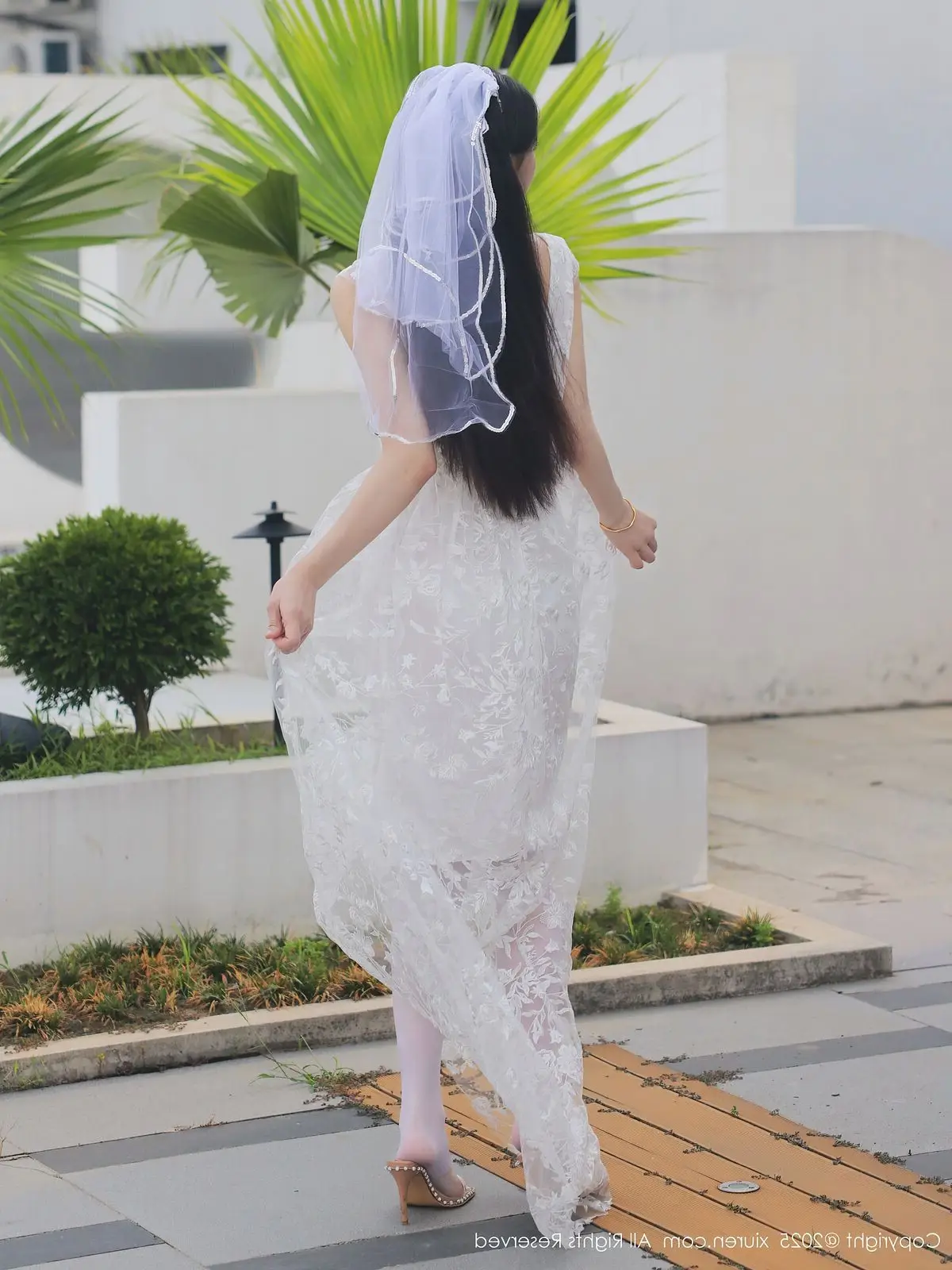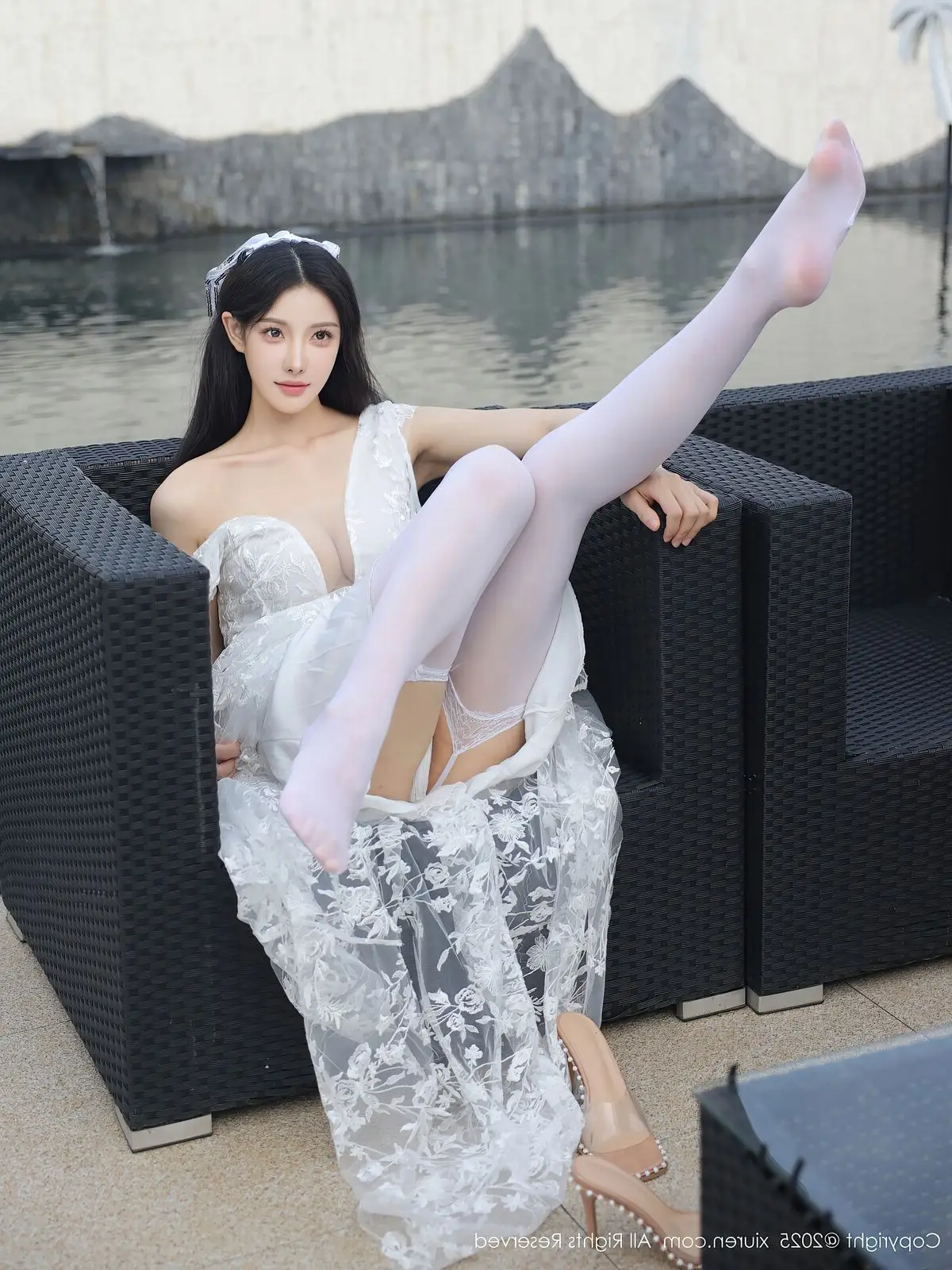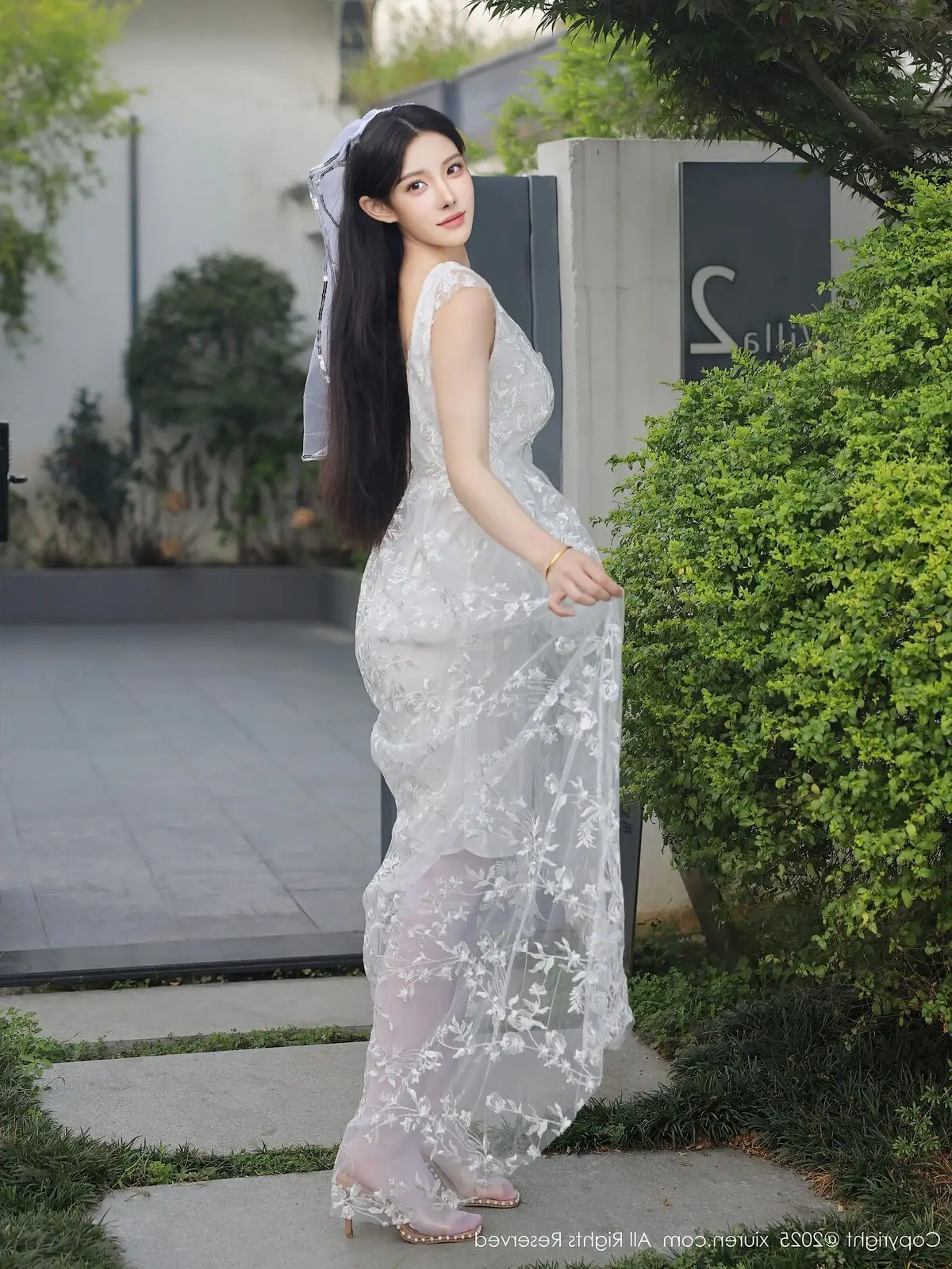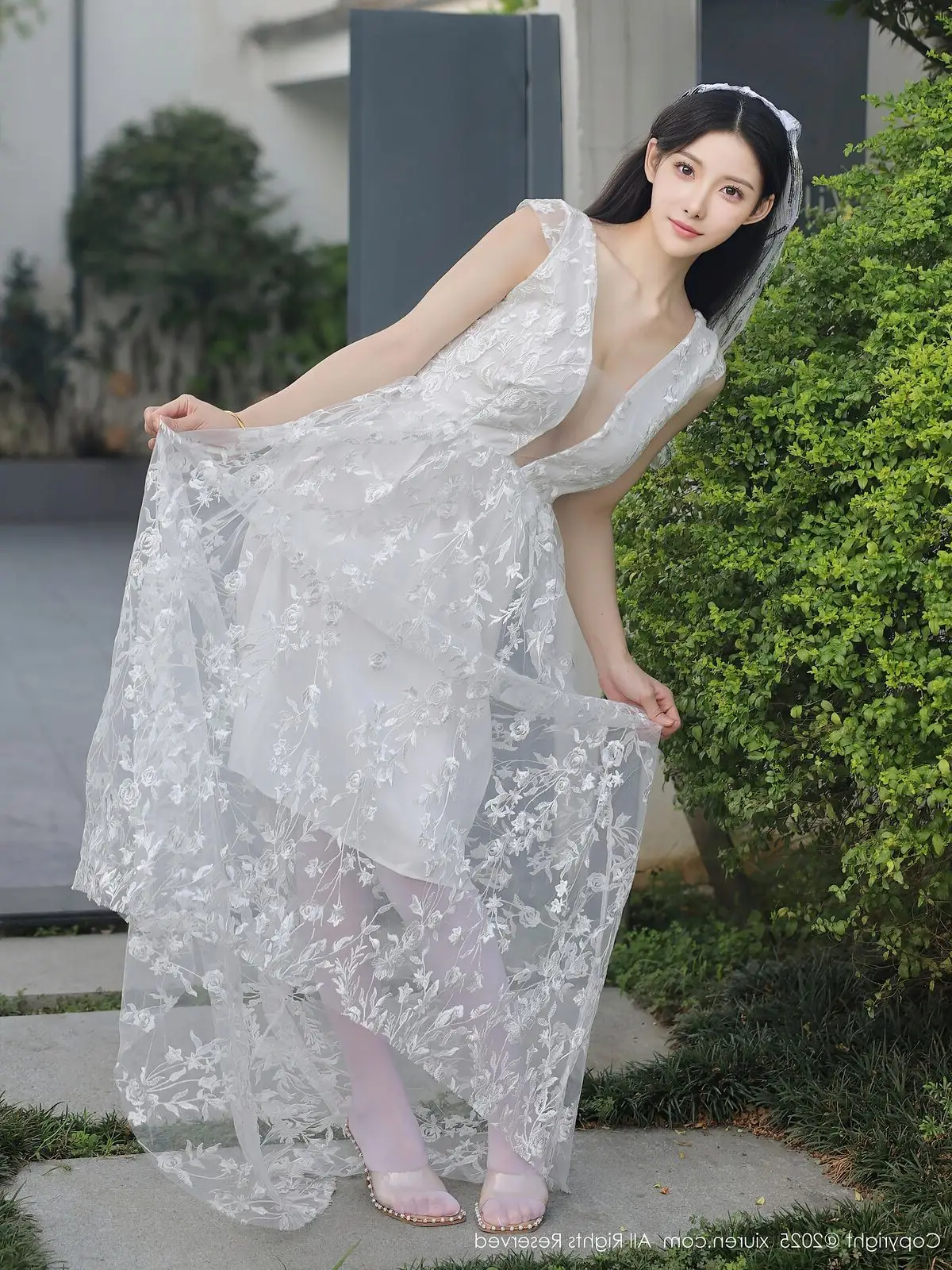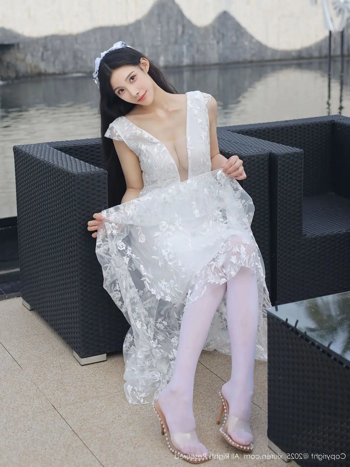 In this captivating XiuRen No.10661 collection model Li Shuang Er showcases her enchanting presence. She gracefully poses in a pristine white gown featuring an alluring design and delicate lace fabric. The flowing dress billows with her every step creating an elegant and refined silhouette. Li Shuang Er's long dark hair gently sways in the breeze highlighting her delicate features and an expressive gaze that draws viewers in. Against a backdrop of modern white architecture and reflective glass her pure beauty truly shines. This harmonious blend of fashion poise and setting crafts an enchanting visual narrative embodying Li Shuang Er's unique blend of allure and sophistication.